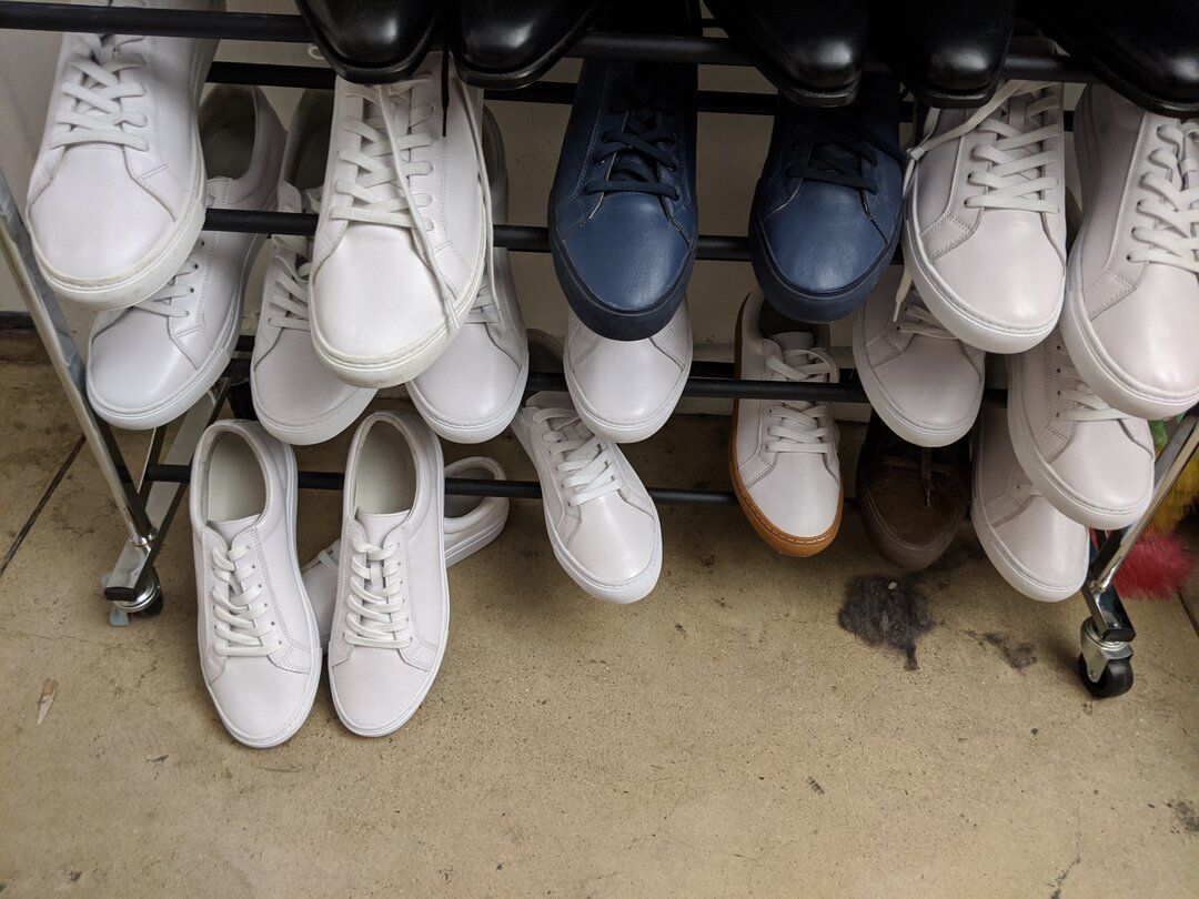 Dress shoes and sneakers. NOte the stain on the right side of the floor. They're not focusing on presentation here. They're banking on the theory that quality speaks for itself.