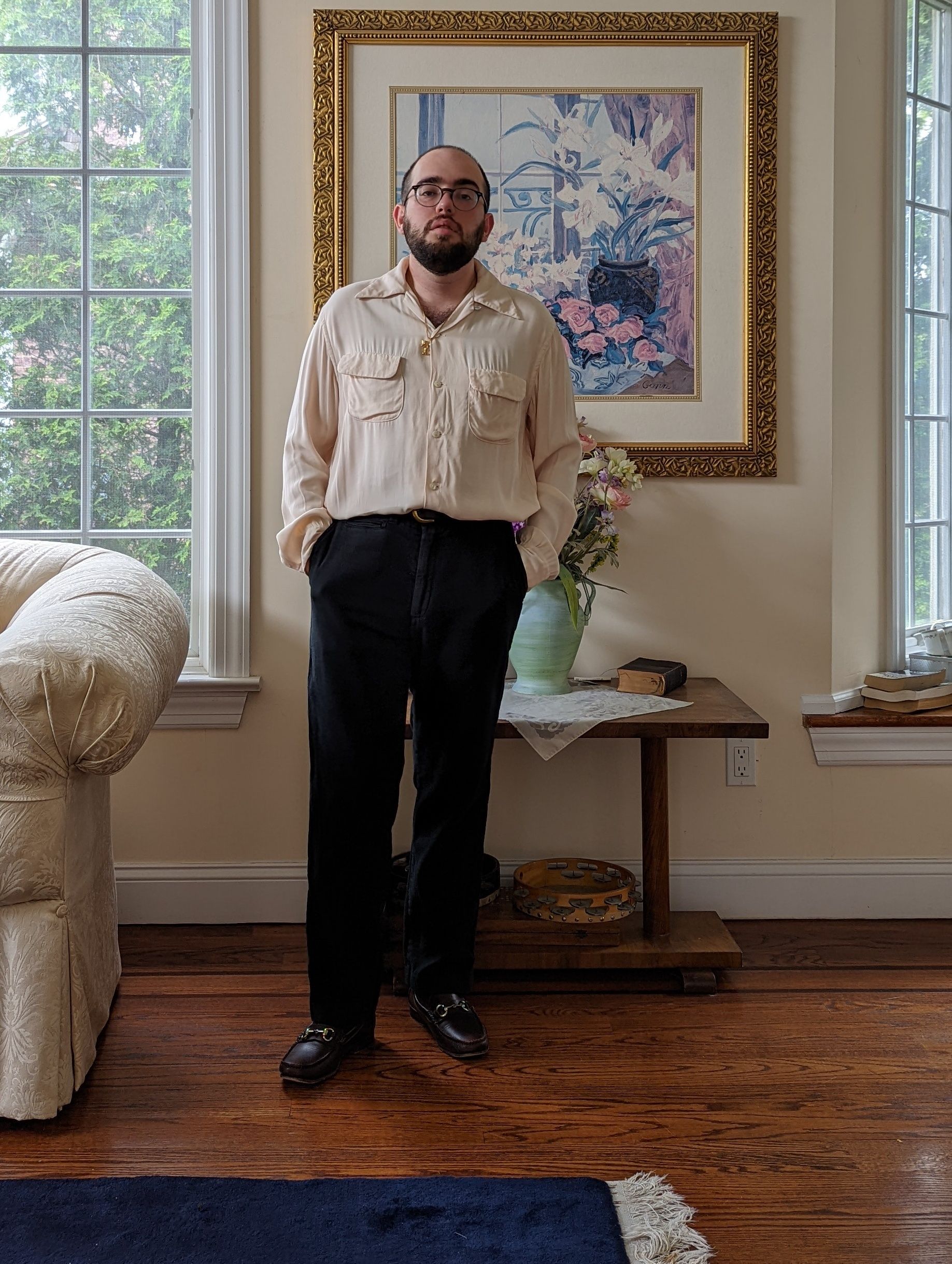 My own outfit, for the warm weather. I was looking for a chance to wear the Bryceland's cream rayon shirt. The shirt looks... really wrinkly here... Because I bought it used, and I got it cheap because it was super wrinkled. I steamed it, but it really needs an iron. Oh well, it still feels like rayon gabardine.