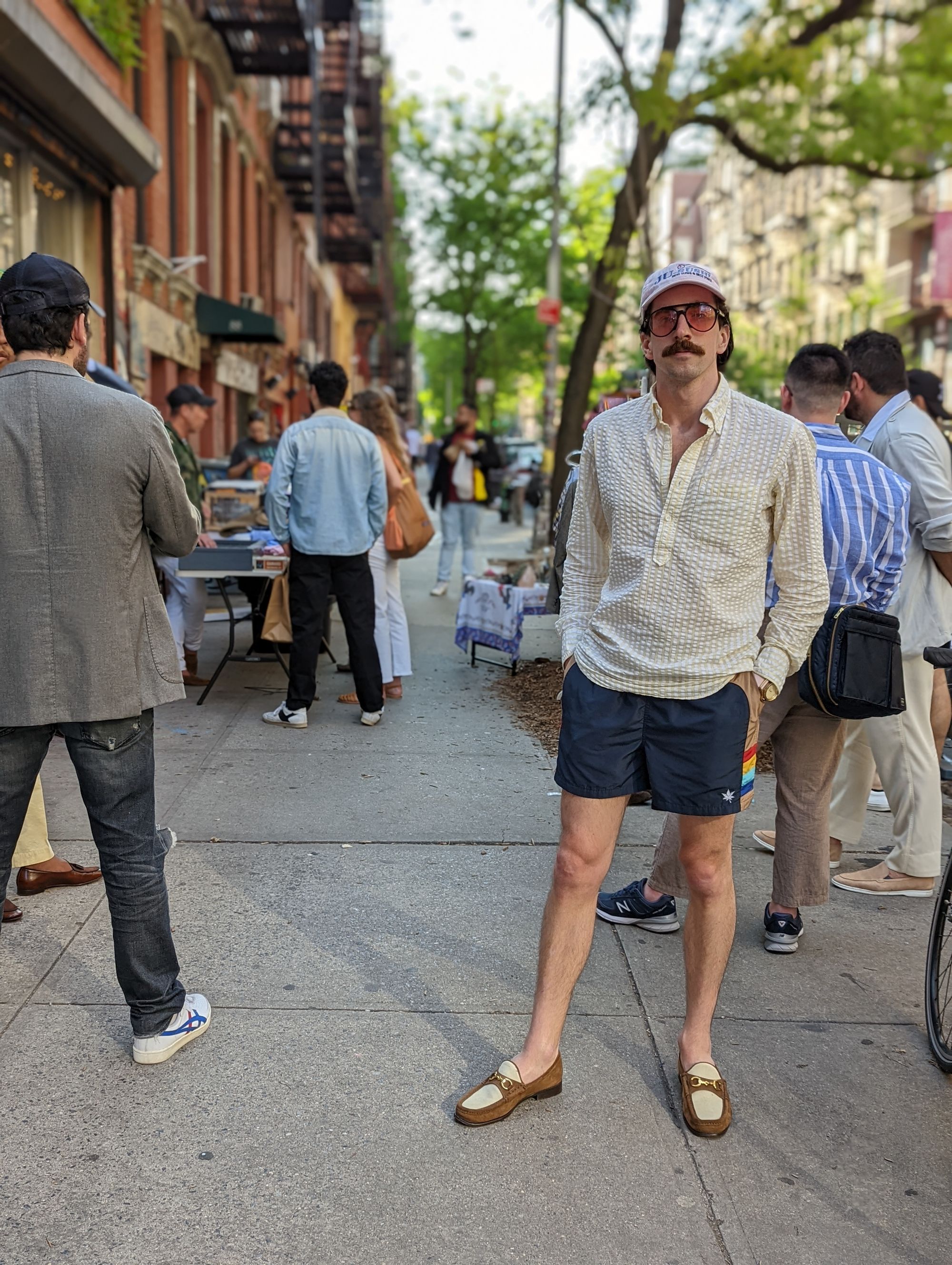 The two-tone horsebit loafers come from Horatio. He executed this whole stache, sunglasses, shorts and loafers vibe perfectly, didn't he?