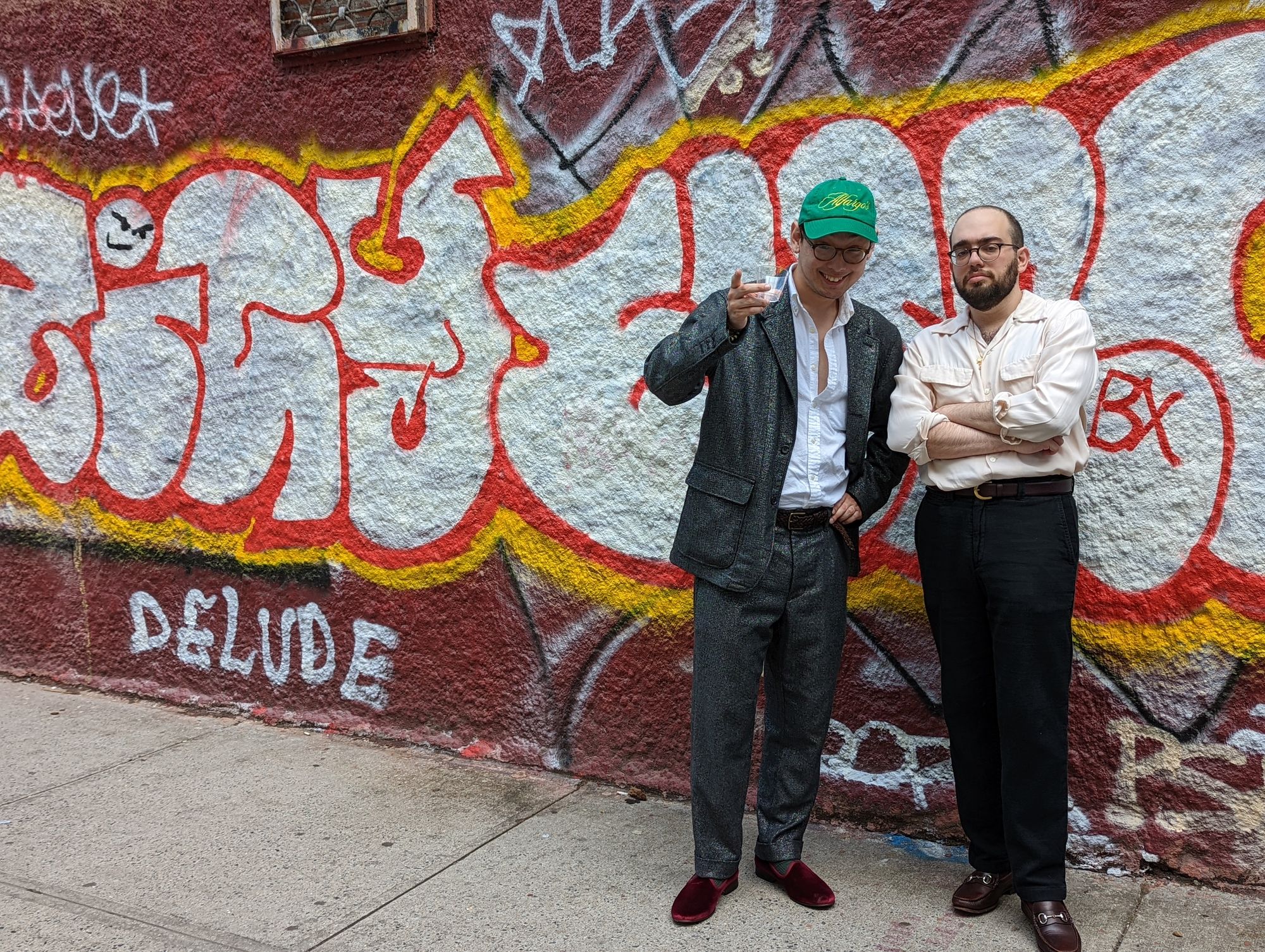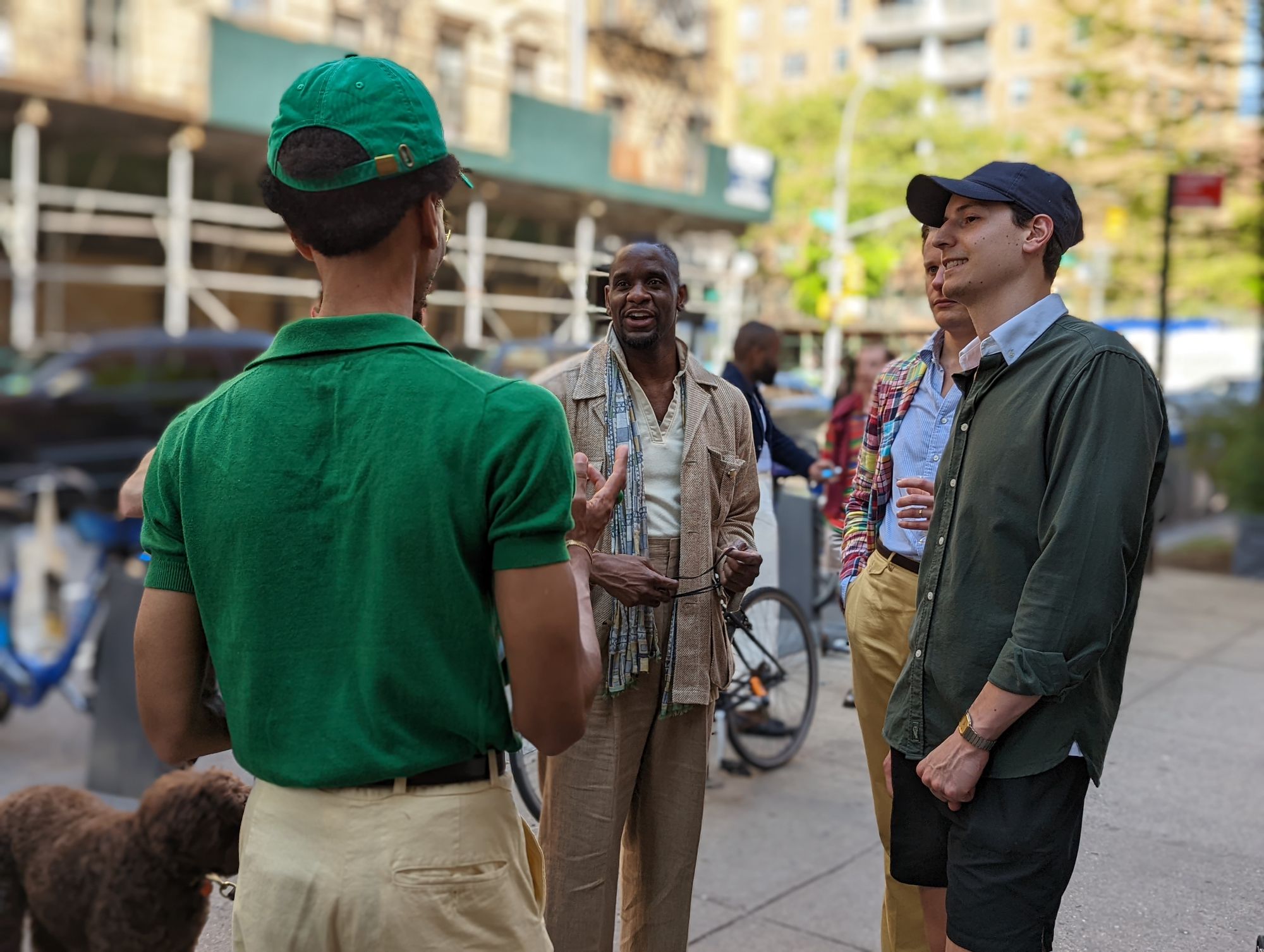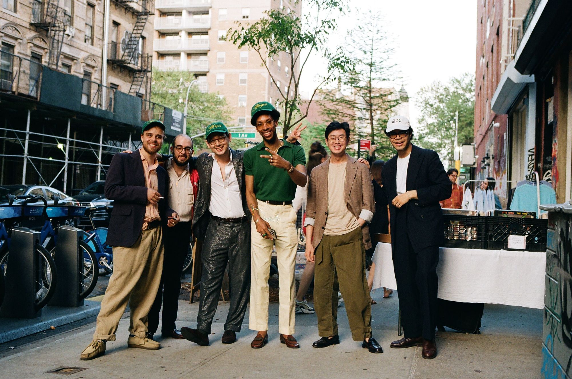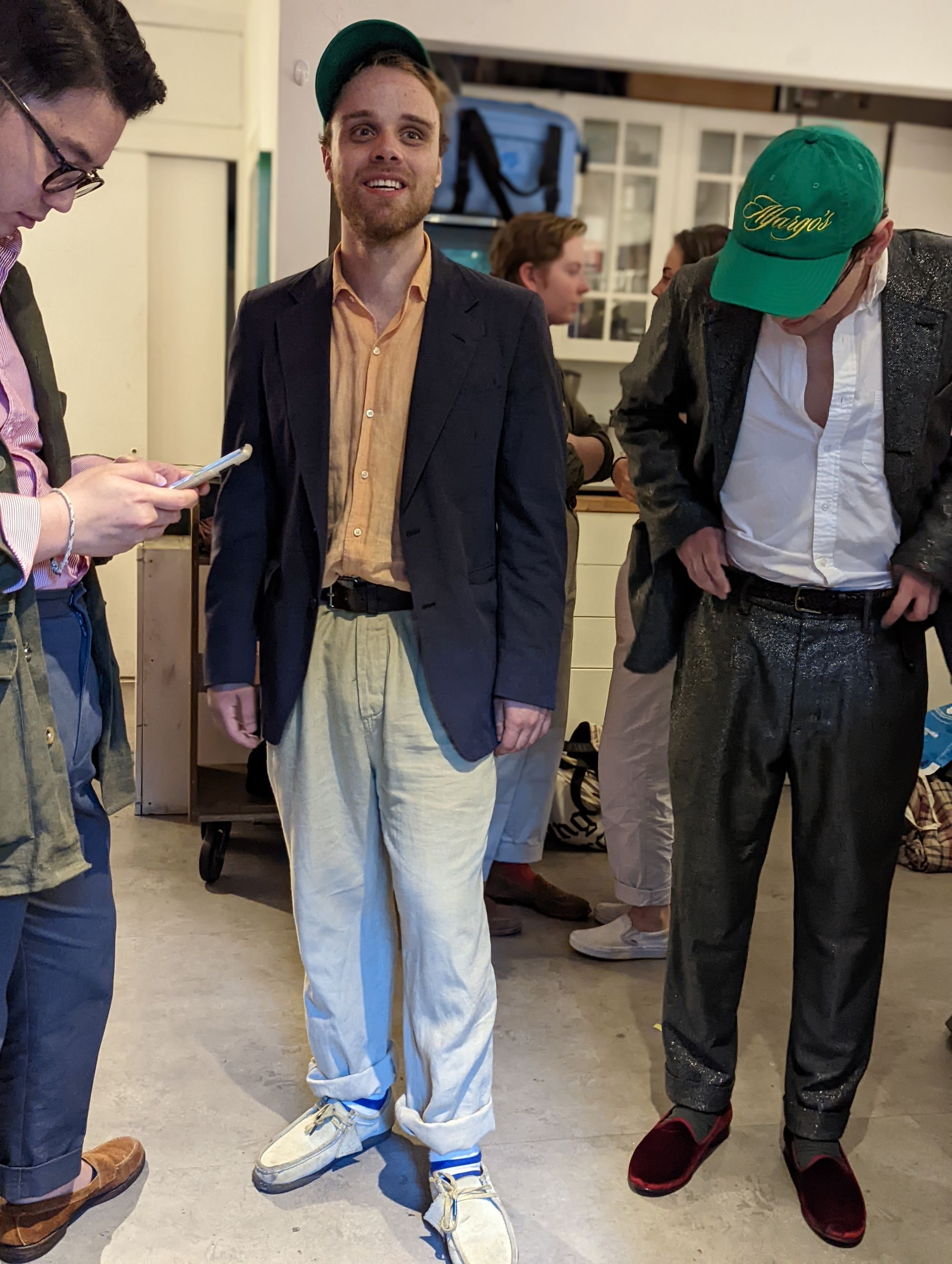 I didn't speak with the guy all the way on the right, but the guy hiding behind him, Eric, is not a Winklevoss, but is in fact, a genuinely cool dude who just happens to like madras jackets. He's also a menswear writer for Robb Report and Inside Hook, having written articles like... this one about Alfargo's Marketplace.