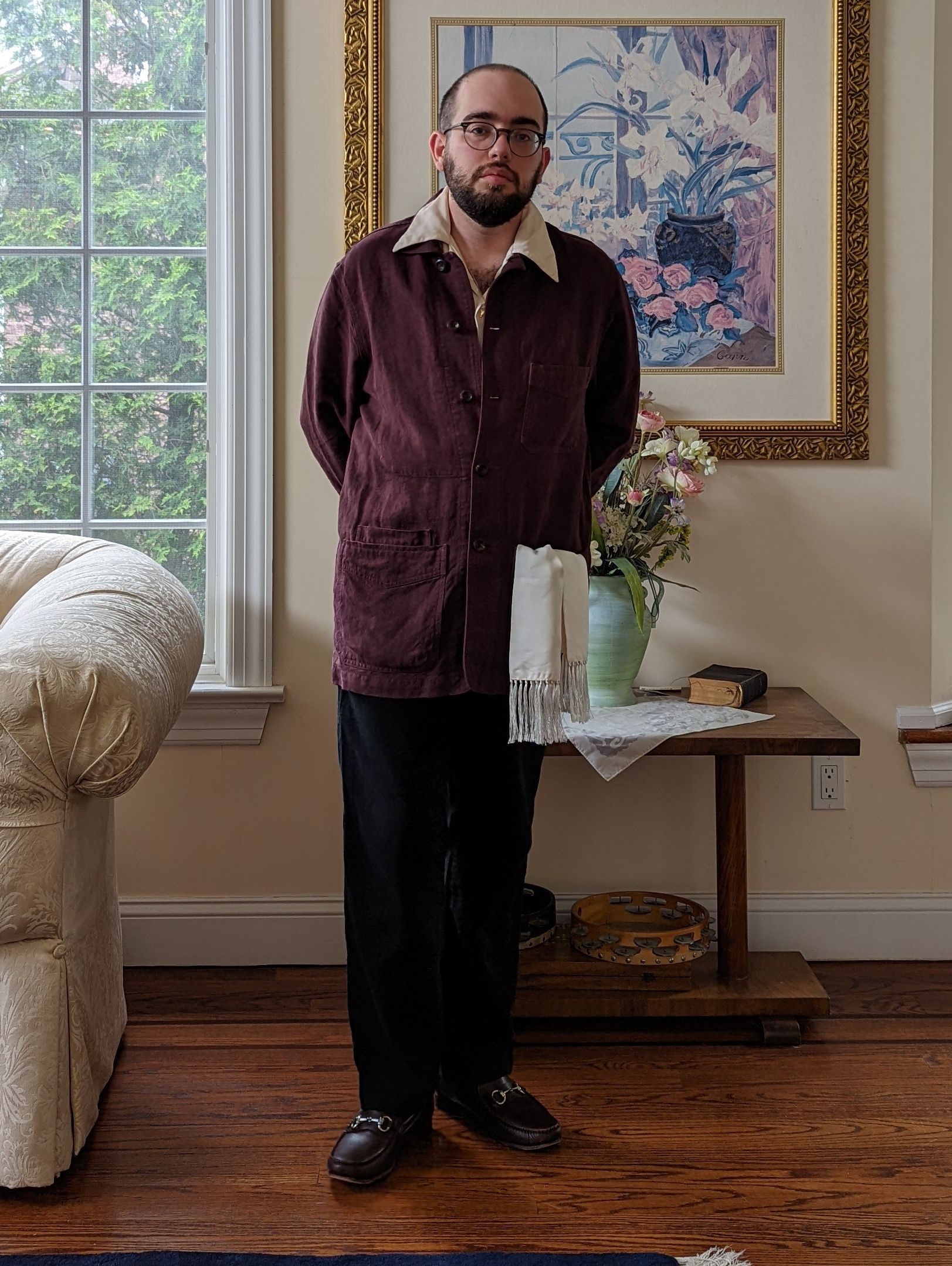 On the left, I wore a Drake's linen chore coat with a silk scarf from SuitSupply in the front left pocket. I liked the look, but the chore coat is heavy and... actually had me sweating, so that came off fast.