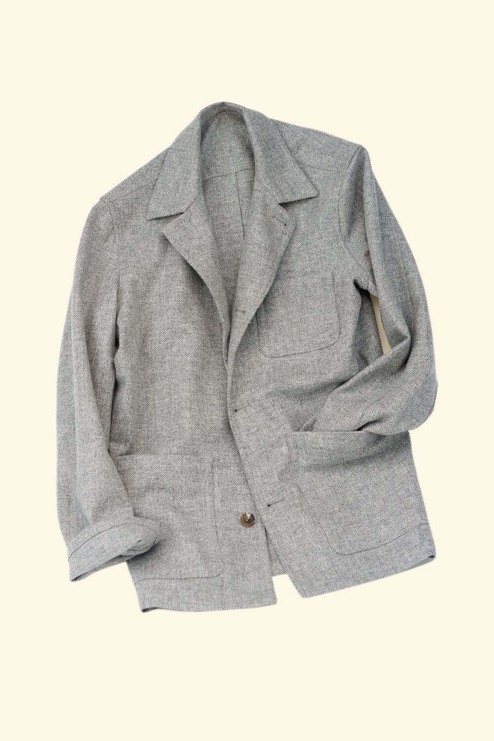 Left: A classic Spanish Teba jacket (not made by The Anthology). The platonic ideal of a Teba jacket involves a notchless lapel, three or four button closure, straight hem, three patch pockets with flaps, and a single button cuff. Right: Buzz in The Anthology's Navy/Teal Bouclé Lazyman Jacket, also with straight hems, but with a three-roll-two closure, three patch pockets without flaps, a notch-like lapel similar to a camp collar, and buttons on the back to tighten the jacket as needed. Both jackets are unstructured, both lapels roll high, and both jackets fill the roll of something blazer-adjacent but obviously more casual.