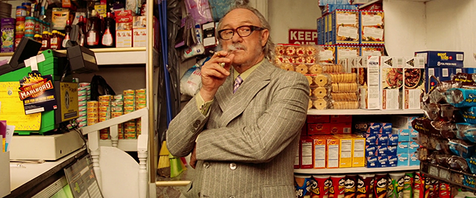 Not only does this reflect past wealth, it helps code him as a grandfather. His attire is stale vintage. His tweed overcoat is something only old men wear. He has been living in a hotel for some time now, perhaps in stasis. He hasn't changed, and he certainly hasn't had spare cash for new clothing.