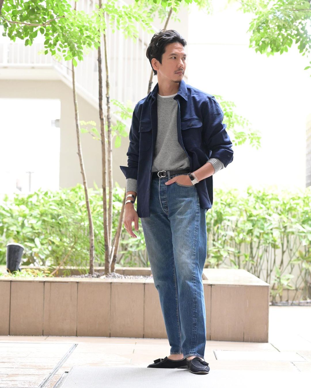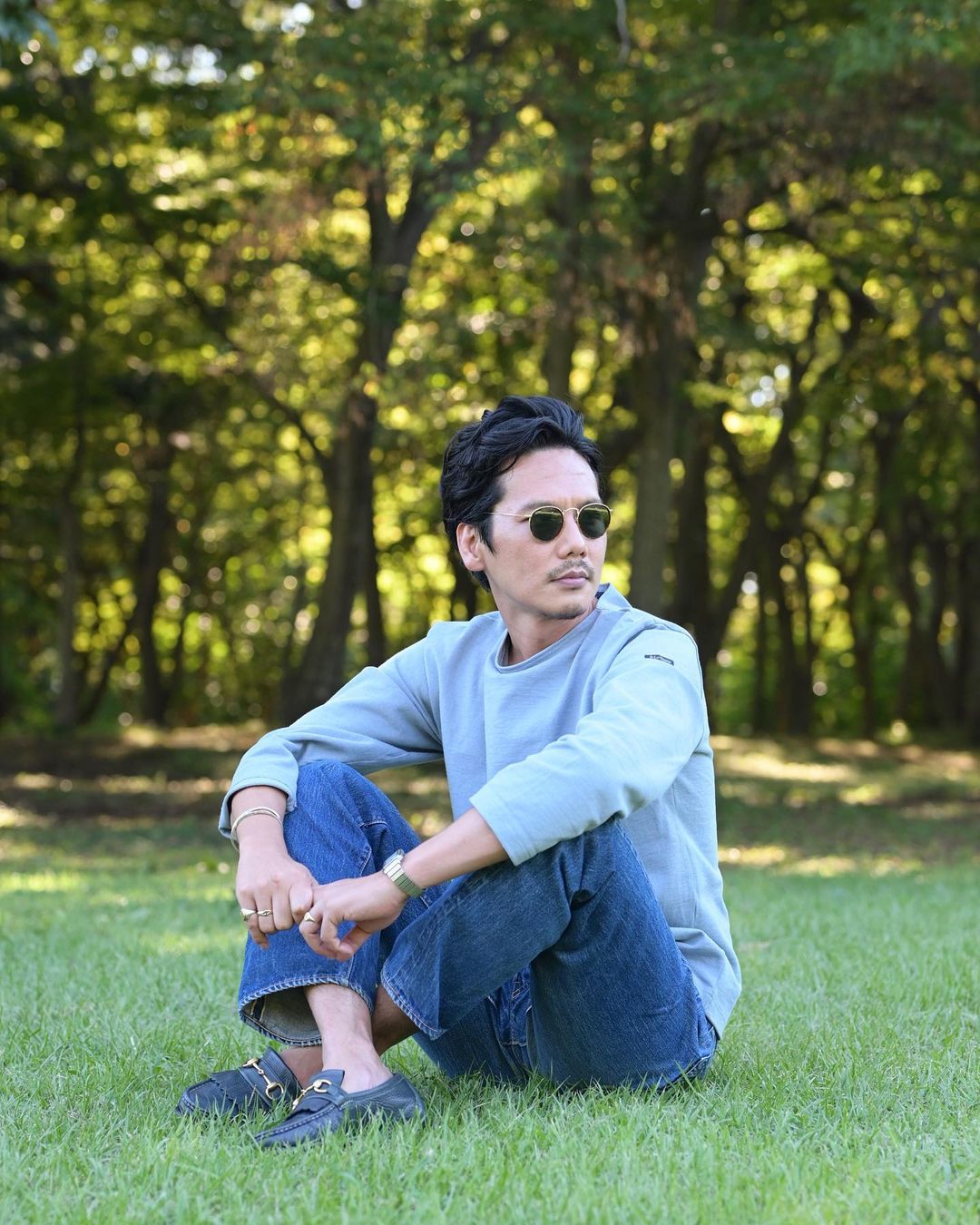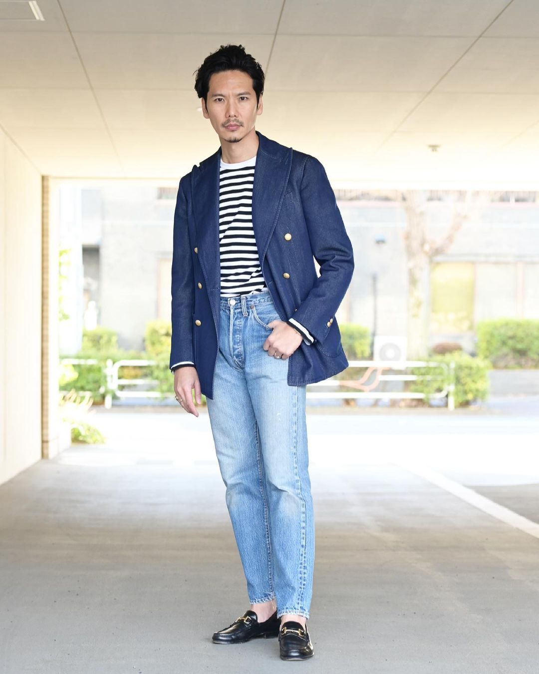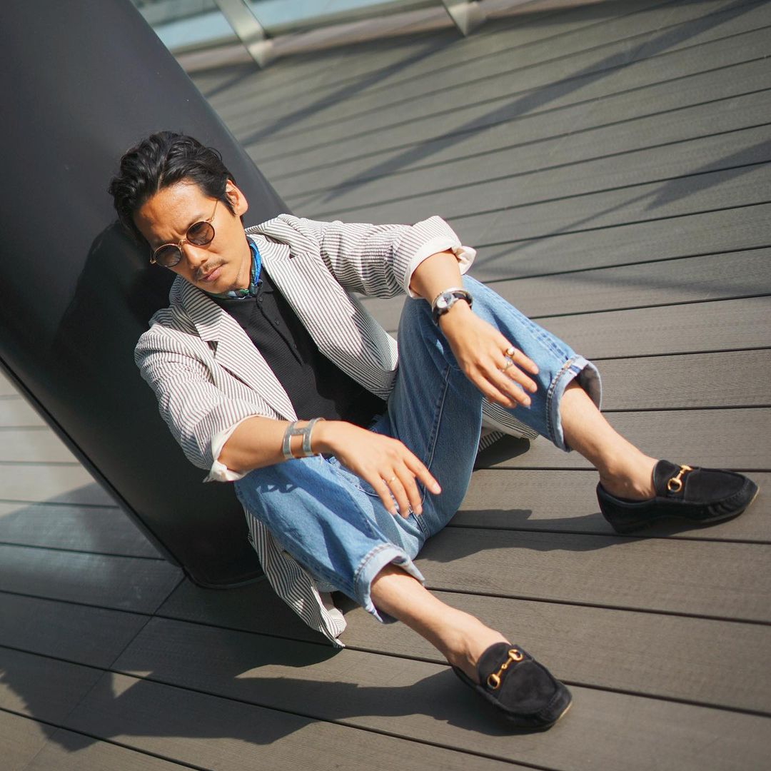 Shuhei Nishiguchi has a few different pairs of black horsebit loafers. Here, he dresses them down—denim, tee shirts or knits... Even when he's wearing a blazer, he looks distinctly relaxed.