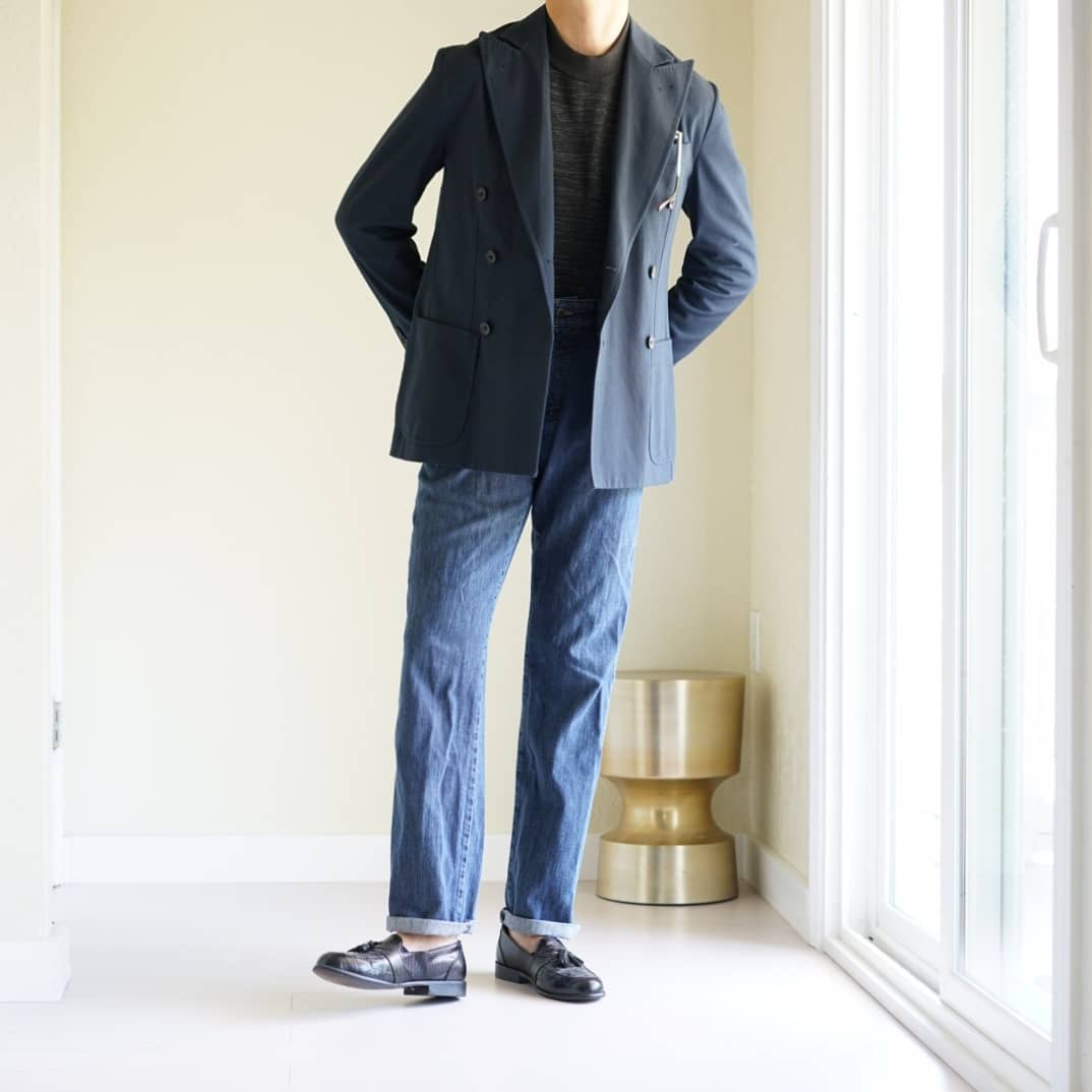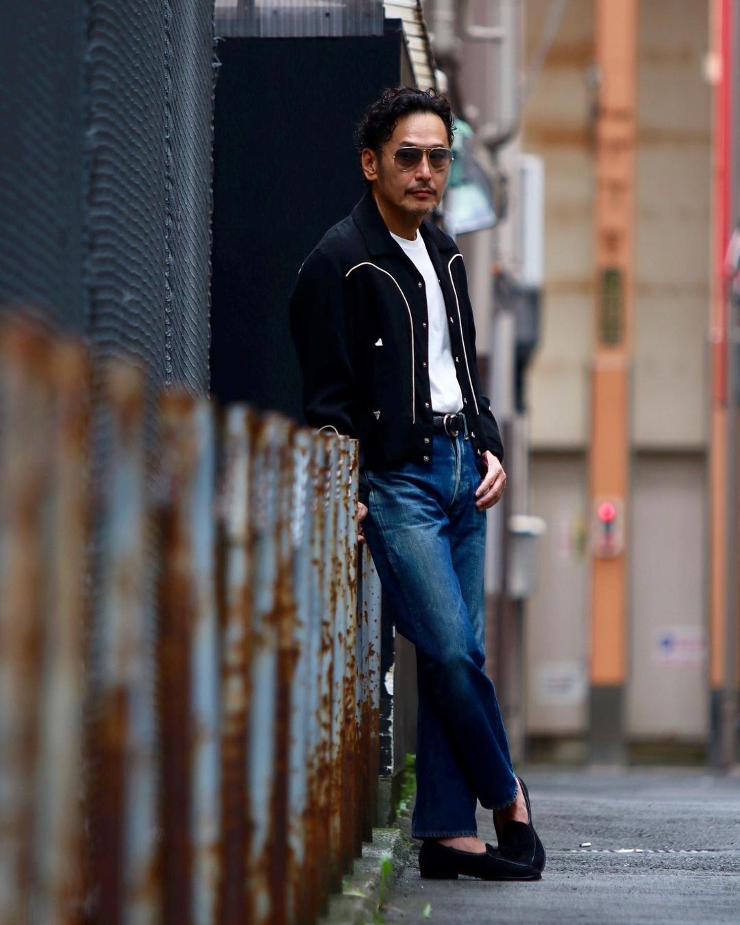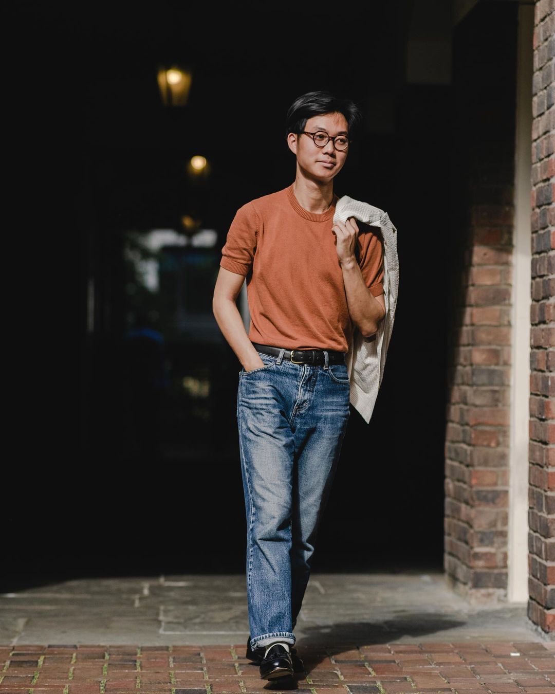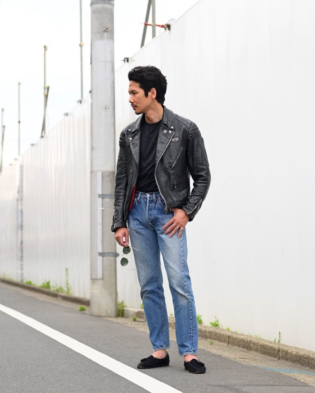 Shuhei Nishiguchi has a few different pairs of black horsebit loafers. Here, he dresses them down—denim, tee shirts or knits... Even when he's wearing a blazer, he looks distinctly relaxed.