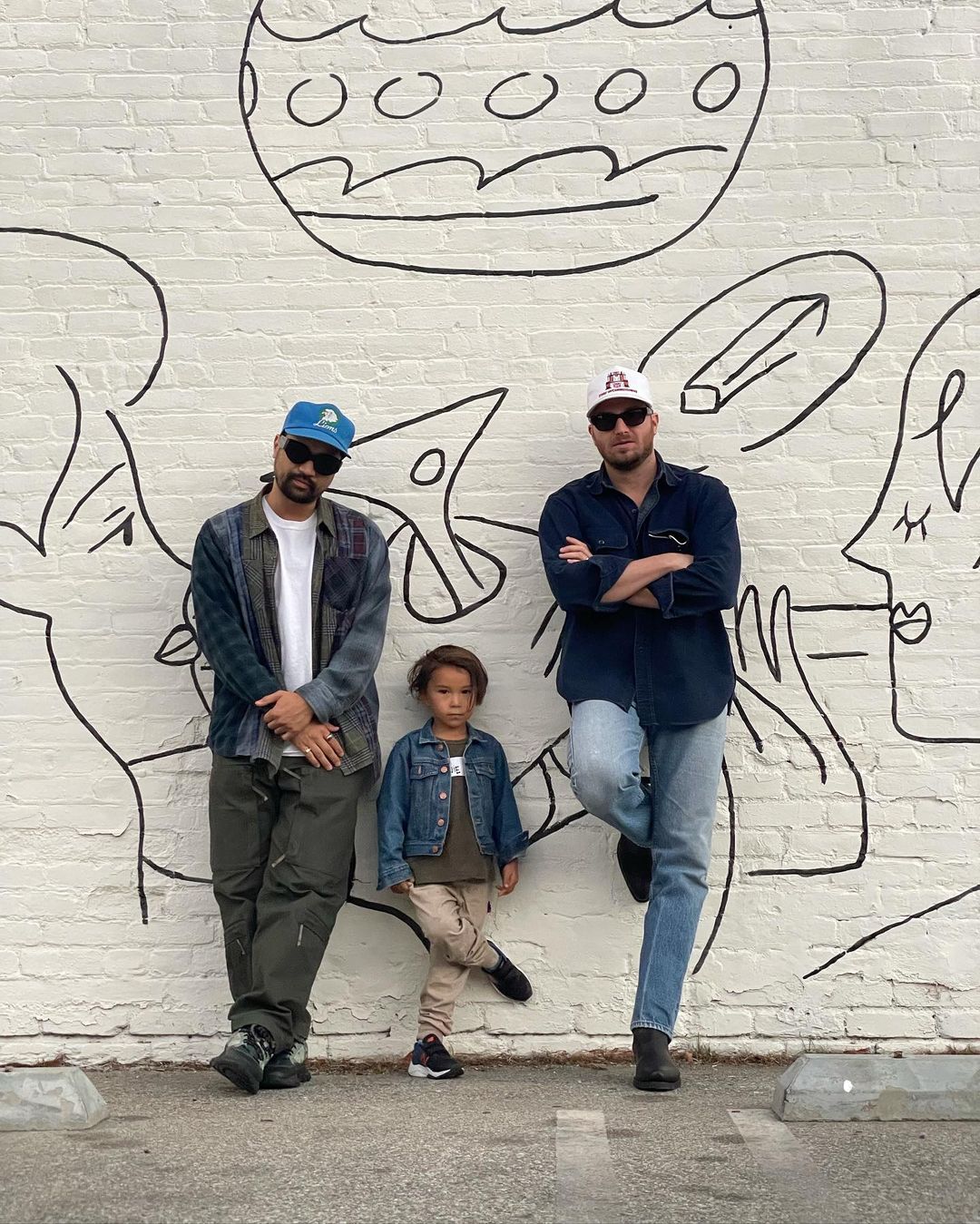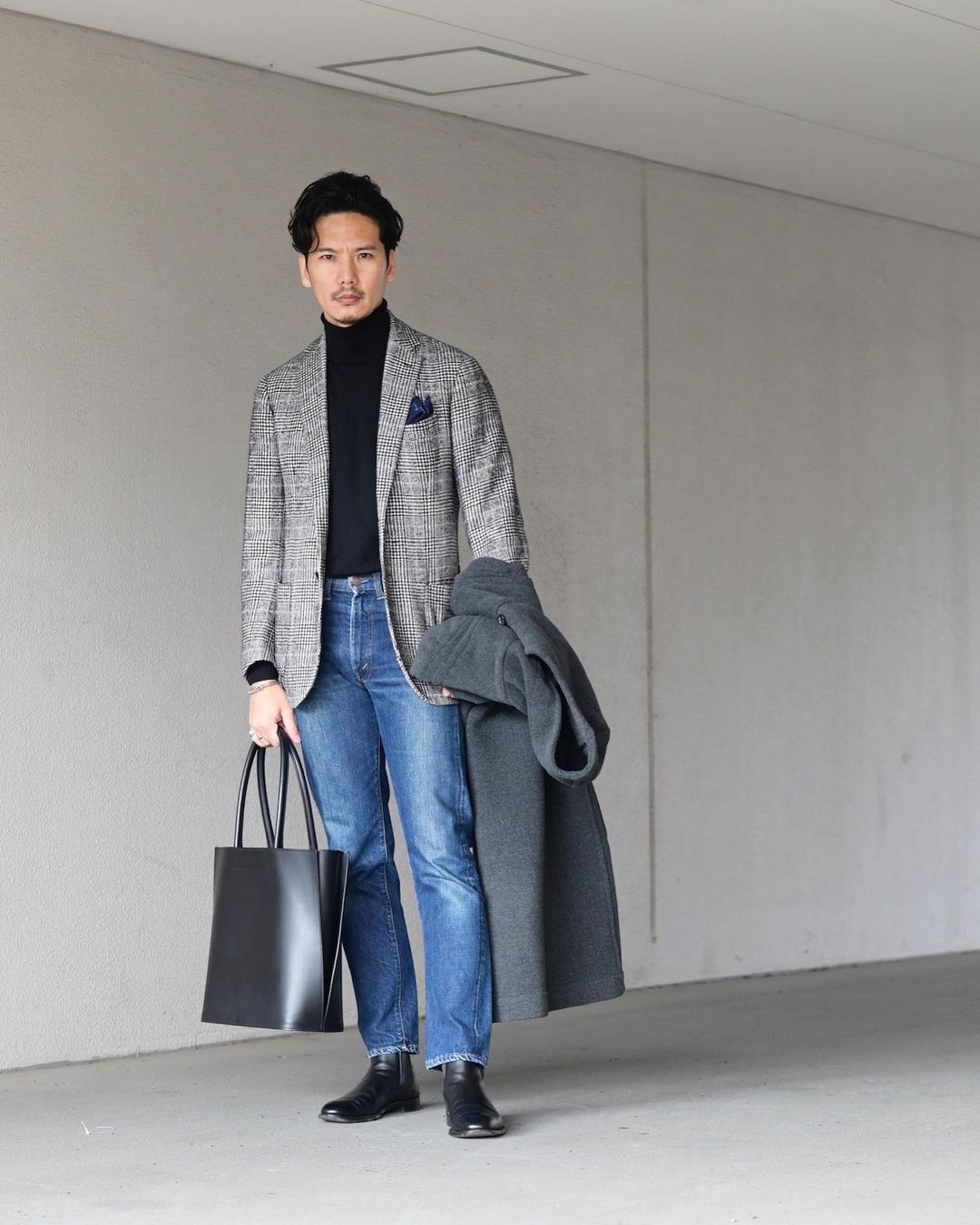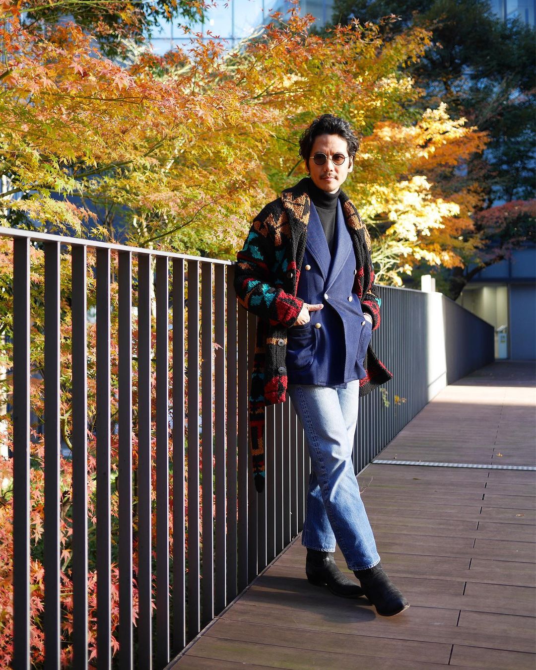 Notice Shuhei's black turtleneck below. He's not afraid to add colorful layers on the right, or gray on the left.