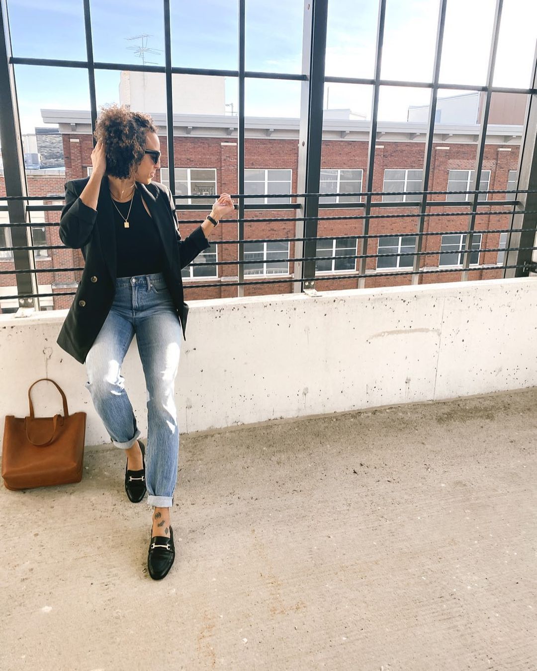 Black and Blue: Mid-Light Denim with Black Slip-Ons