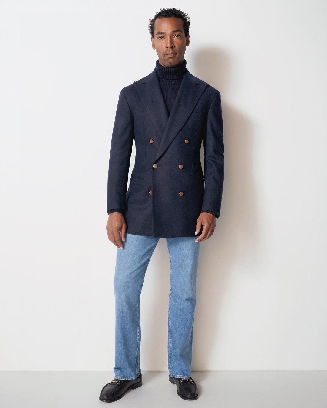 Again, similar elements – see the black turtleneck – but very different vibes, as reflected in the backgrounds. Suede chelseas on the right, and a beautiful cardigan over the blazer.