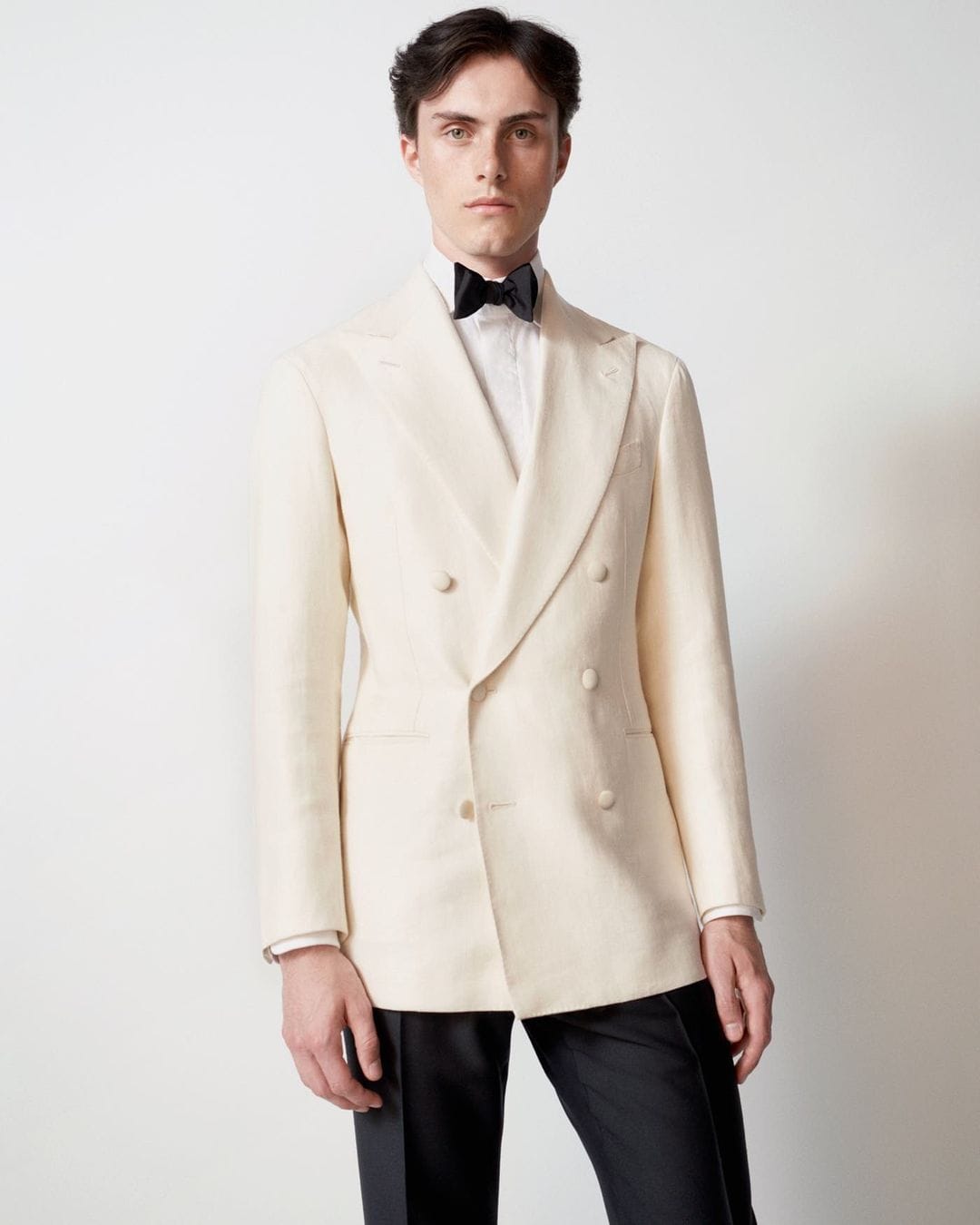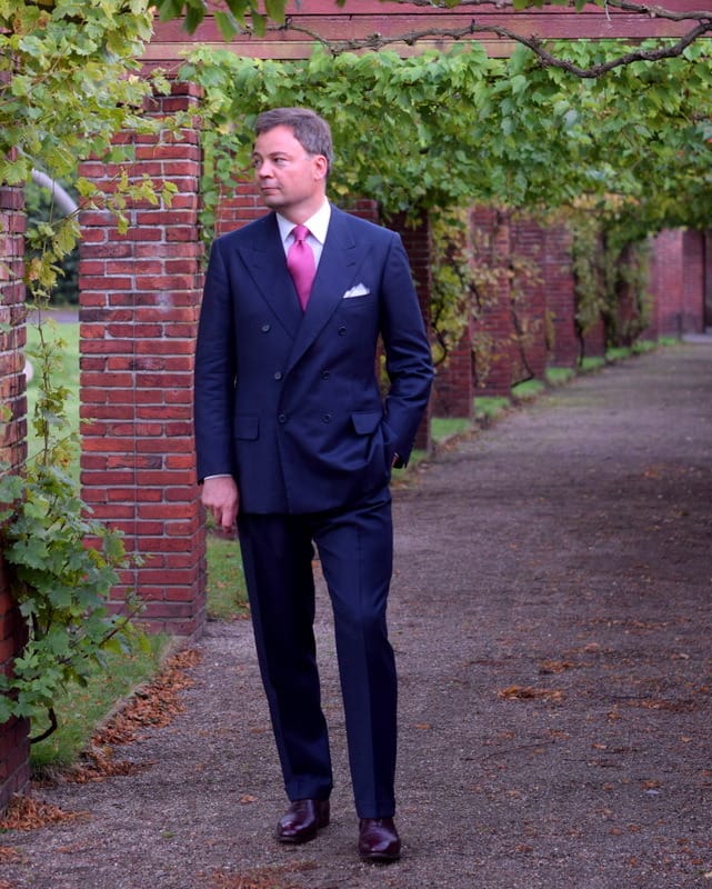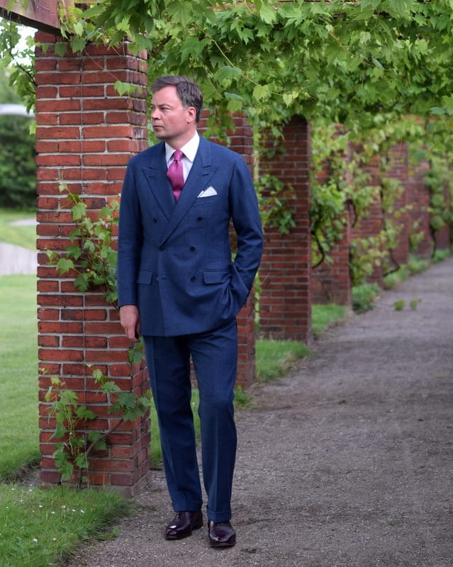 The 6x1 was developed more recently by Frederick Scholte, tailor often credited with inventing the British drape cut. The style has been carried forward famously by Cifonelli. They realized that by lowering the buttoning point, you can elongate the lapel line, make the lapel line more vertical, and lower the nexus to show more shirt and more tie, while maintaining the distinct charm of a double breasted jacket.