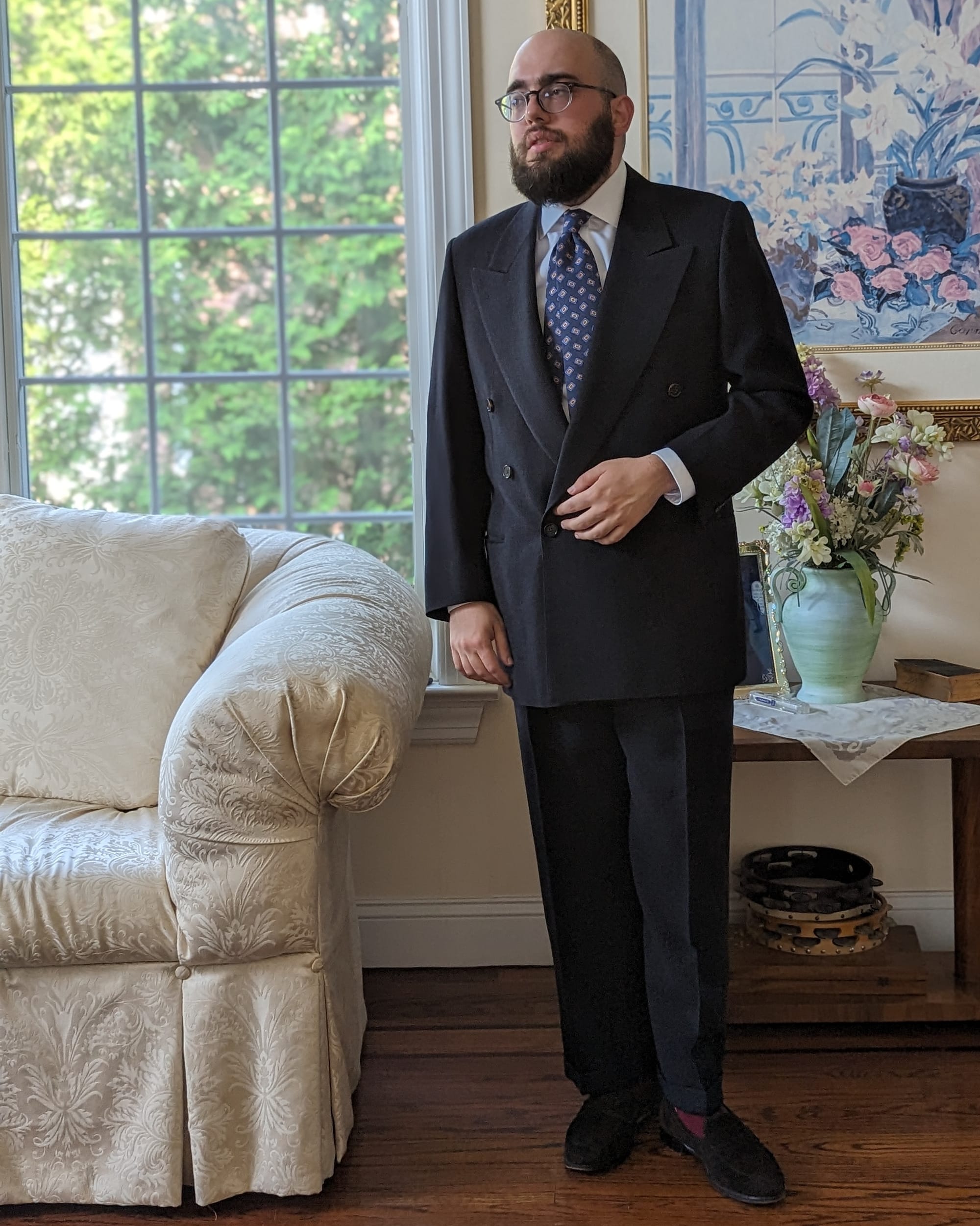This format was most popular during the so-called "Golden Era," the 1930s and 40s, at least until fabric rationing started to affect what men actually wore. Although the buttoning point is roughly halfway down the jacket, the lapels ultimately cross one another higher up, revealing relatively little shirt while the jacket is closed. The silhouette reflects the classic proportions of a two-button single-breasted, but the jacket takes up a larger portion of the outfit; the nexus point might be 1/3 of the way down the jacket, or higher, or lower.