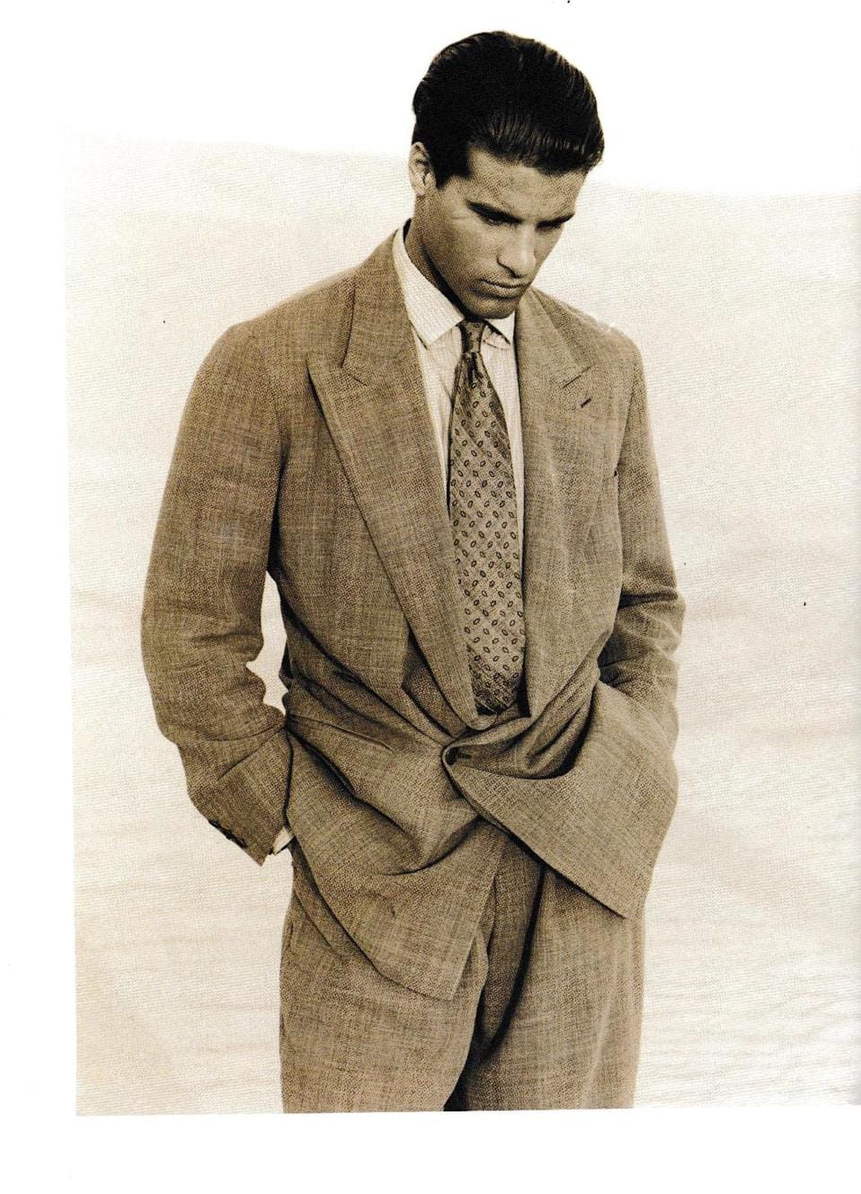 The format was popularized in the mid-80s, partly by Ralph Lauren—more on that in a bit—but largely by Giorgio Armani. Armani's cuts were intentionally long, unstructured, and relaxed, with fabrics meant to highlight a certain louche, slouchy drape.