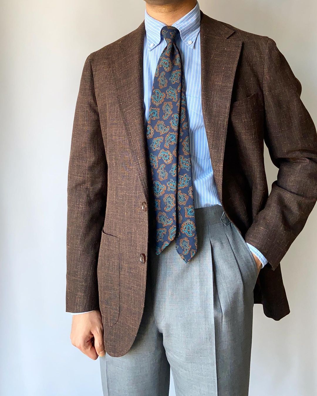 In an article in the Styleforum Journal, Ethan Wong associated brown with tweeds, and expressed enthusiasm for mid-brown checks in blazers as a way to branch out from the basic solid navy. He also gave a shout-out to Wool-Silk-Linen blends, which absolutely appear in this article.