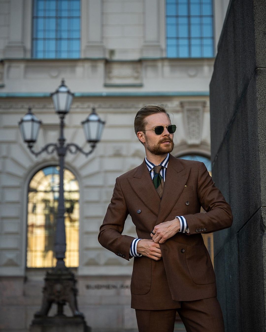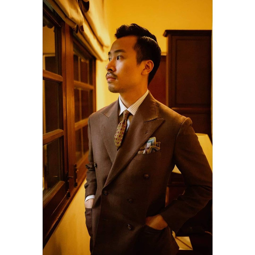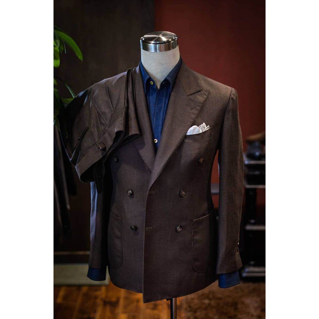 What stands out in the suits below is their choice of black buttons. Again, black contrasts beautifully with brown, and the idea that it doesn't is a scam perpetrated against you by stuffy British assholes from some decades ago. They highlighted this choice on their instagram, and they were right to do so. Definitely consider your button choices carefully.