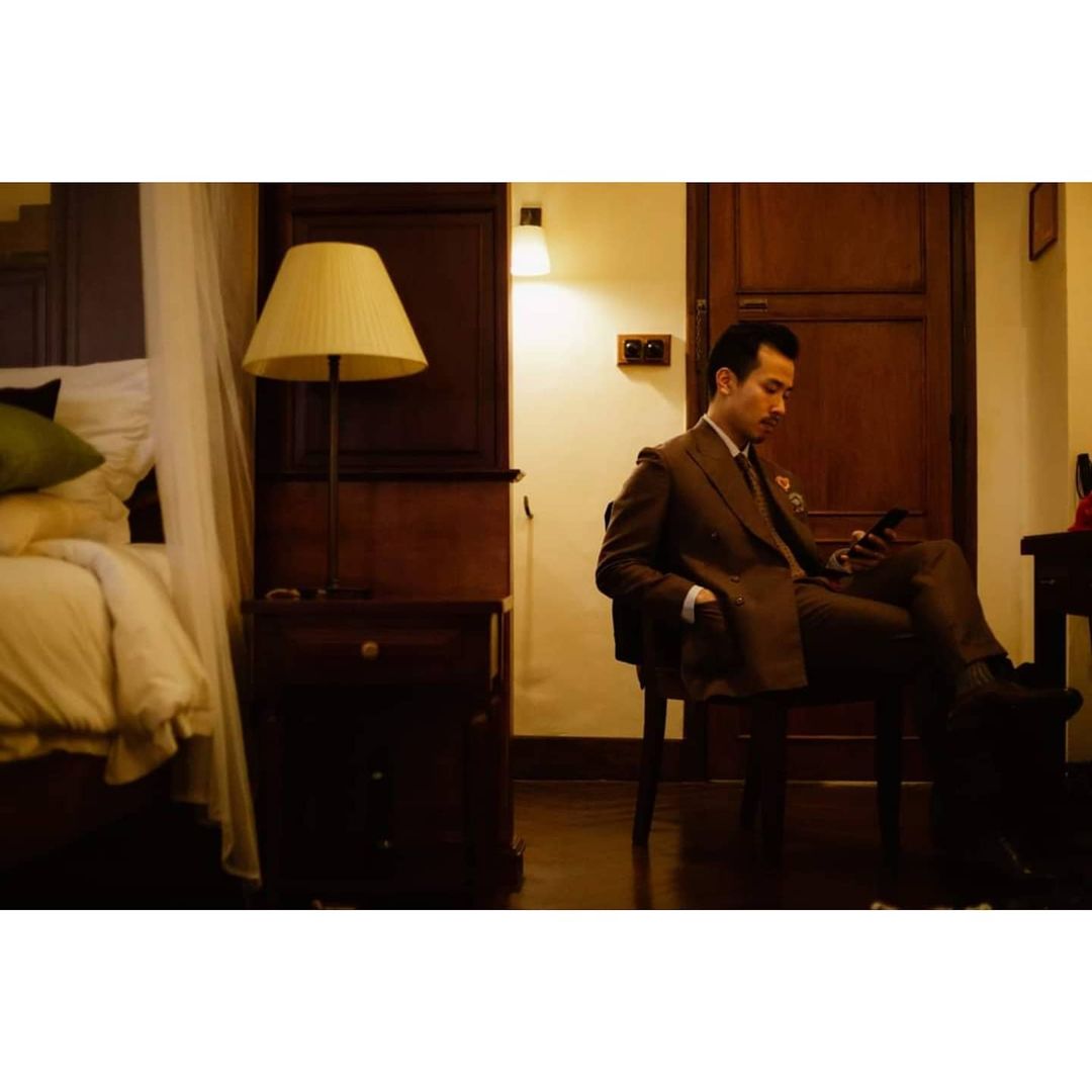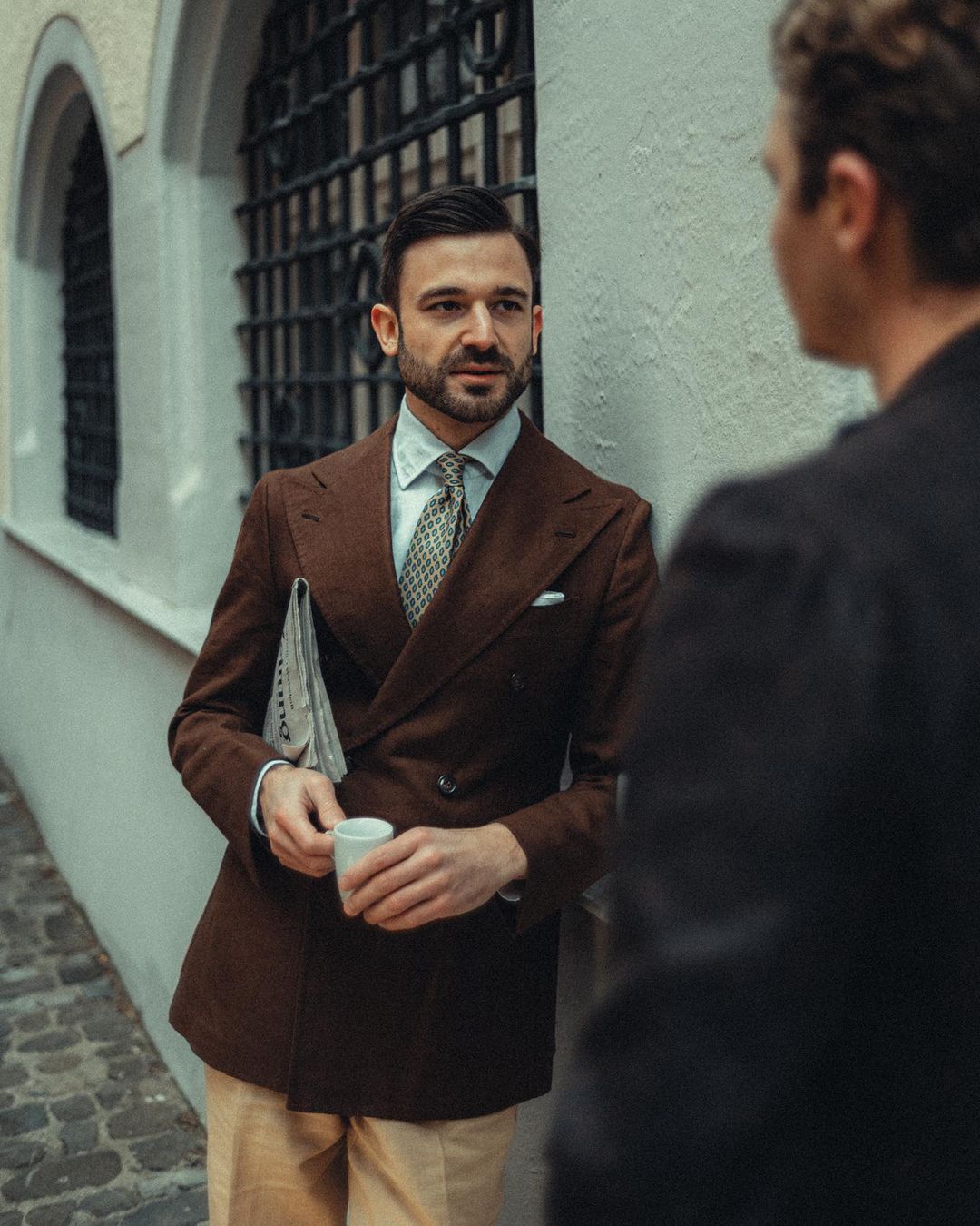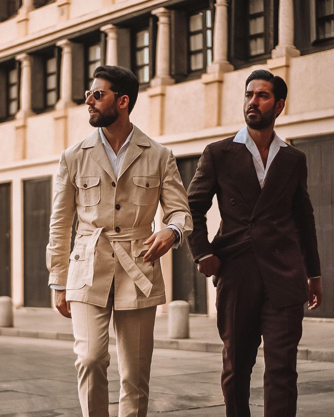 What stands out in the suits below is their choice of black buttons. Again, black contrasts beautifully with brown, and the idea that it doesn't is a scam perpetrated against you by stuffy British assholes from some decades ago. They highlighted this choice on their instagram, and they were right to do so. Definitely consider your button choices carefully.