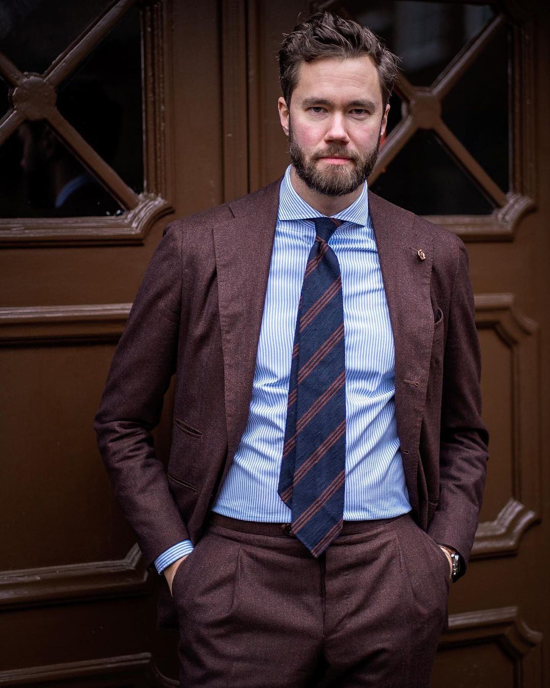Brown is a funny color in tailoring. Unlike other dark neutrals -- Navy, Charcoal, Black -- Brown was traditionally frowned upon. The phrase "no brown in town" warned against brown shoes in London -- not suits, but mainly because the thought of a brown suit in London was patently ridiculous. We've since learned, as a culture, that brown is a super dope color for tailoring, but it's all in the historical light of brown -- even dark, neutral shades -- being considered strangely casual.