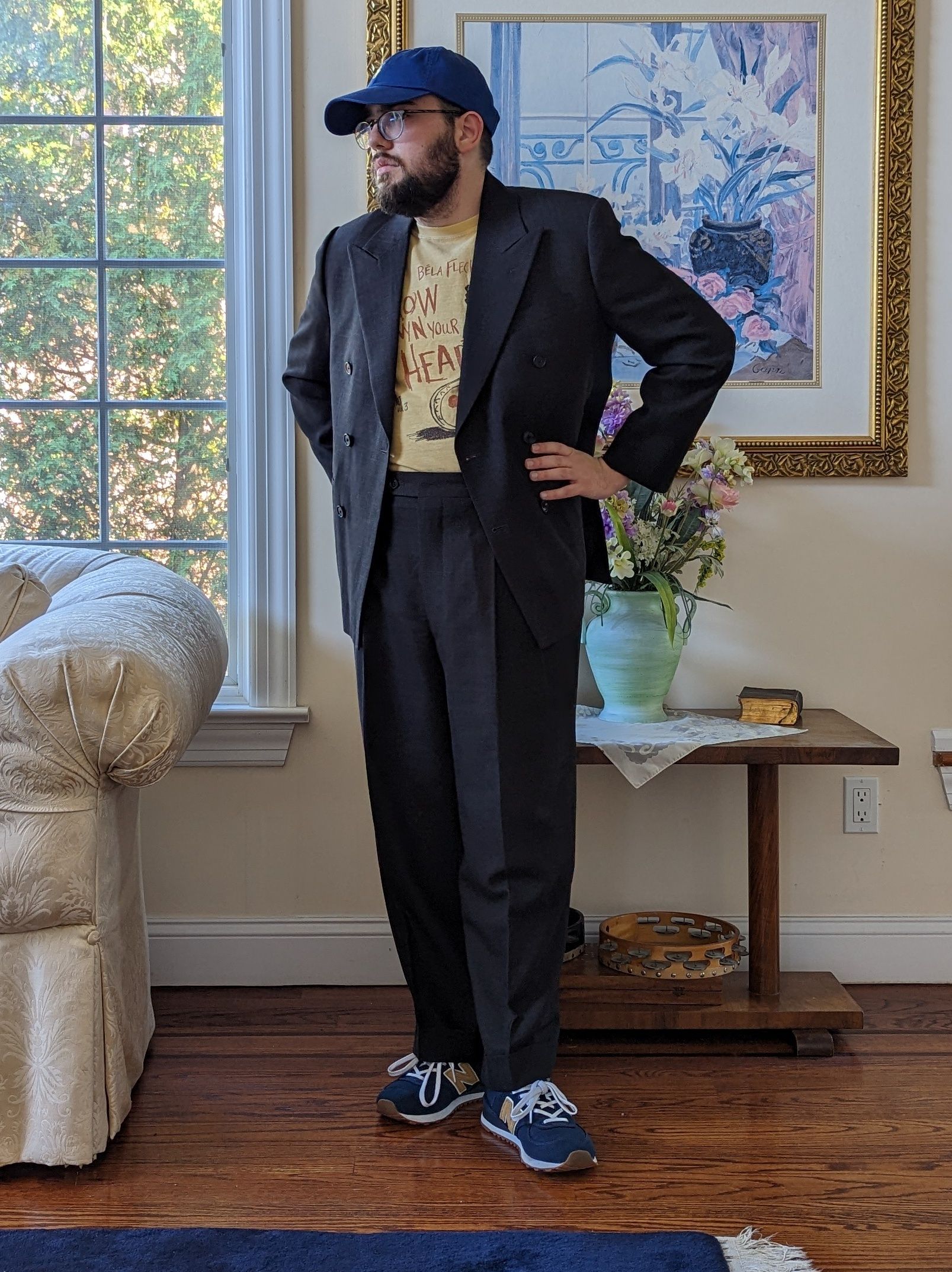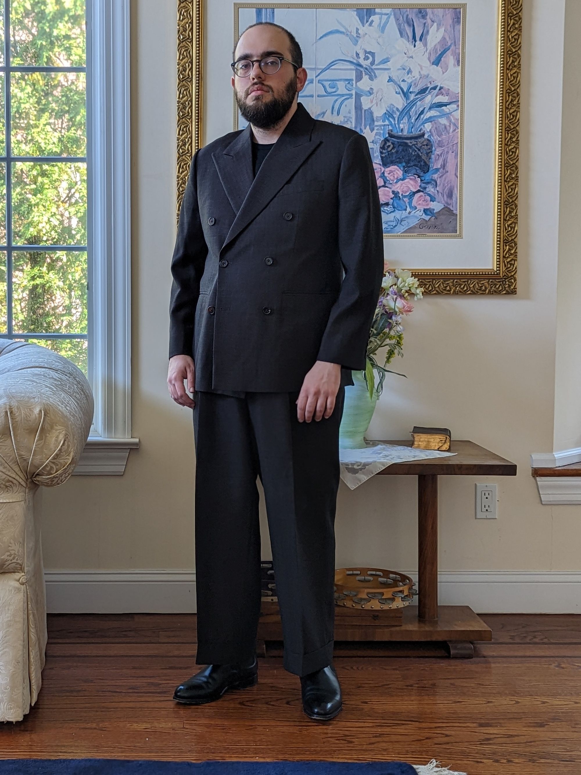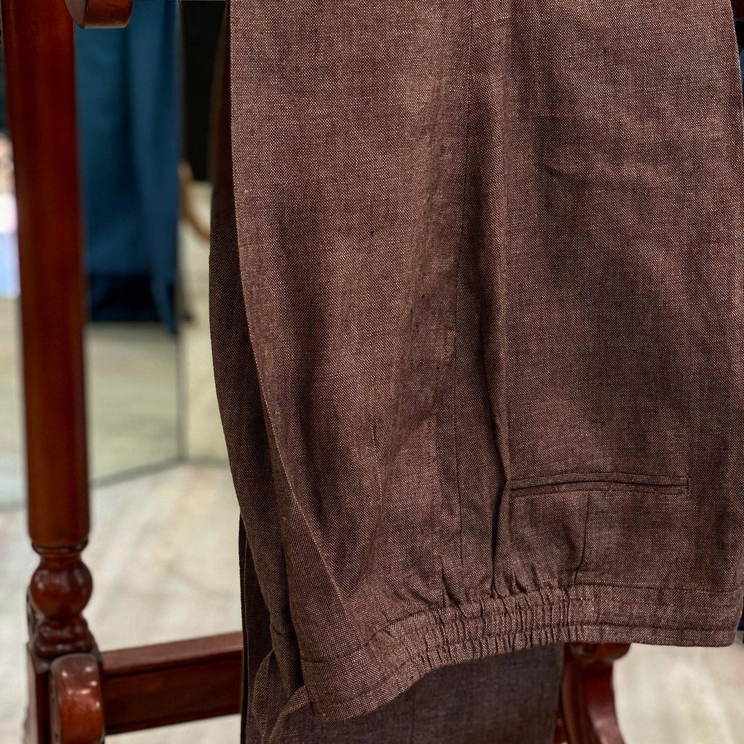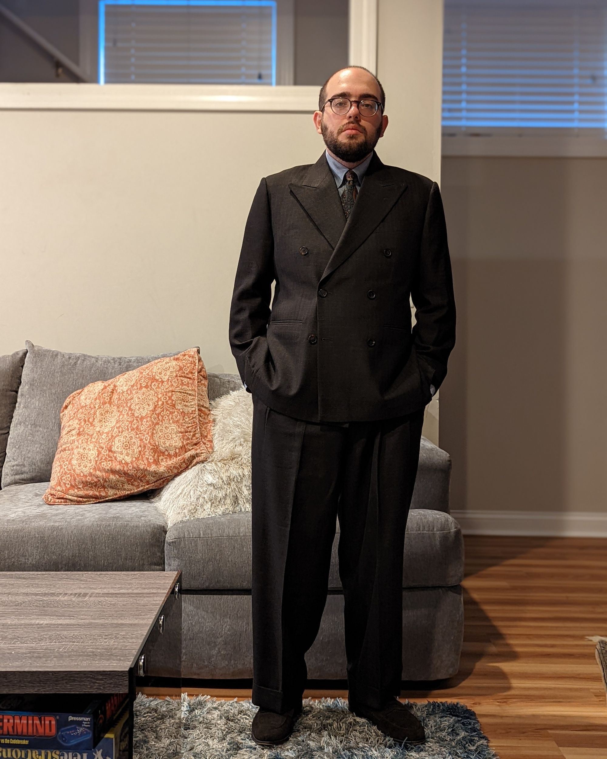 Well, I finally did it! I got a dark brown linen-blend DB from CustomMen in Dormeuil Cosmos—75% wool, 15% linen, and 10% silk, in a lovely herringbone. I went for a wide leg for this super flowy drapey wool. I love this thing.
