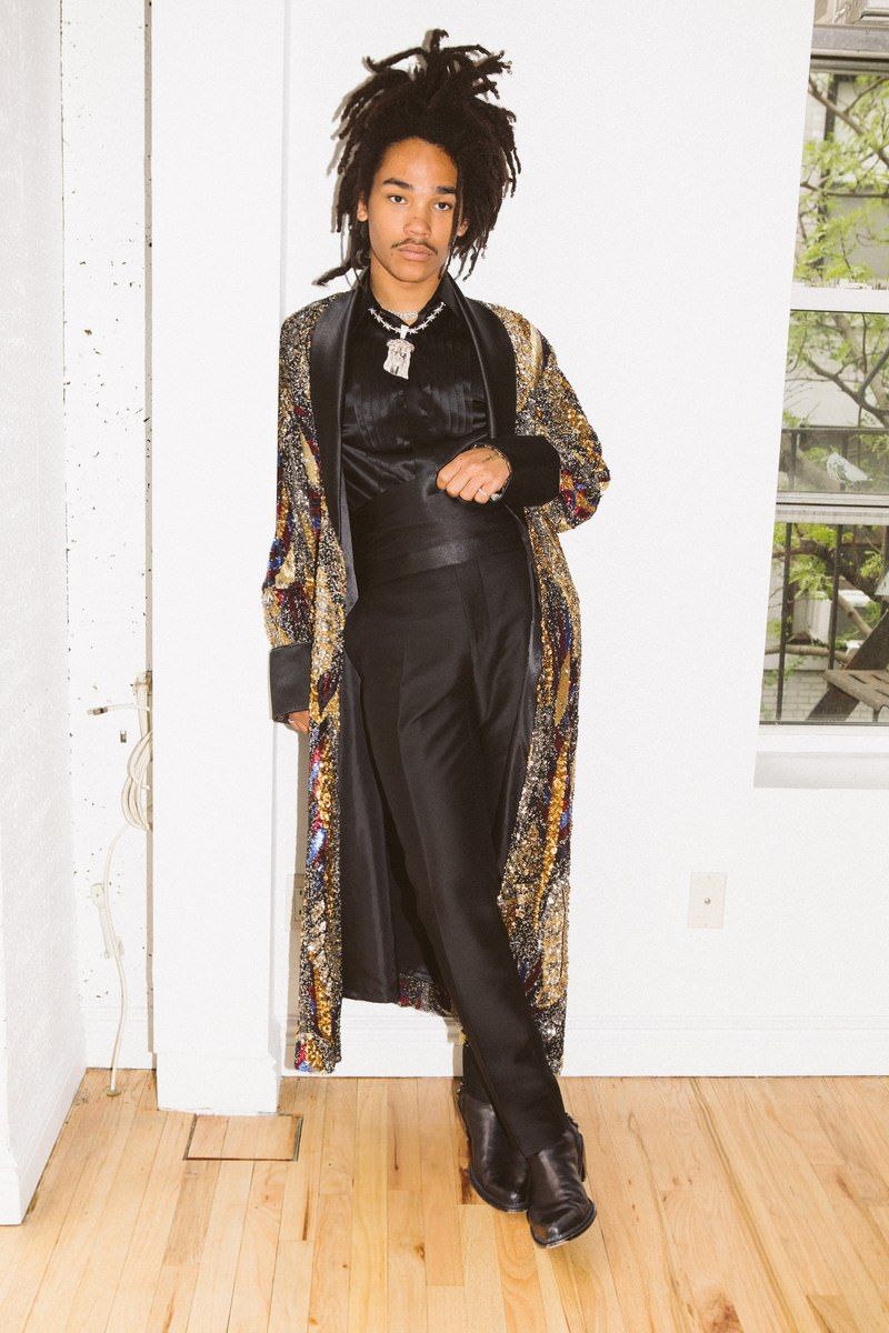 Below, the ever-controversial Luka Sabbat in a fit that I have to say... I like. I wouldn't normally condone a black dress shirt, but it works here, especially against that loud, luxe robe. Also note the necklace functioning in place of a bowtie!