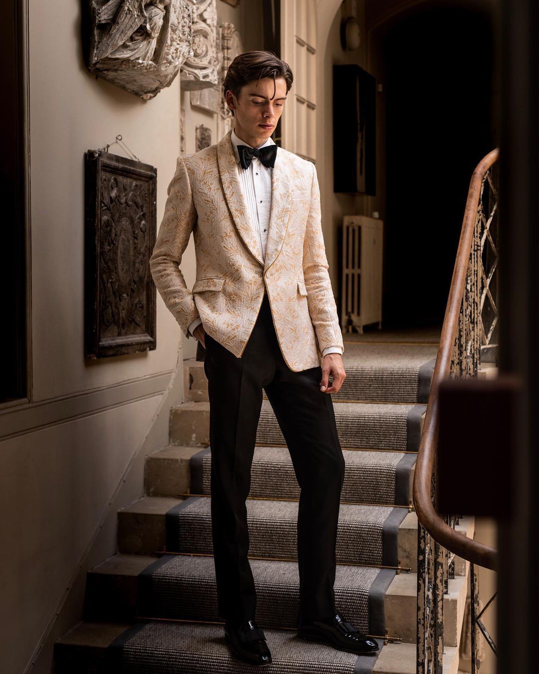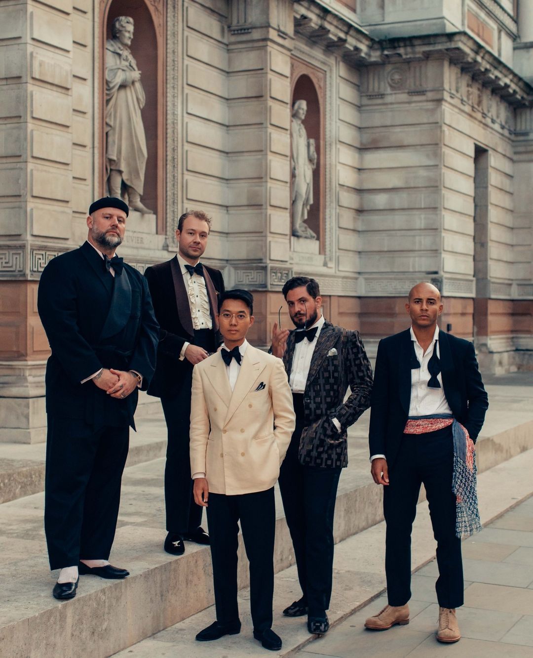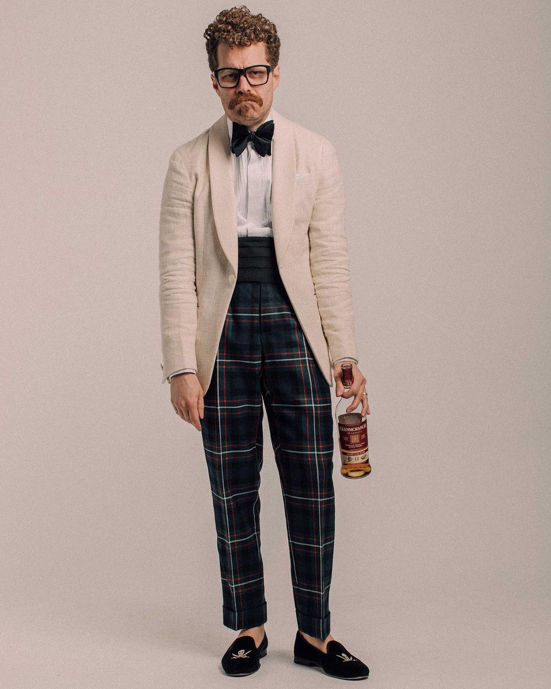 Let's start off strong and weird. Jason Sandagon wearing his own Mad King George dinner jacket in this pink tweed is just... excellent. The bellied lapel. The turn up cuff. The pattern matching. And just that shade of pink....