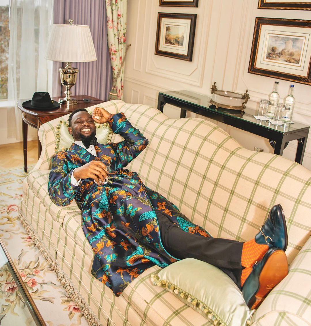A little silly? sure. Bright blues and oranges make a statement. But to me, in the context of this photo, the statement imports all the luxurious relaxation I want to see, without sacrificing the party mindset. Dressing gown from New & Lingwood.