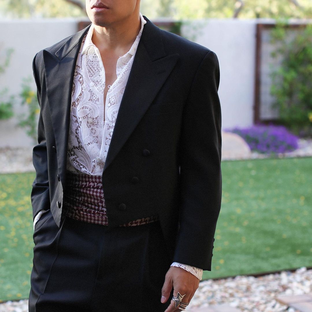 Balance. That's what I see here. A lacy shirt, contrasting cummerbund, rings, Grecian slippers, no socks... and the tail on that jacket! I'd go so far as to say I usually hate a jacket with tails, but here, it provides so much... balance. The slippers and lacy shirt connote a subtle femininity that is nonetheless managed by the suit itself (and Eric's masculine frame).