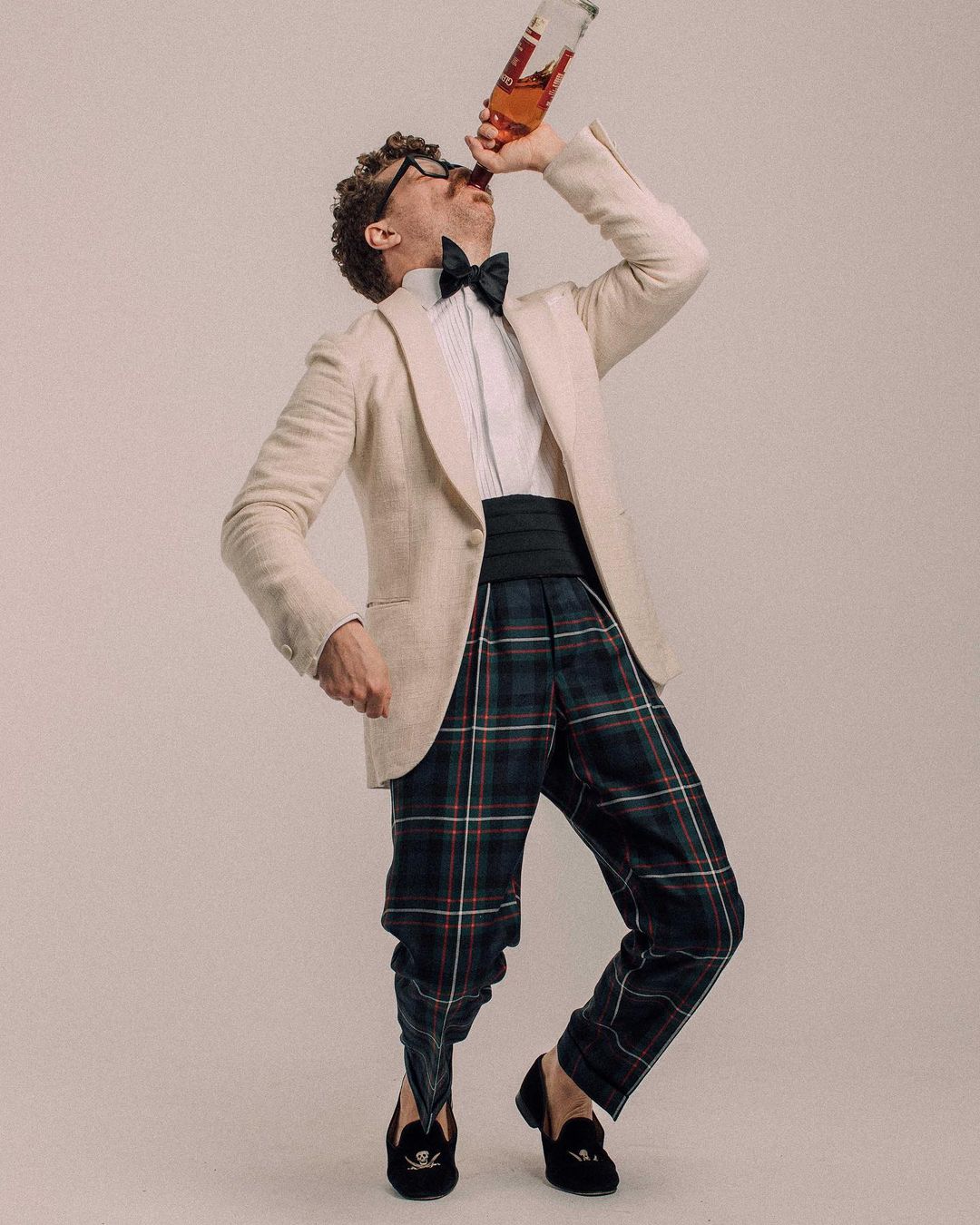 Last article, we covered ivory dinner jackets, plaid elements, and crested velvet slippers. Each felt like a viable part two spin to me, but all together, with the ridiculous poses Jamie is known for, this feels like a part three outfit to me. The slippers and trousers both give me elements of sleep, and the bottle and poses tell a story. To me: Jamie threw a New Years eve party, and nobody came. At least he has liquor...