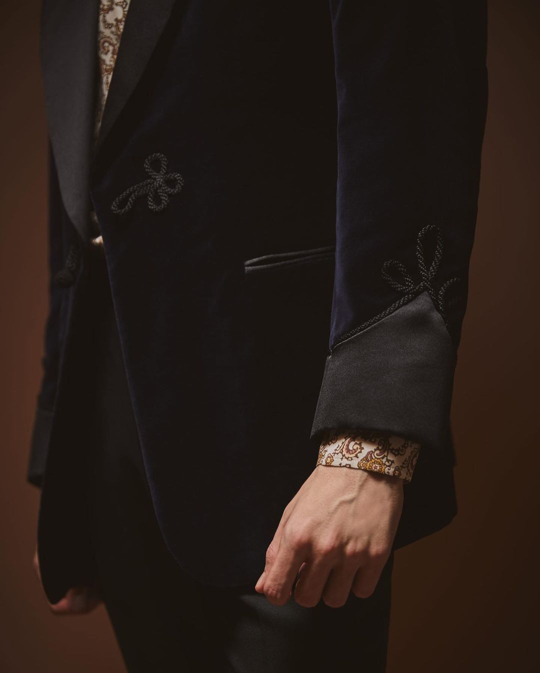 A green velvet double breasted smoking jacket by Henry Poole & Co with toggles and embroidery. Smoking jackets are frequently belted, but the toggles here just give it the edge of a dinner jacket, of something that you might reasonably wear outside your own home. He certainly looks ready to go out in this look. Louche but put together.