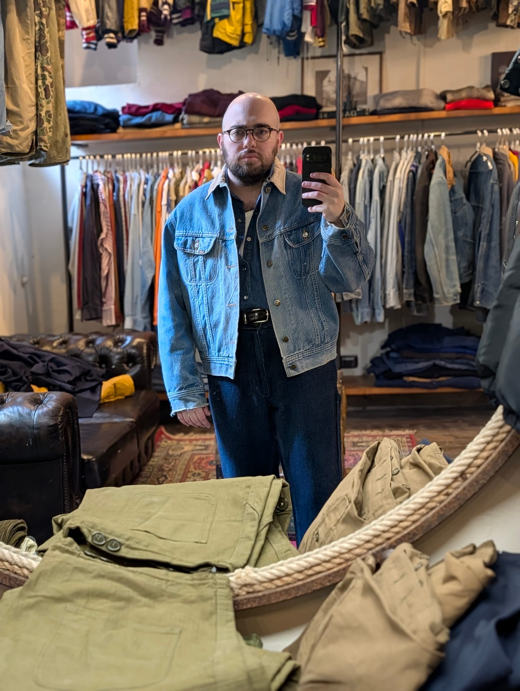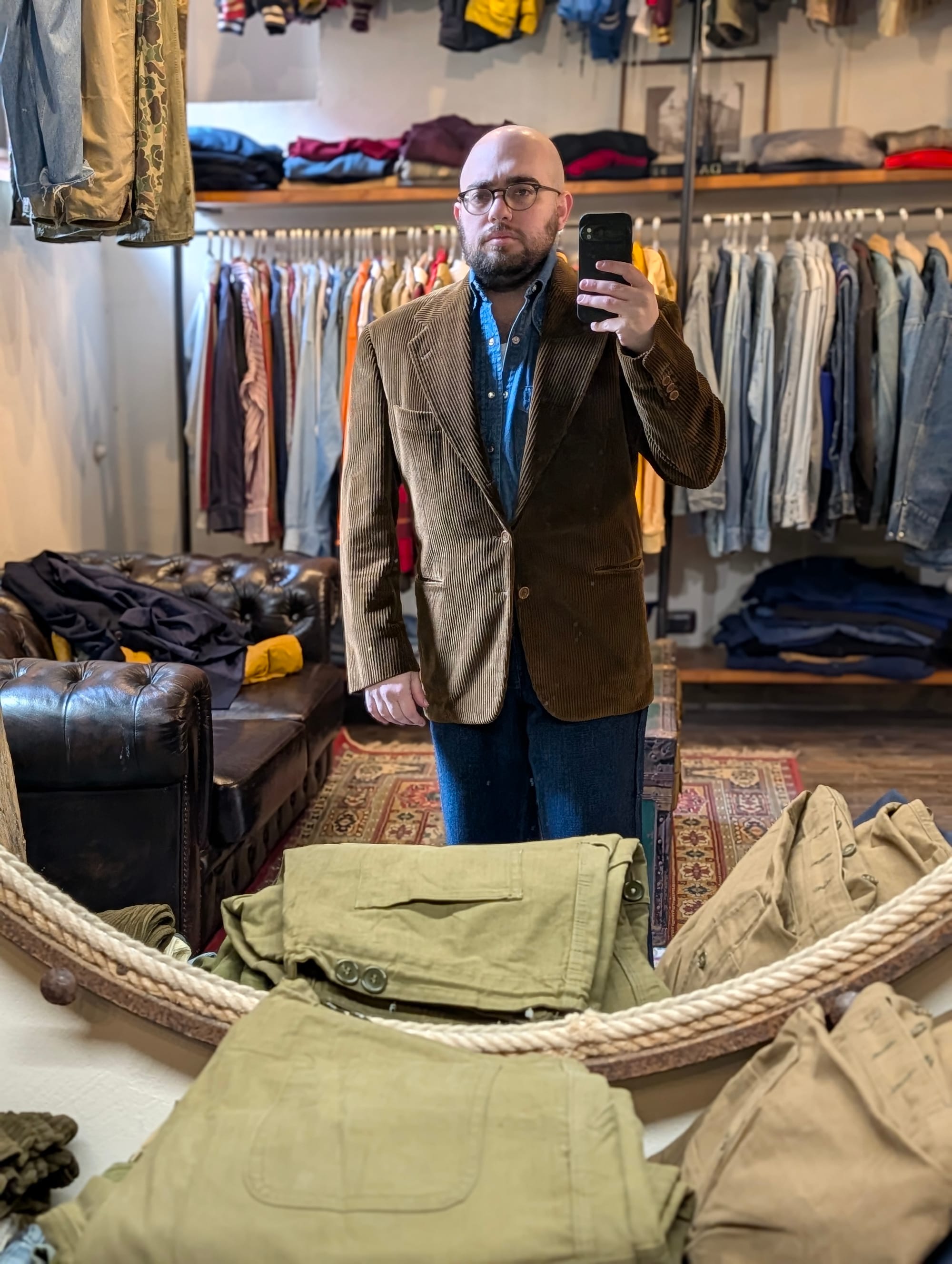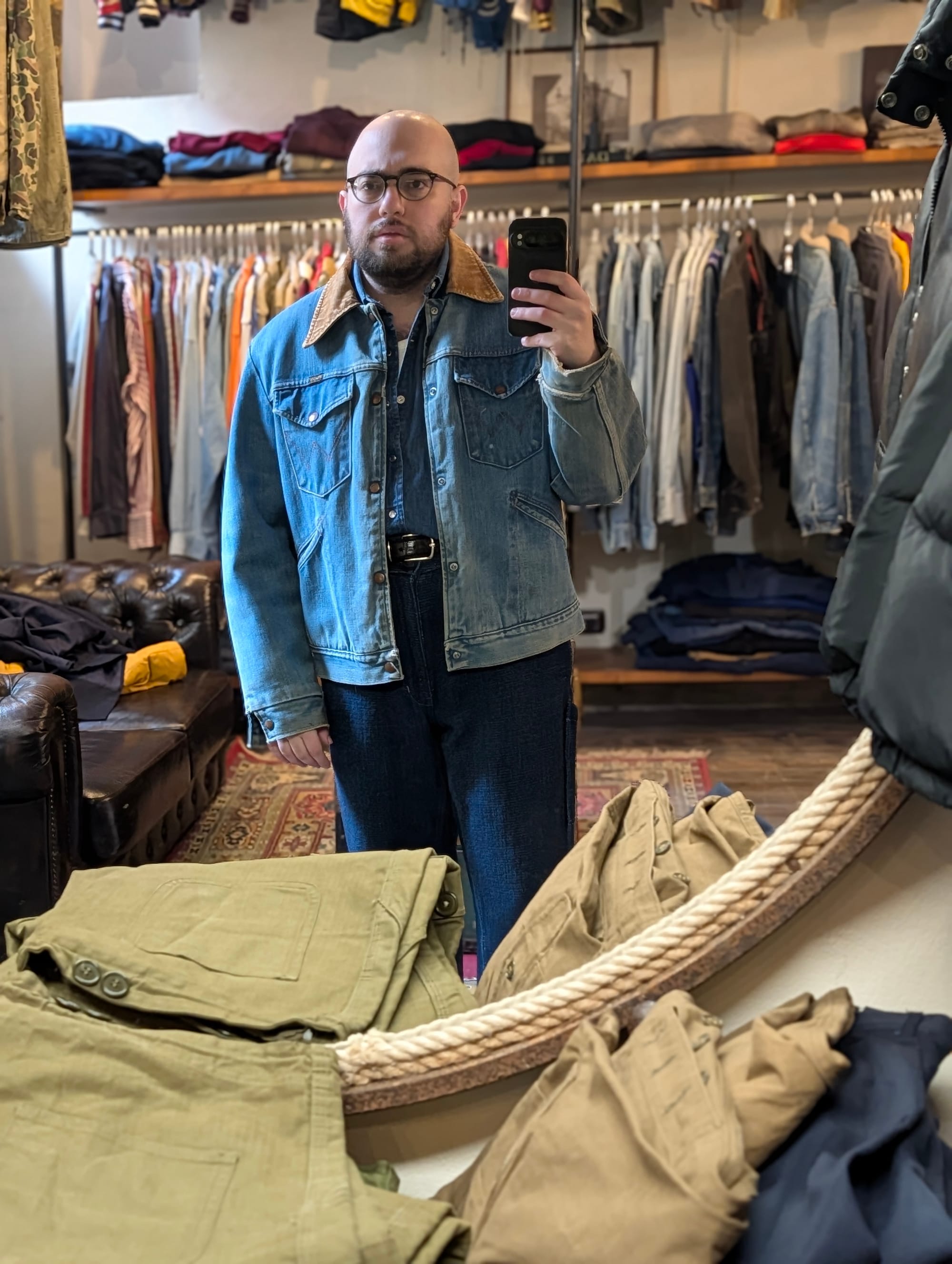 Denim jackets from Lee; Wrangler; Ralph Lauren. Suit jacket from Valentino (I wish it fit). Loden coat. The fit I walked in with.
