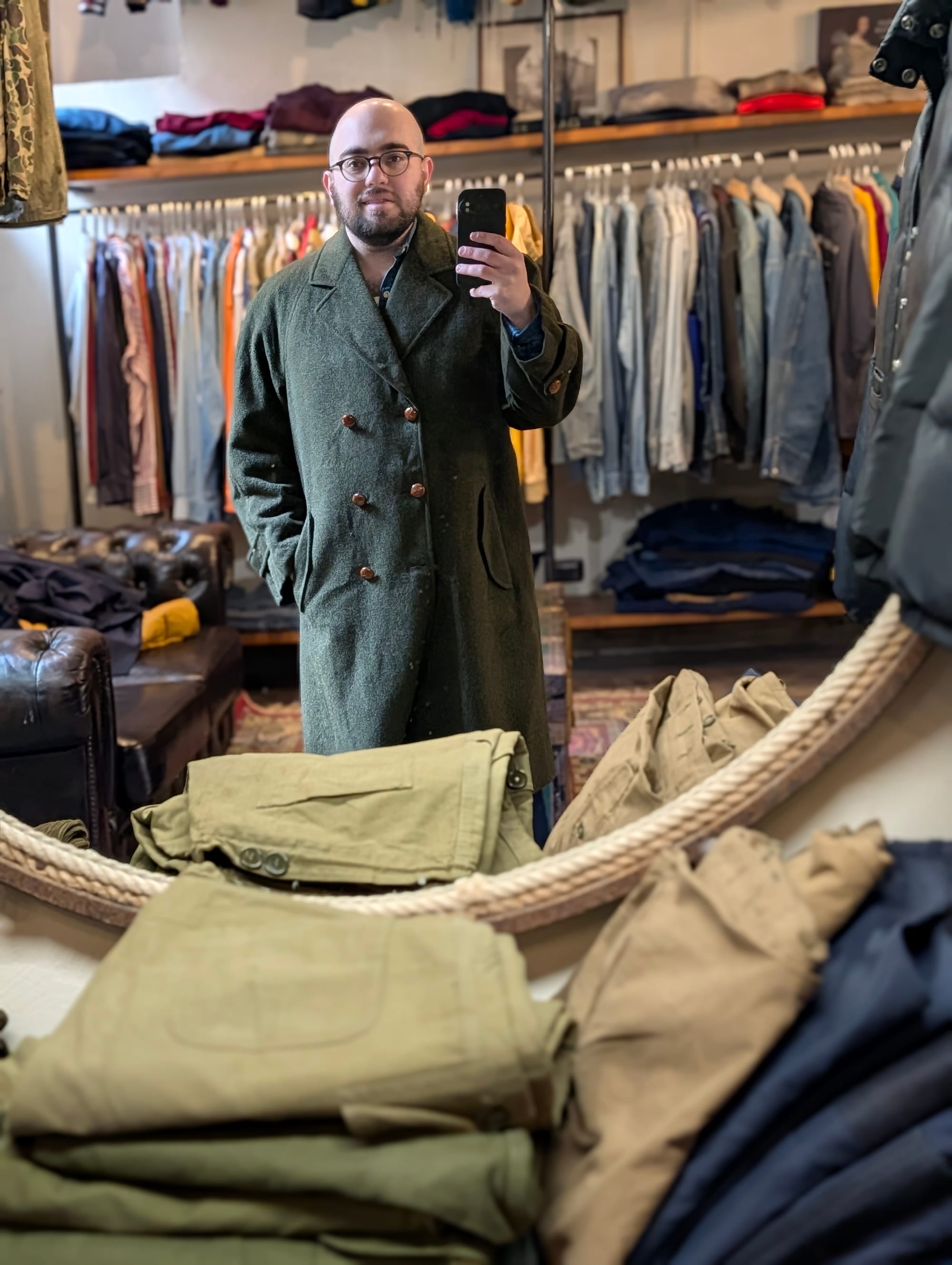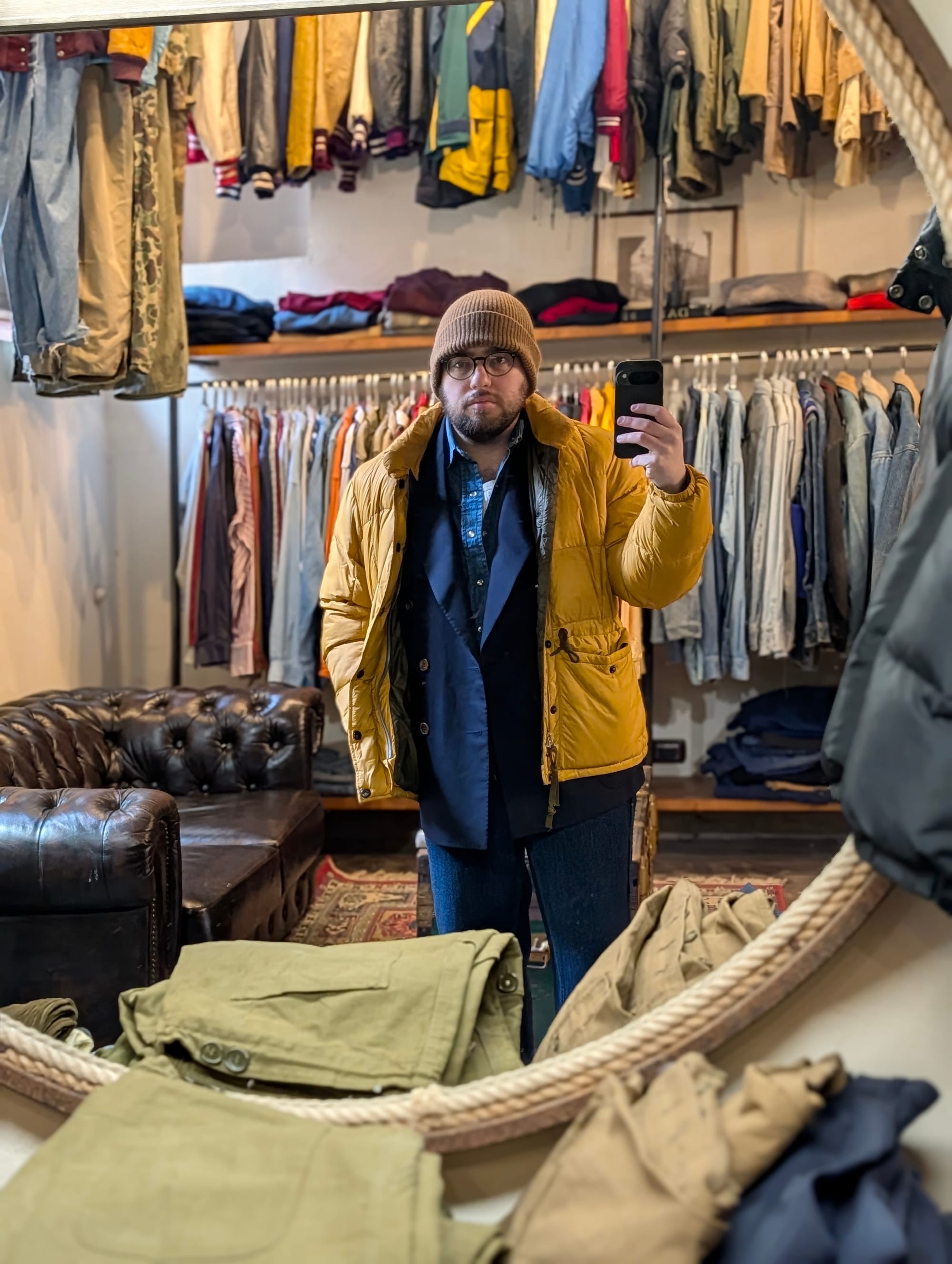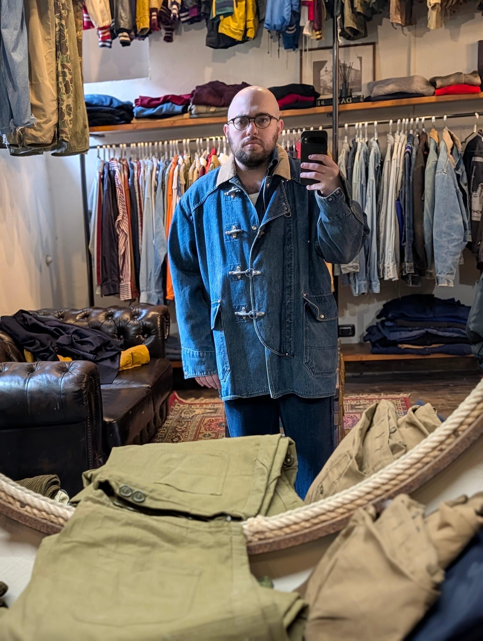 Denim jackets from Lee; Wrangler; Ralph Lauren. Suit jacket from Valentino (I wish it fit). Loden coat. The fit I walked in with.