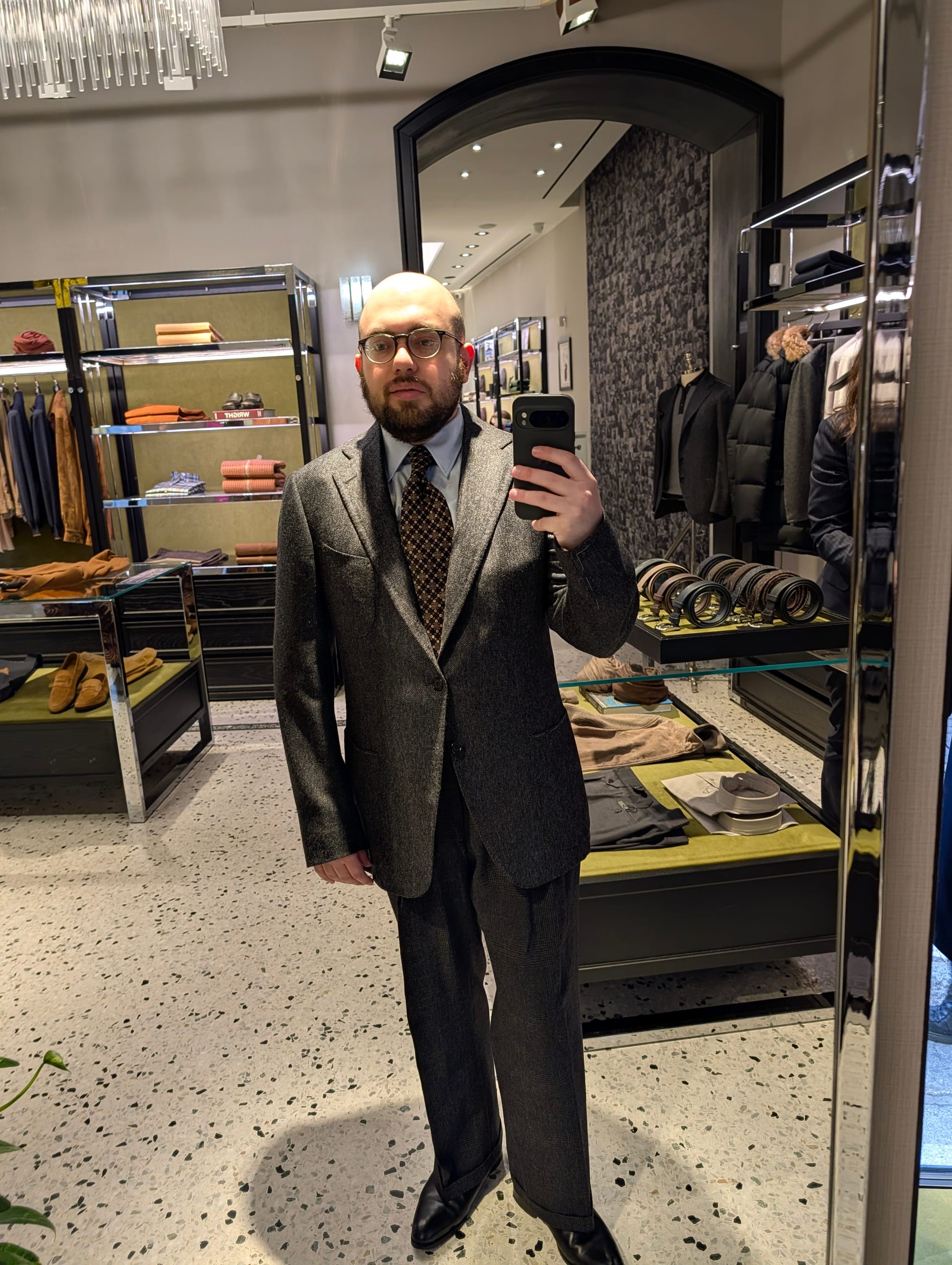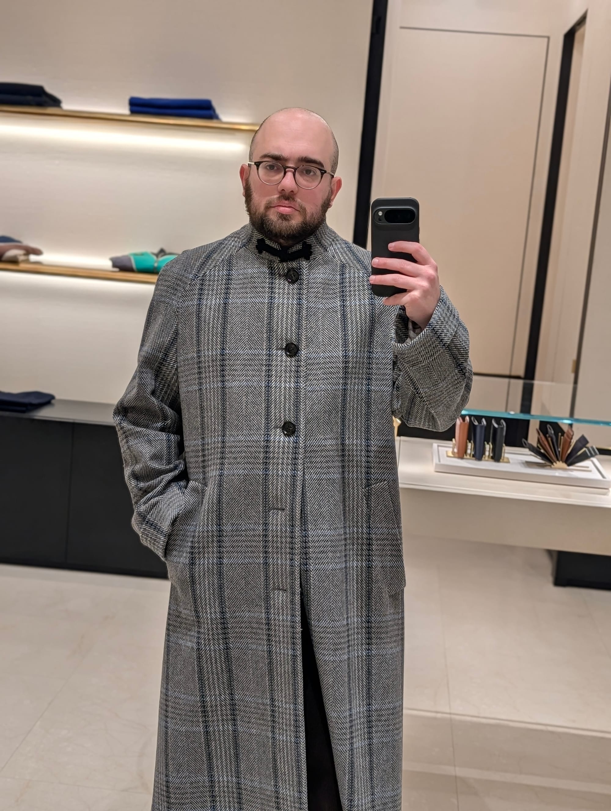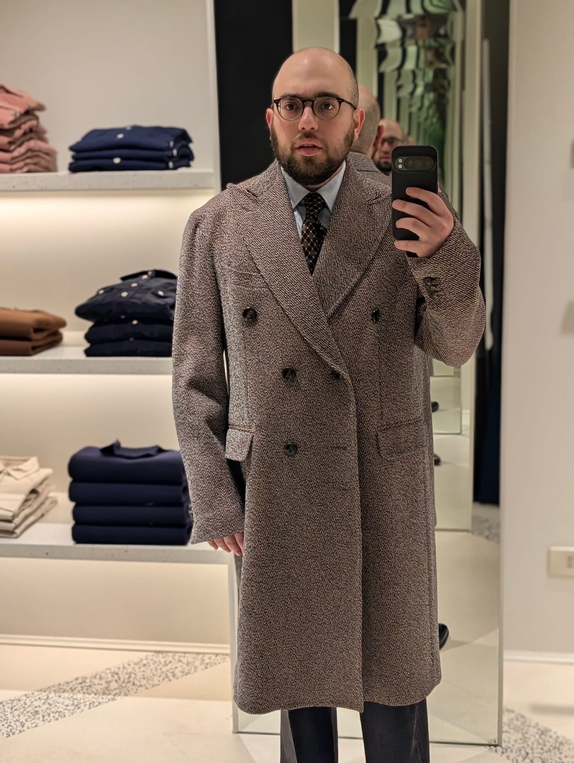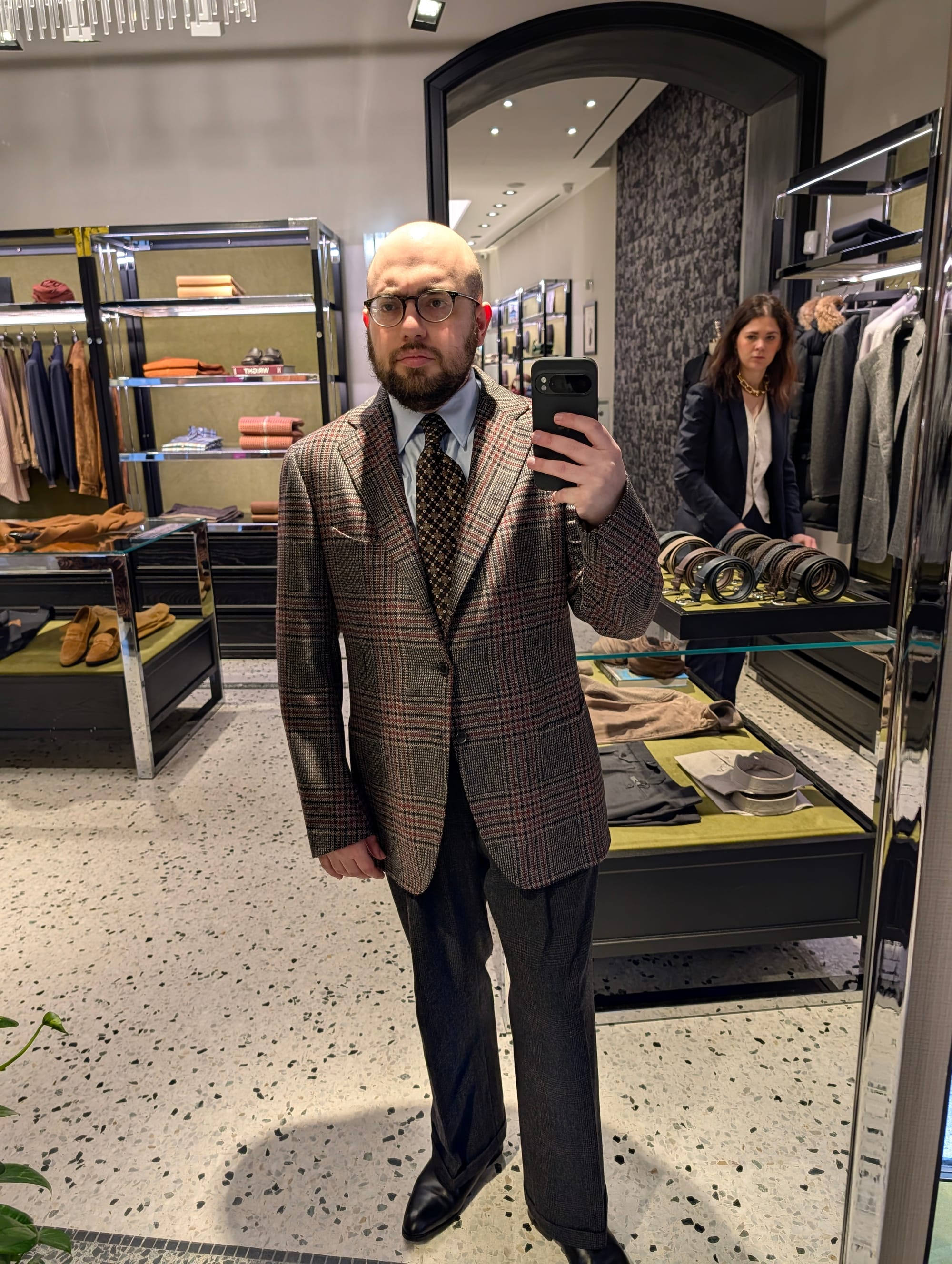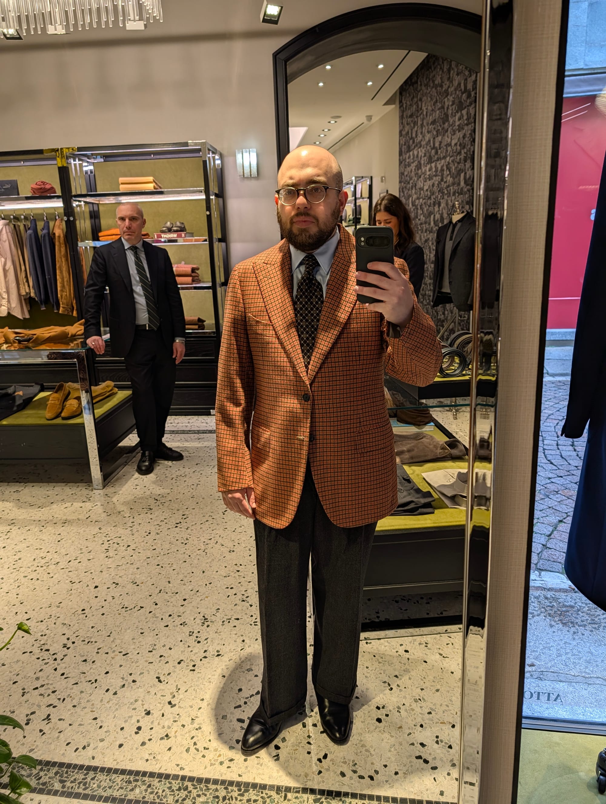 I did get to visit more stores! Highlights included Brioni (I didn't try much on, and there was some great stuff, but I'd been to Brioni stores before); Cesare Attolini (very exciting, nice store, wonky lighting in the mirror I used for the sport jackets, but the overcoat was glorious, as you can tell): and Jacques Marie Mage.