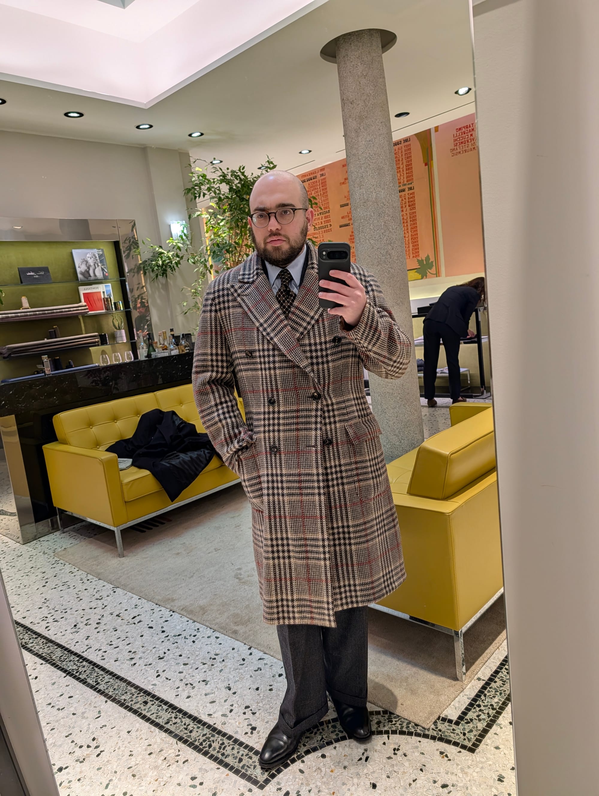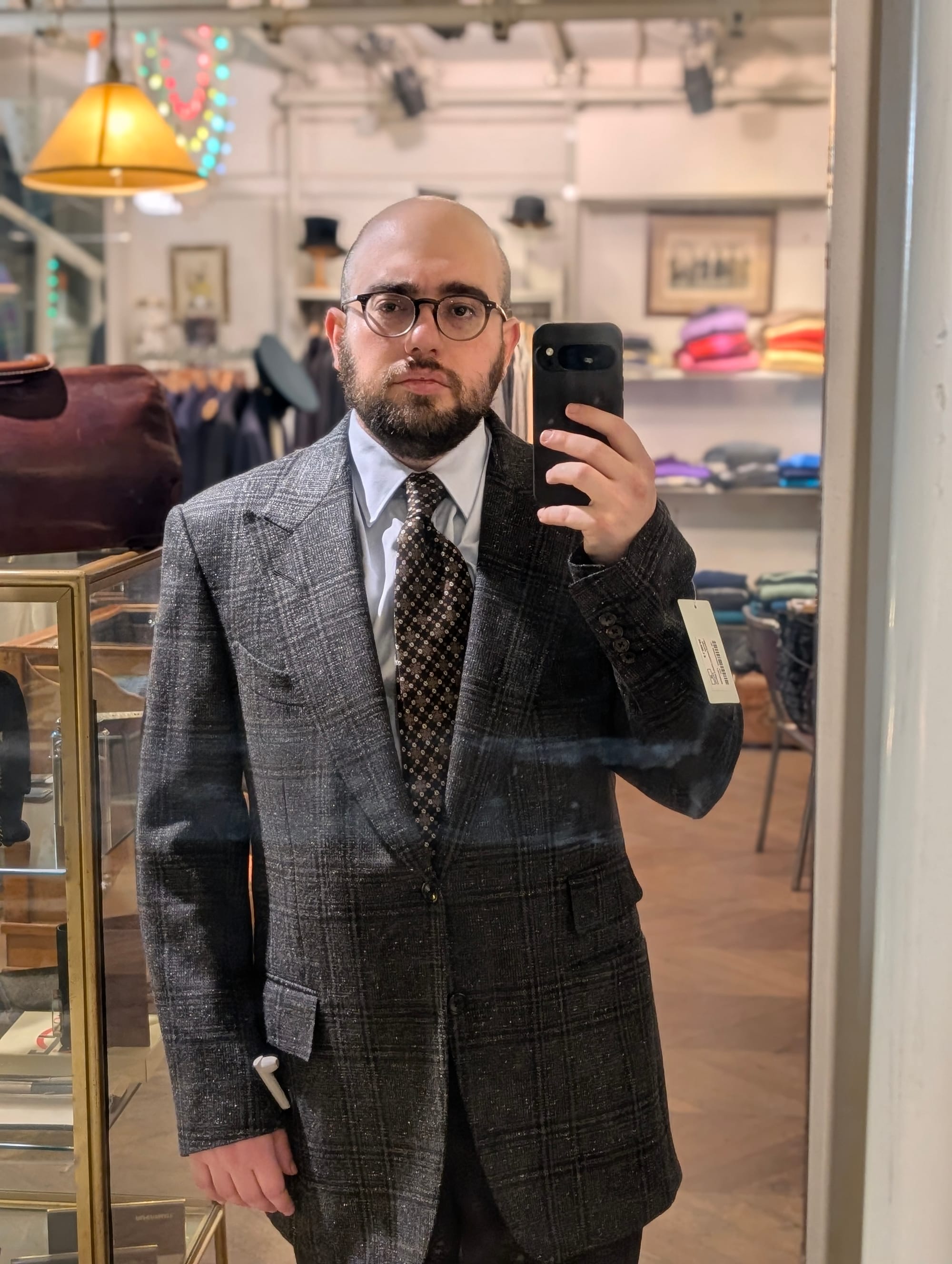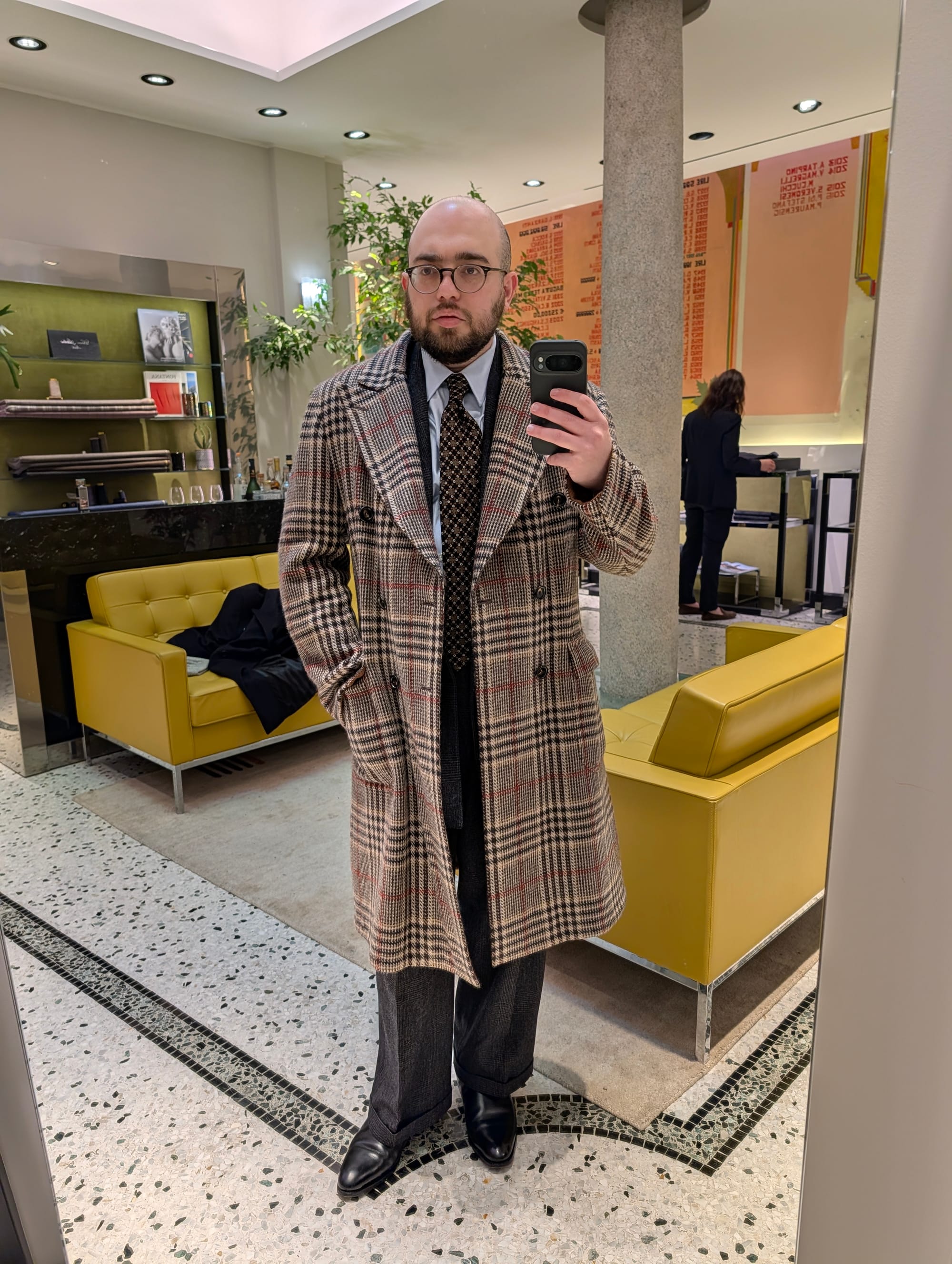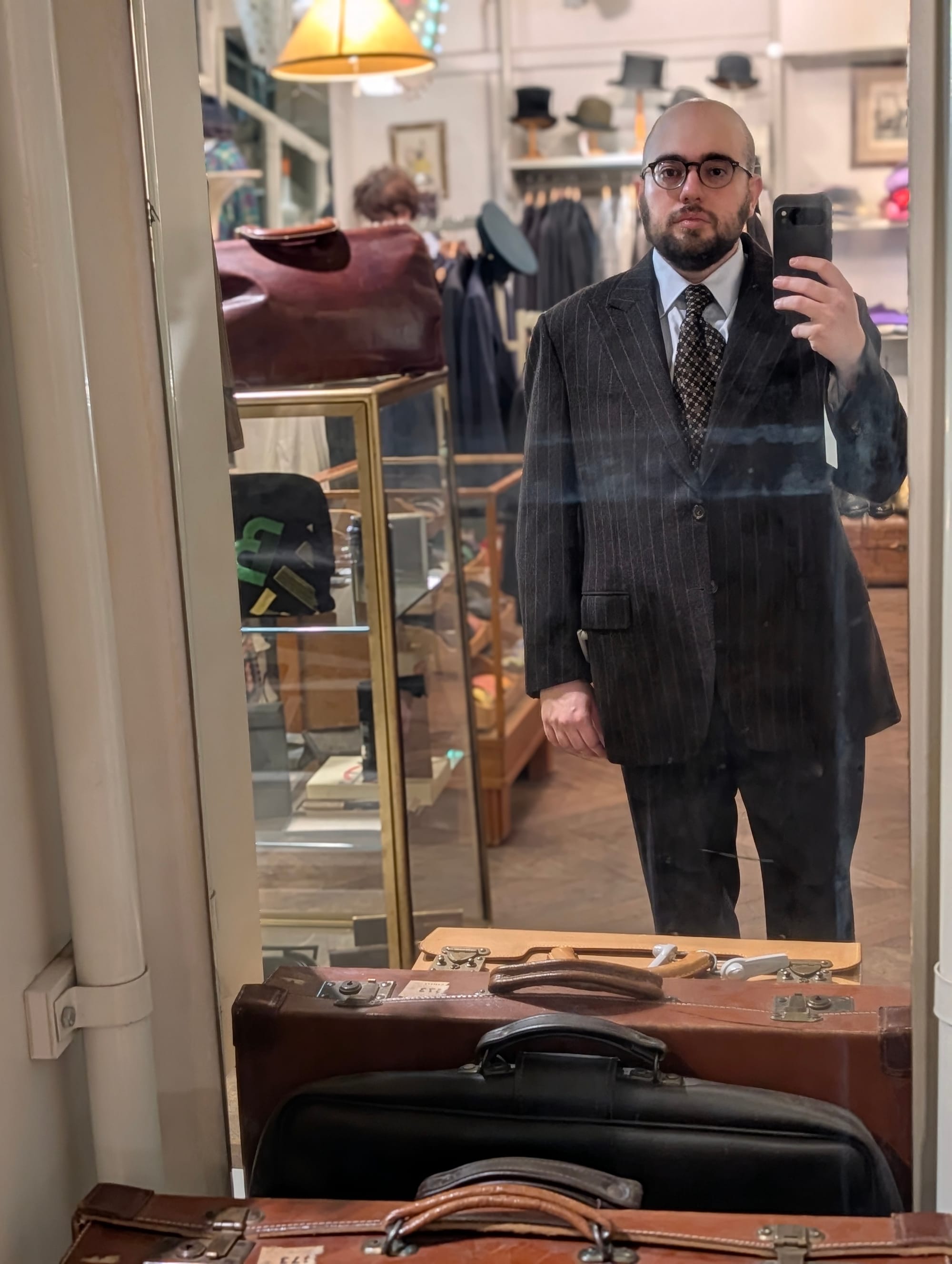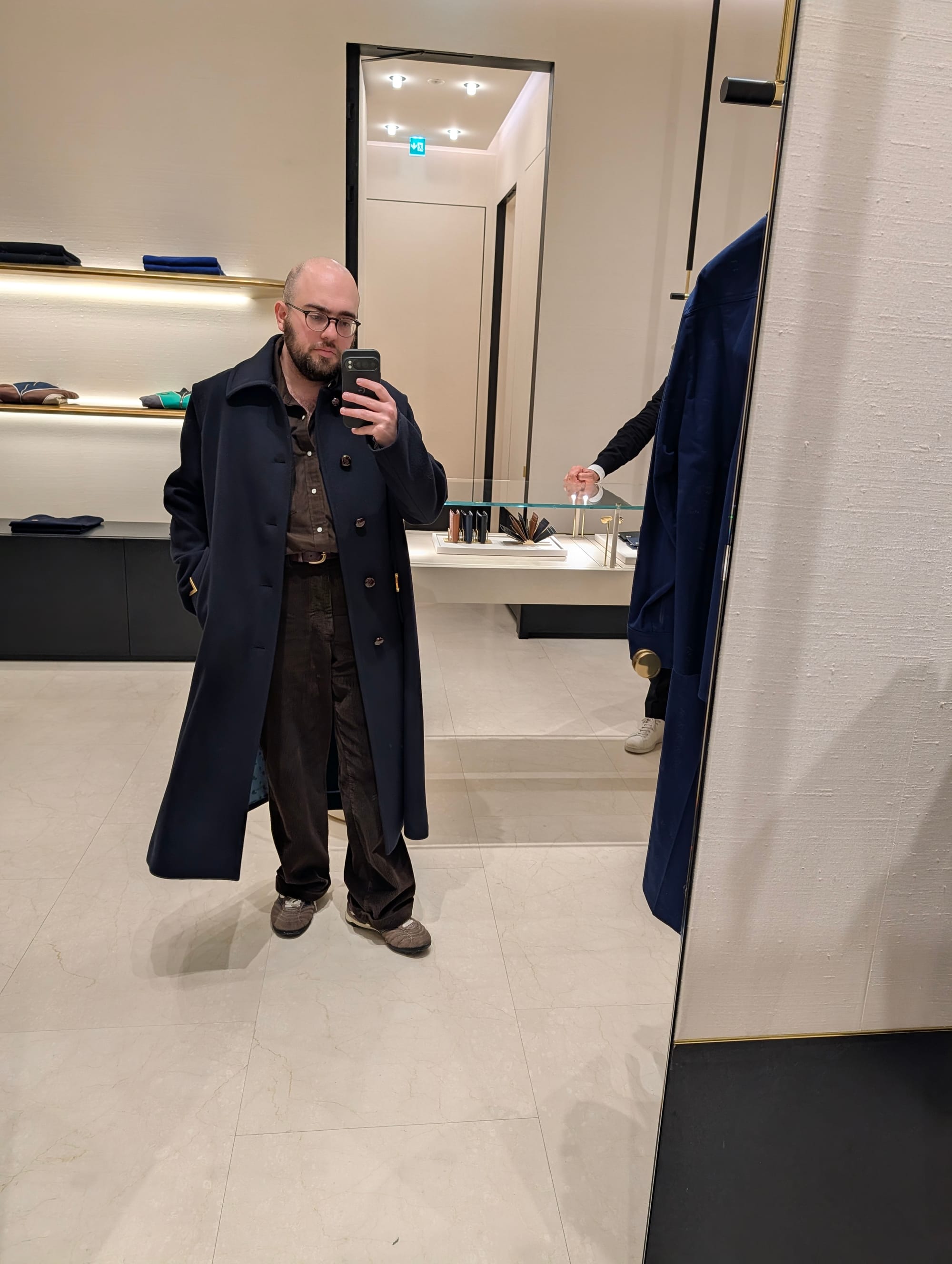 I did get to visit more stores! Highlights included Brioni (I didn't try much on, and there was some great stuff, but I'd been to Brioni stores before); Cesare Attolini (very exciting, nice store, wonky lighting in the mirror I used for the sport jackets, but the overcoat was glorious, as you can tell): and Jacques Marie Mage.