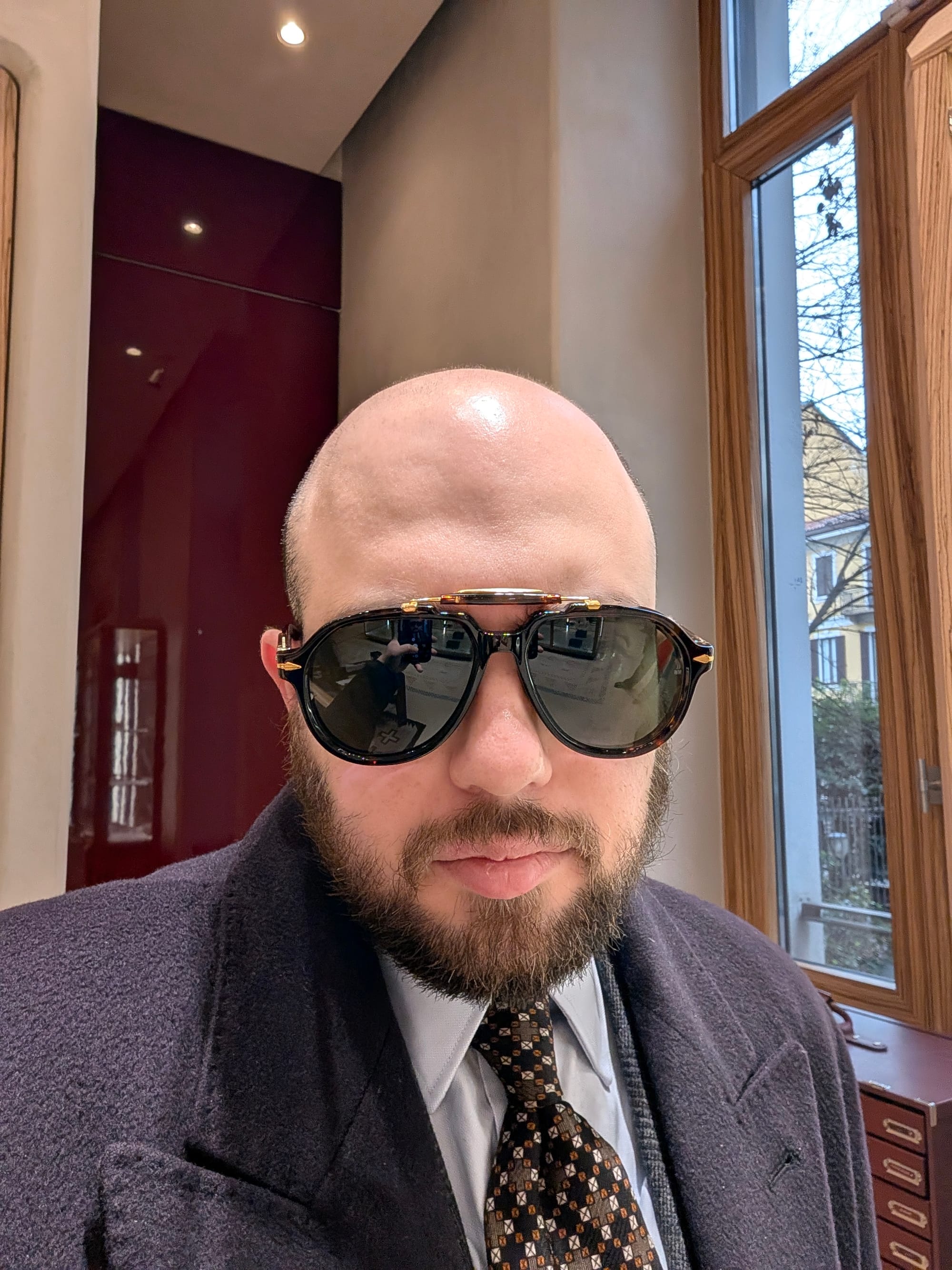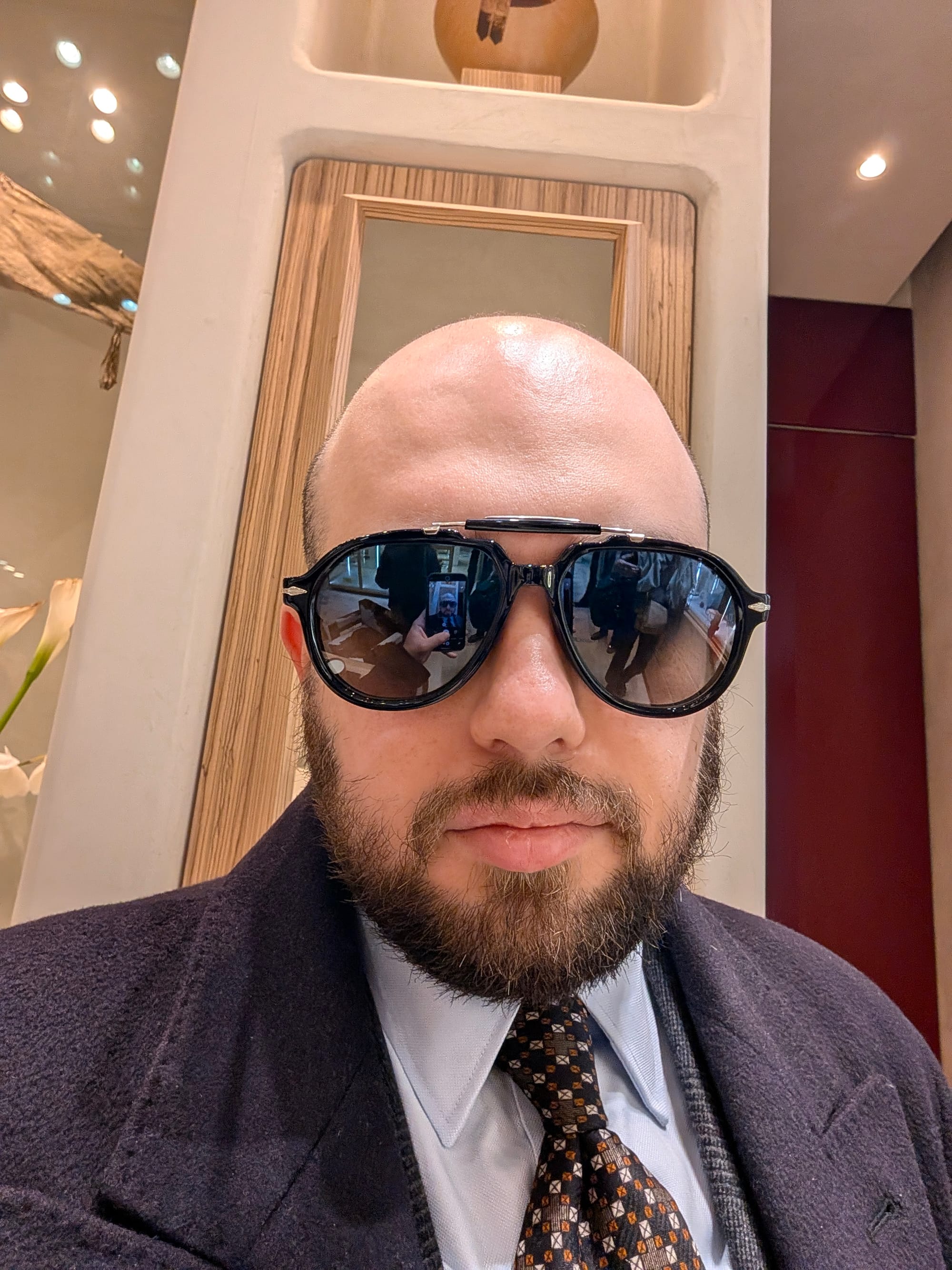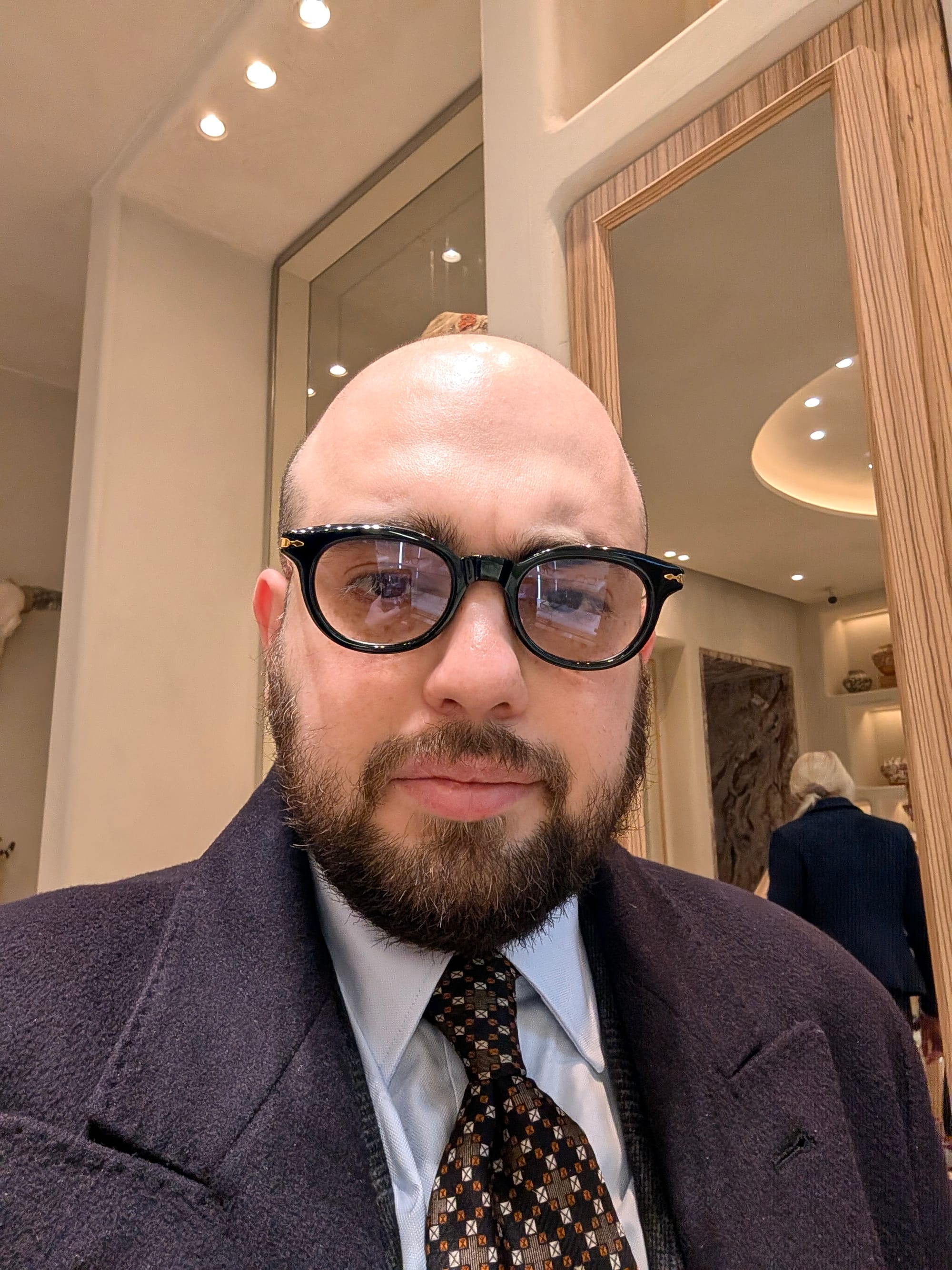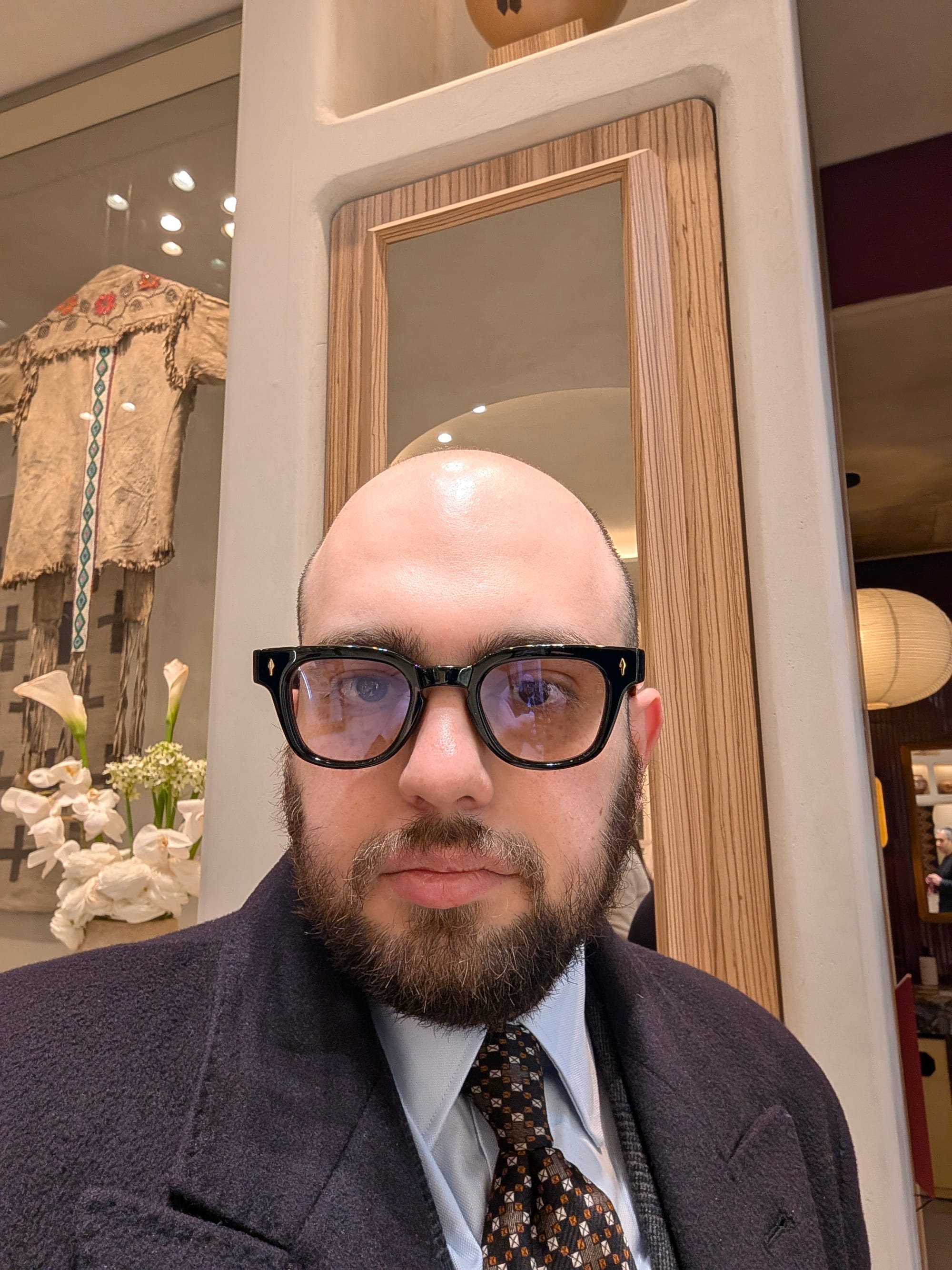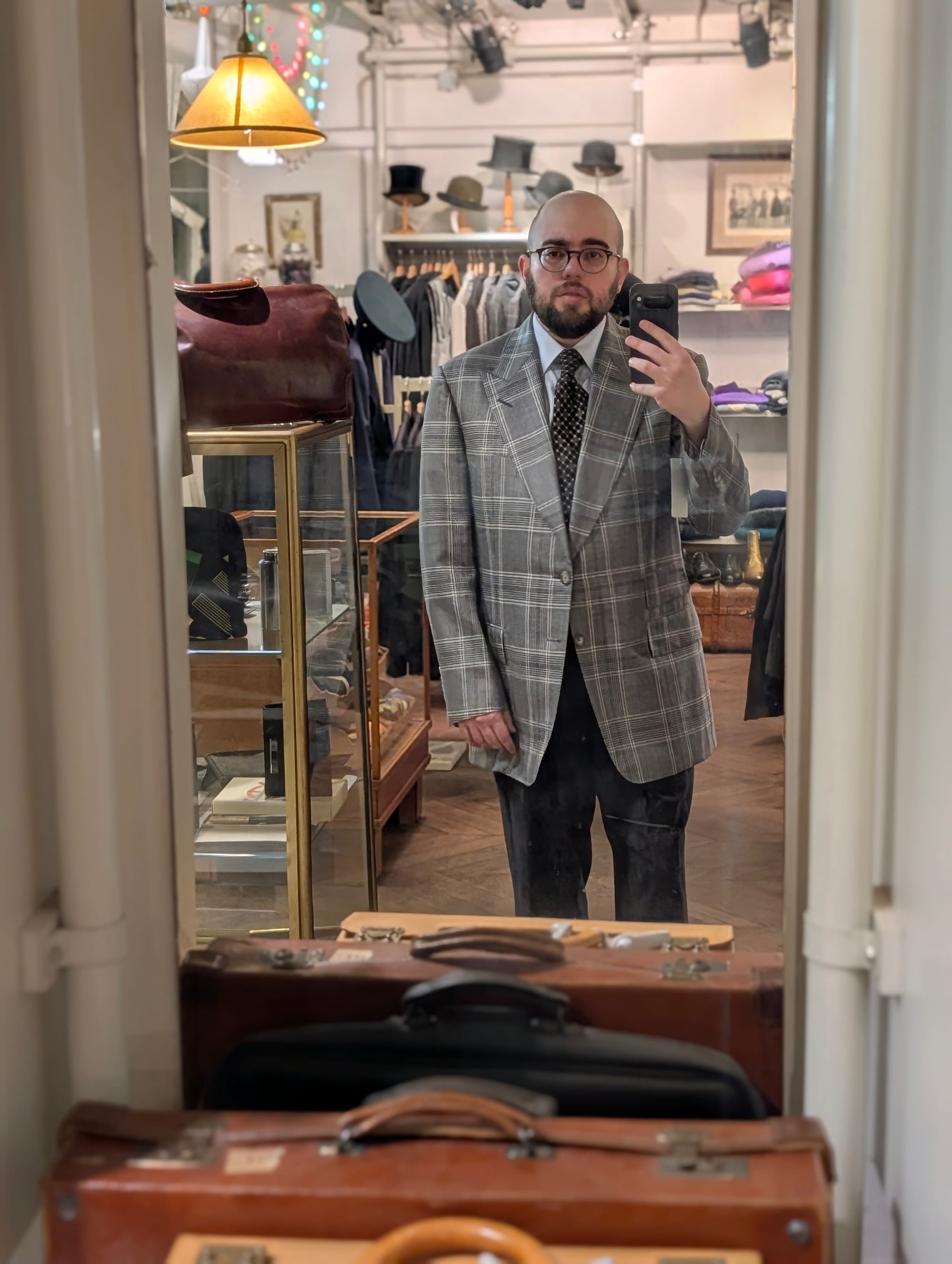 I did get to visit more stores! Highlights included Brioni (I didn't try much on, and there was some great stuff, but I'd been to Brioni stores before); Cesare Attolini (very exciting, nice store, wonky lighting in the mirror I used for the sport jackets, but the overcoat was glorious, as you can tell): and Jacques Marie Mage.