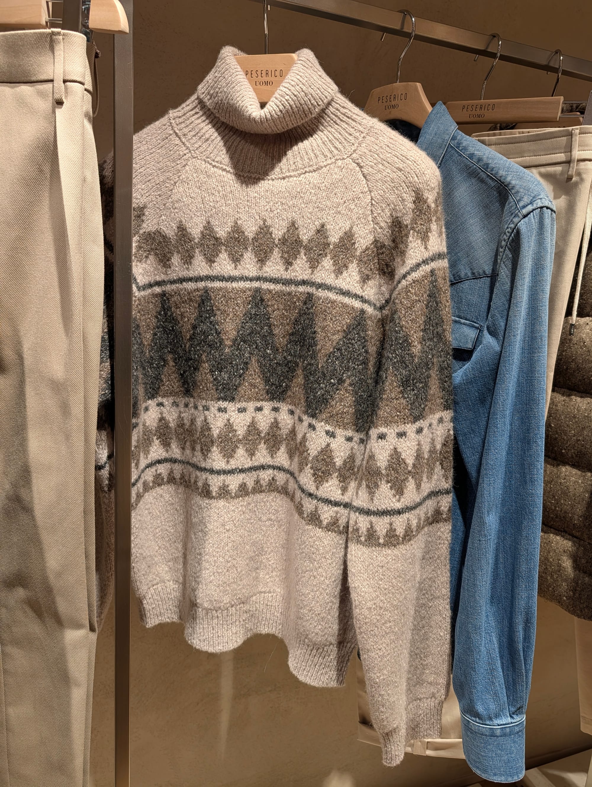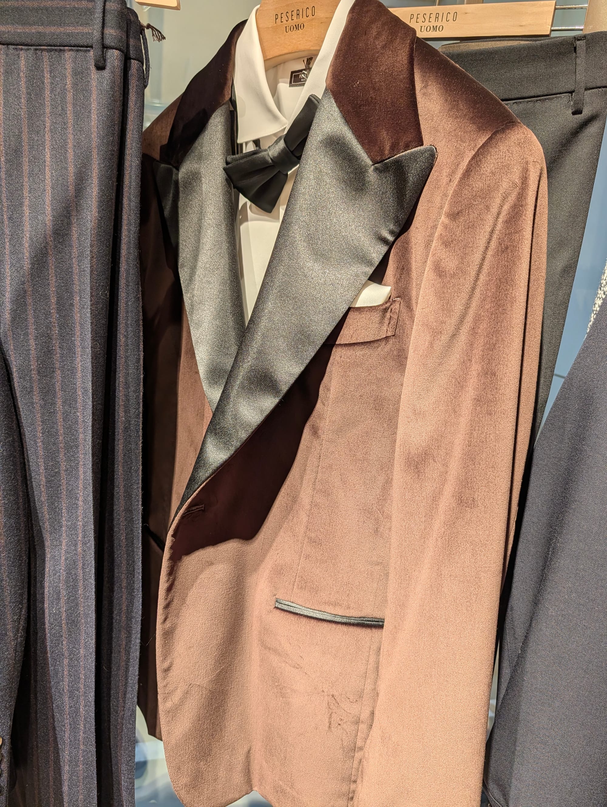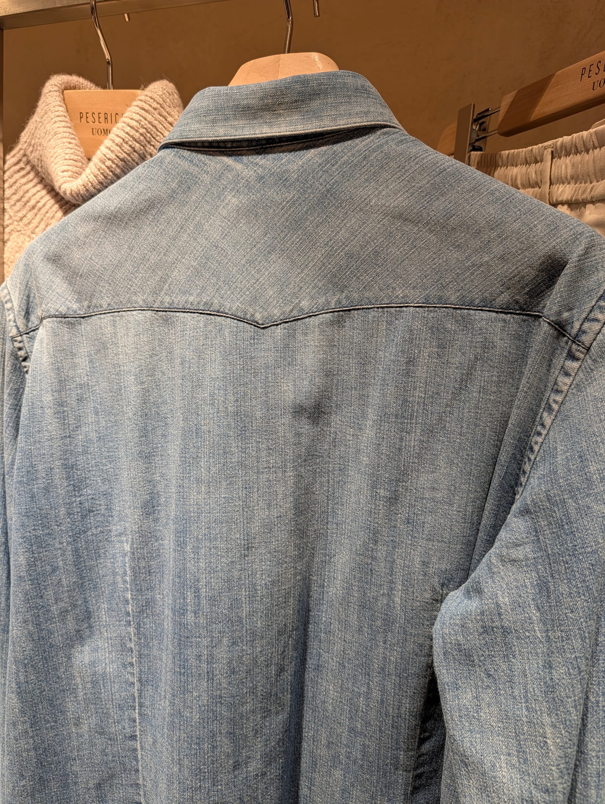 A denim western shirt with a very visible bias cut on the yoke; a brown velvet dinner jacket; texture; knitwear; a striped double breasted metal button blazer; more knitwear; a hat that reminded us of those Wythe hats but they're different. All from Peserico's presentation.