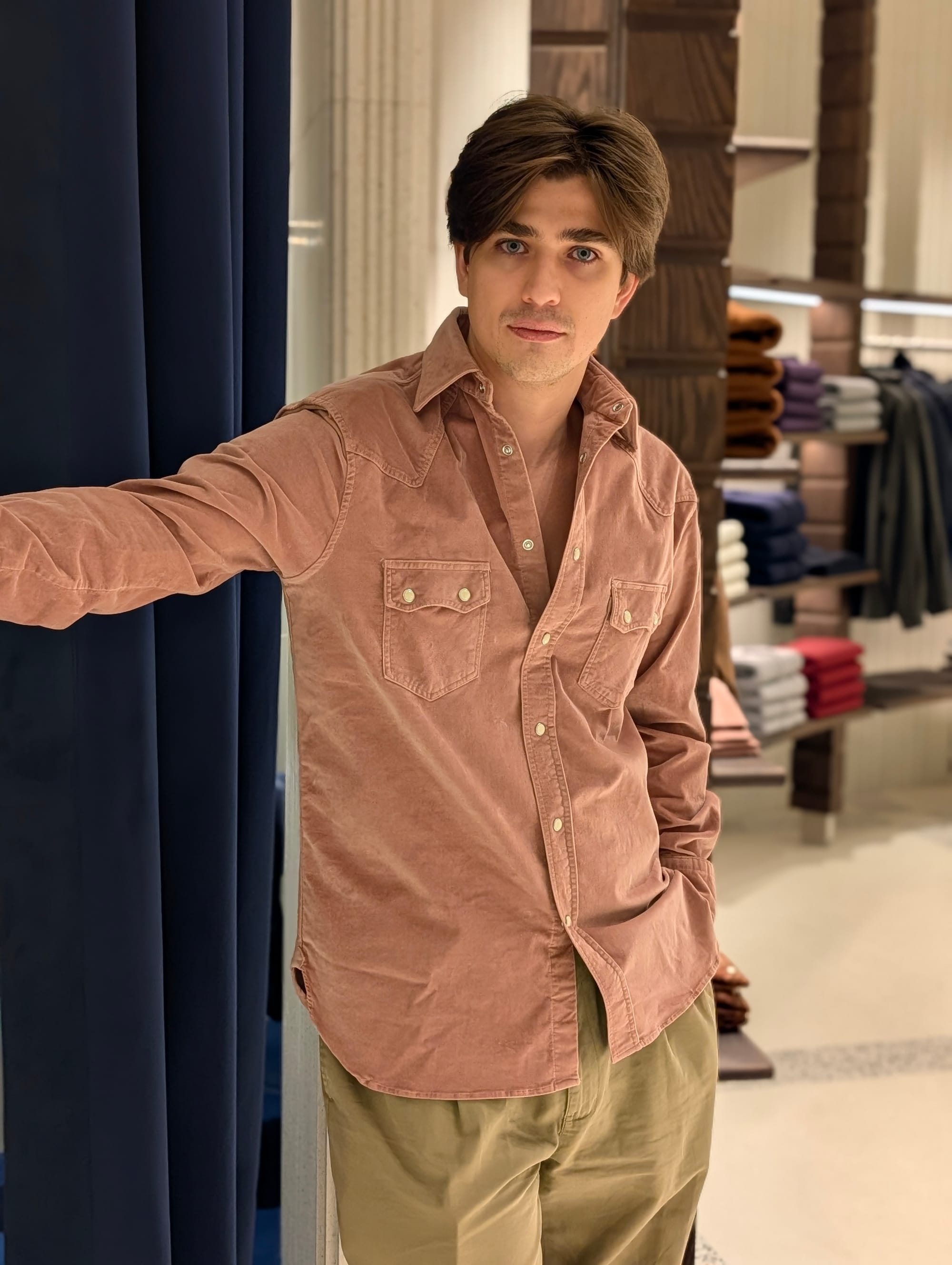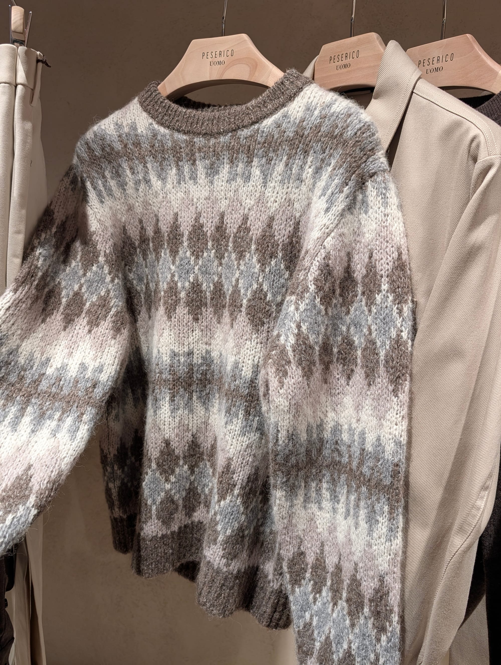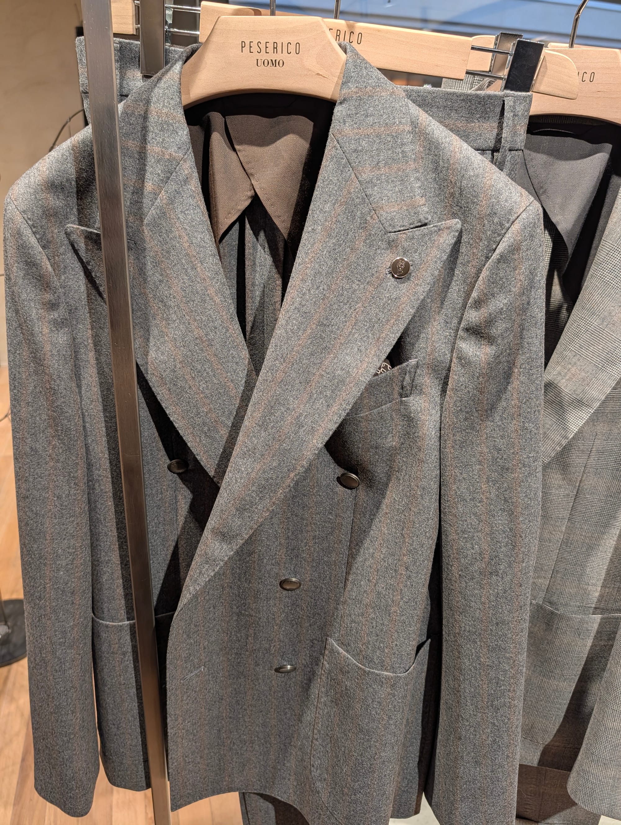 A denim western shirt with a very visible bias cut on the yoke; a brown velvet dinner jacket; texture; knitwear; a striped double breasted metal button blazer; more knitwear; a hat that reminded us of those Wythe hats but they're different. All from Peserico's presentation.