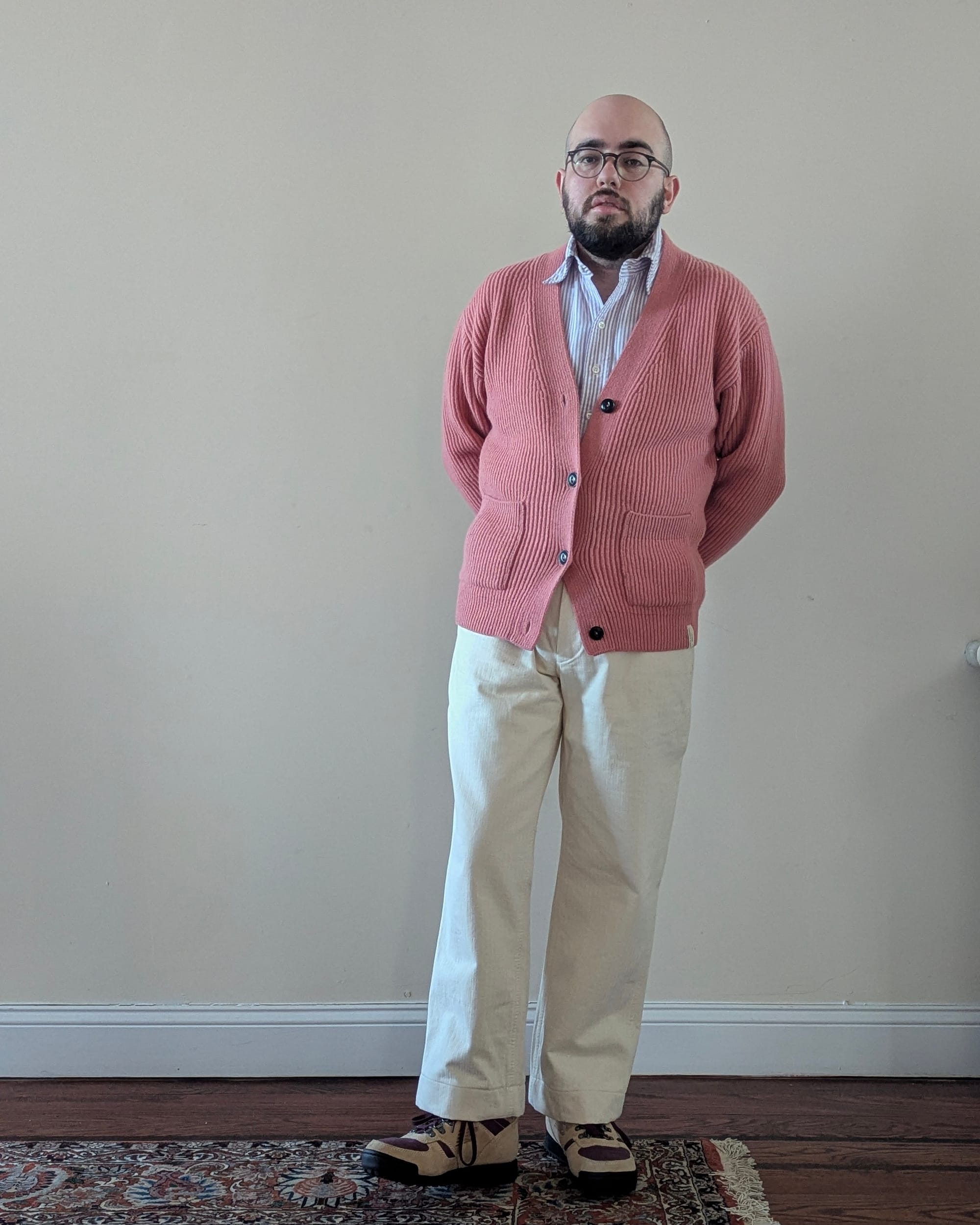 The cardigan, from Merz B. Schwannen, is not on their website anymore, but yeah... It's a super duper soft wool-cashmere blend, it's a fun shade of pink, it's got pockets, it's got my initials embroidered on the back, and it's a little slim and also a little long on my short body. I sized down, I assume it won't feel as slim after a few wears (because that's how knitwear works). And it's not that long, but it's long enough that I can't wear most of my jackets over it.