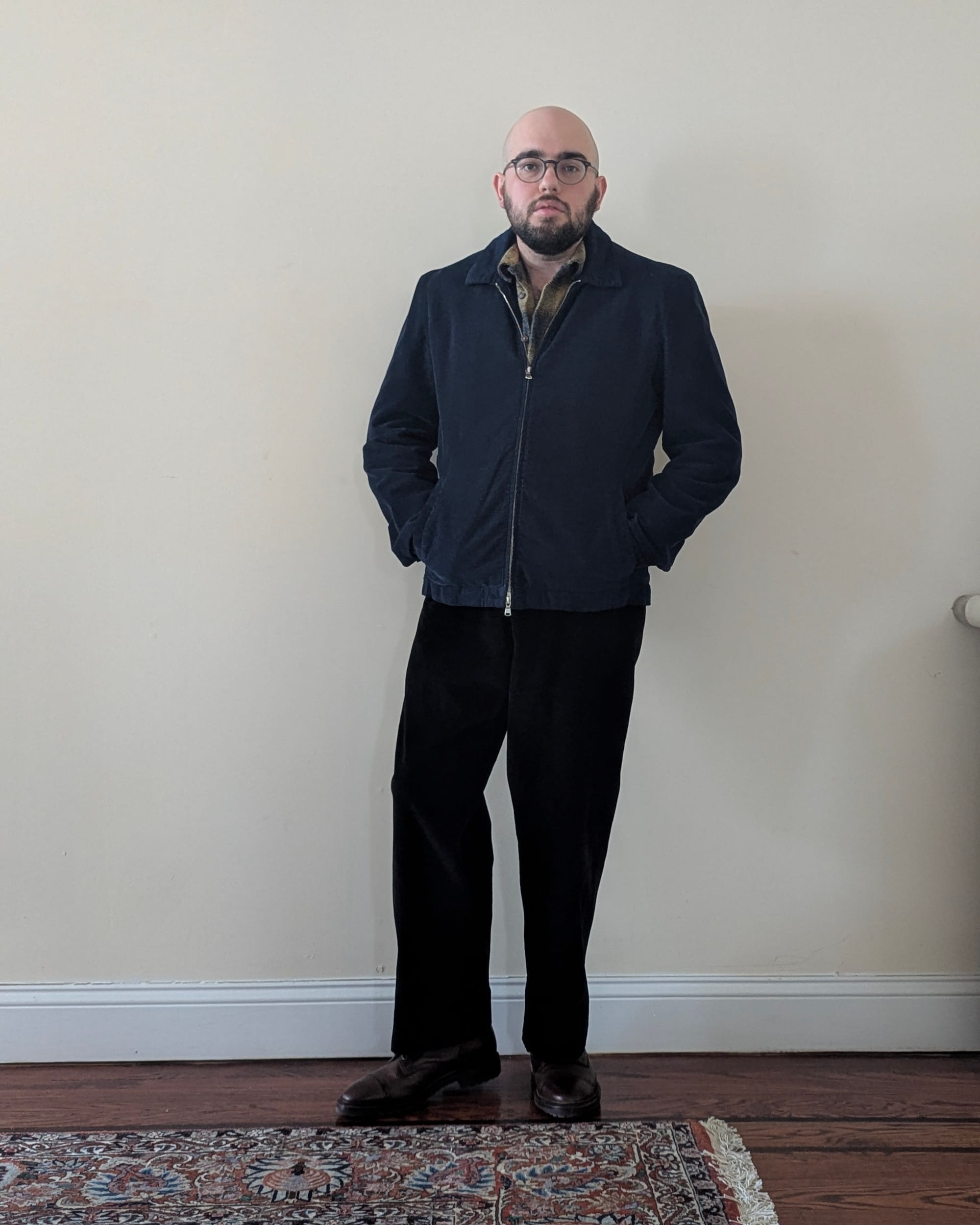 I've wanted a very basic blouson for a long time. Sunspel comes along with one that's simple, but does everything right. Soft, lightweight corduroy. Solid navy. Good collar, good pockets. Double zipper that actually works. And a slightly extended shoulder that, through some magic, despite not being padded, just looks great, like structured in just the right way. Love it.
