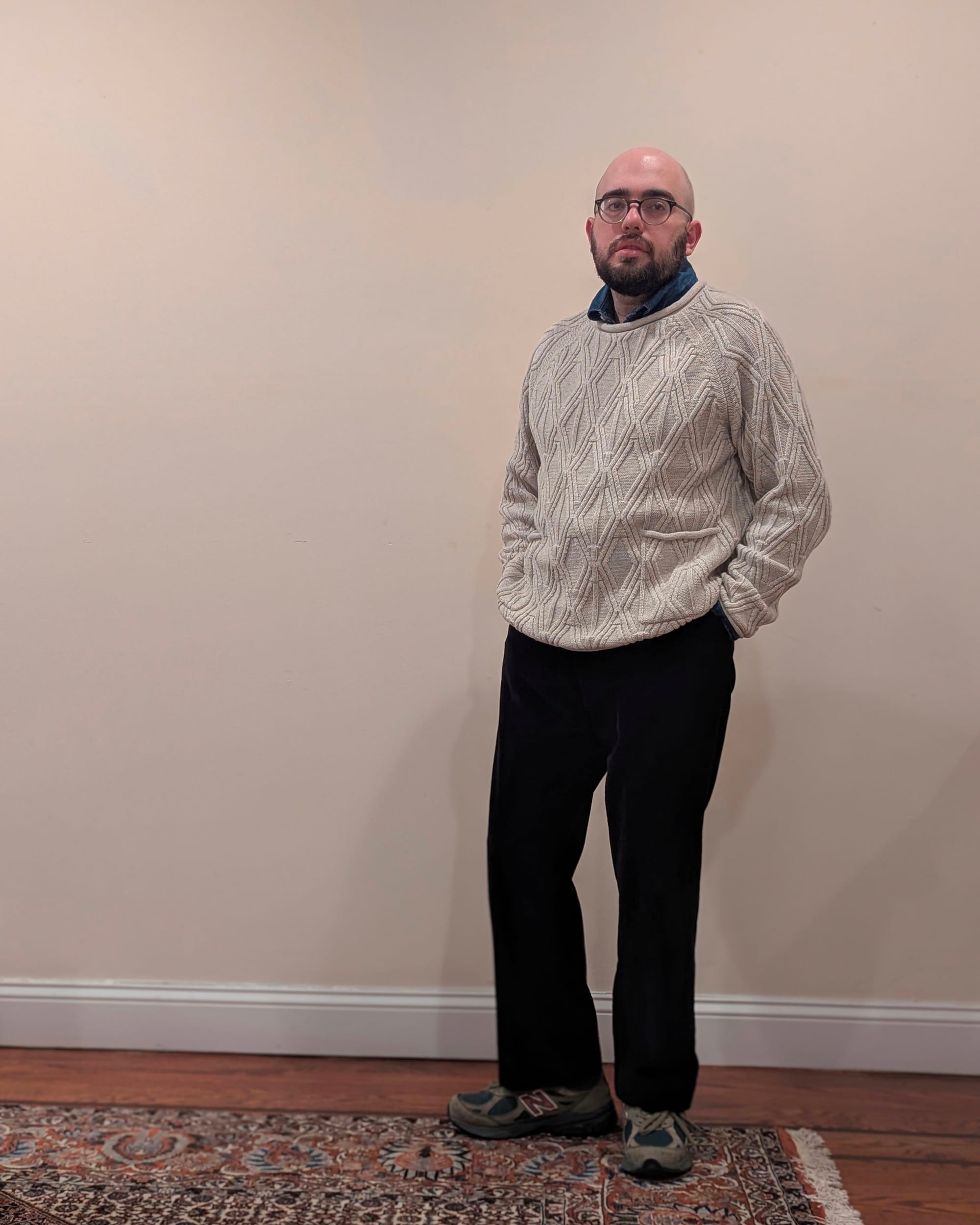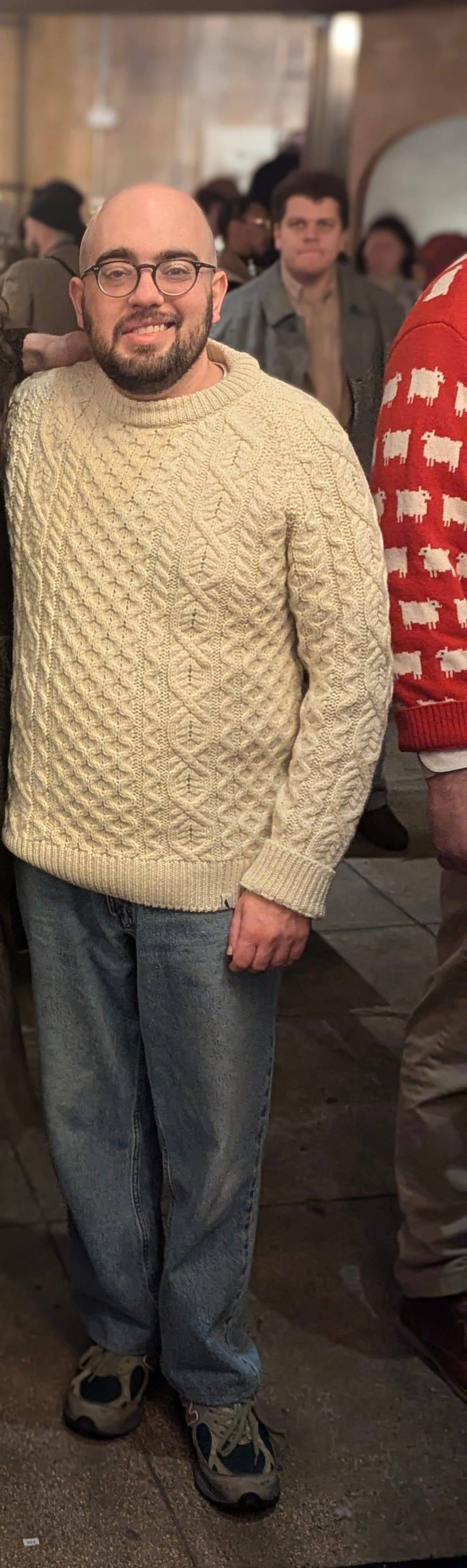 Ugh, these are all really cool sweaters. The aran is from Peregrine, and it's just the perfect aran... for a body other than mine. It's a quality product that will probably last me decades, as lont as the ribbing still functions. I use the ribbing to effectively shorten the body, and then it's great. Oh, but also, I had to size up for the neck to fit well, but it still doesn't let a collared shirt poke through... Eh. I still love it. But it gets demoted to honorable mention for not being perfect.