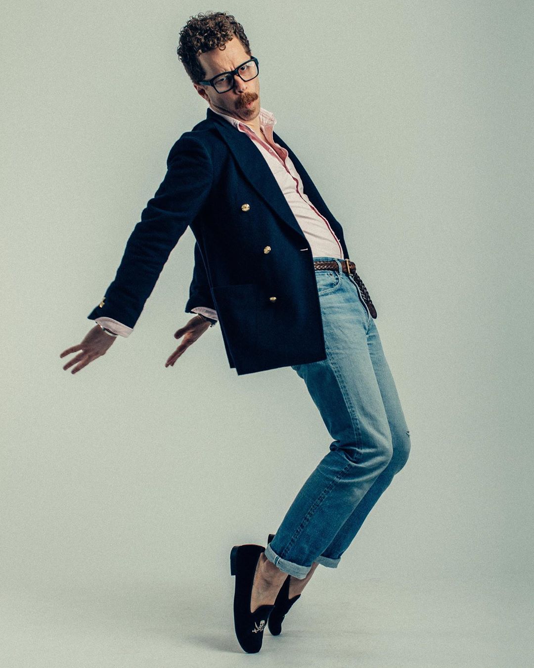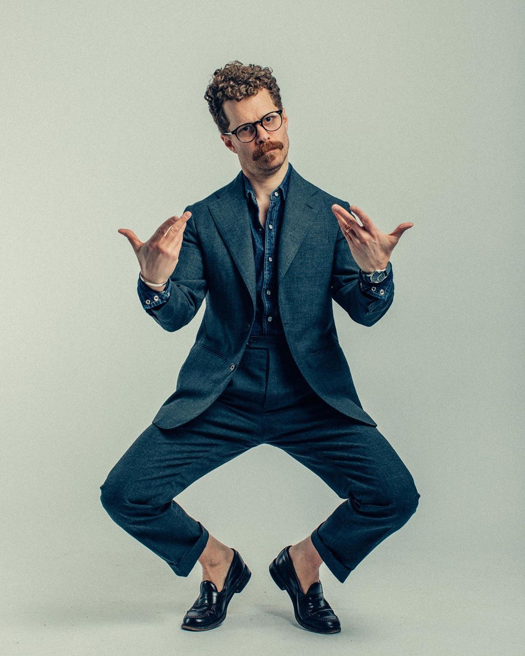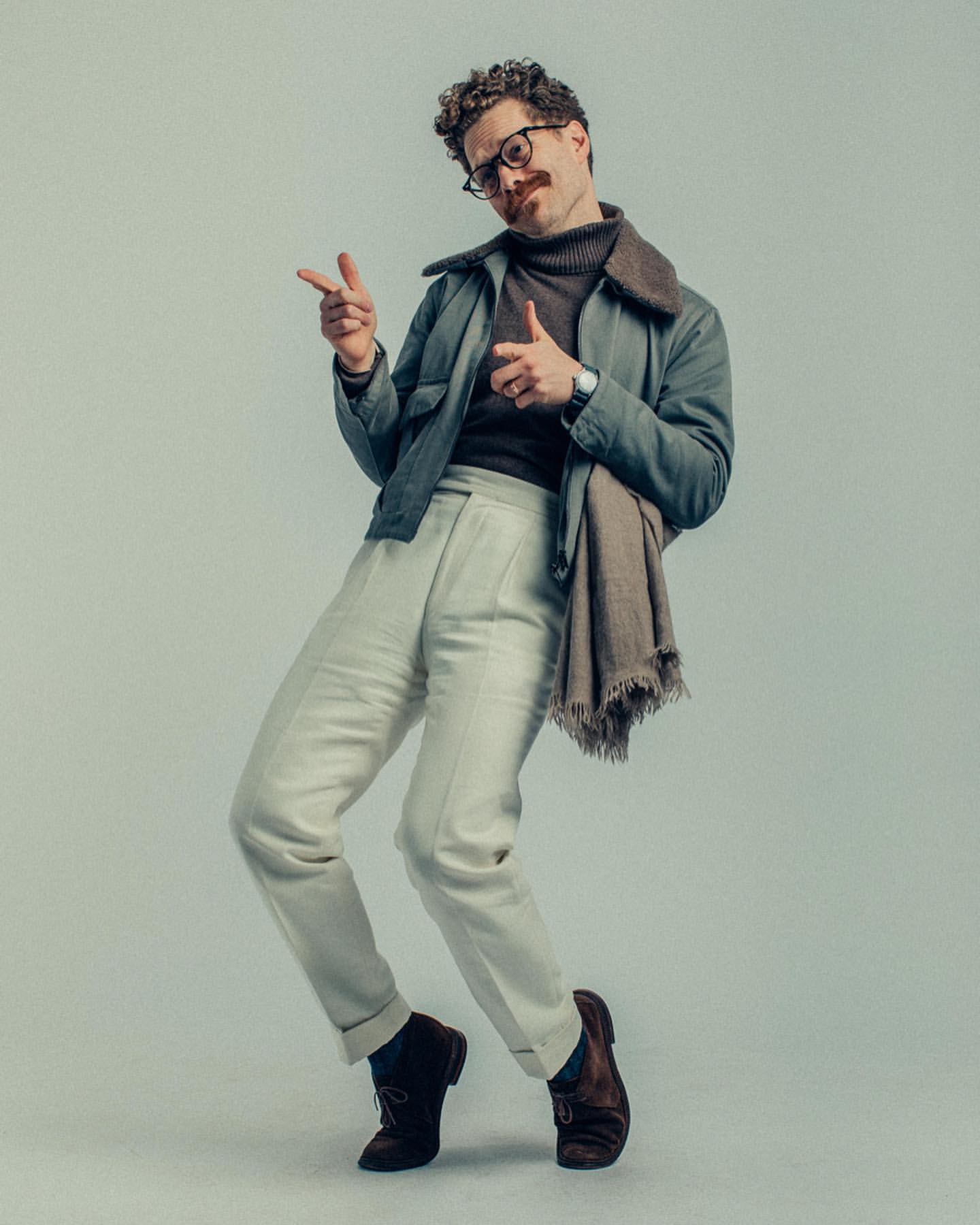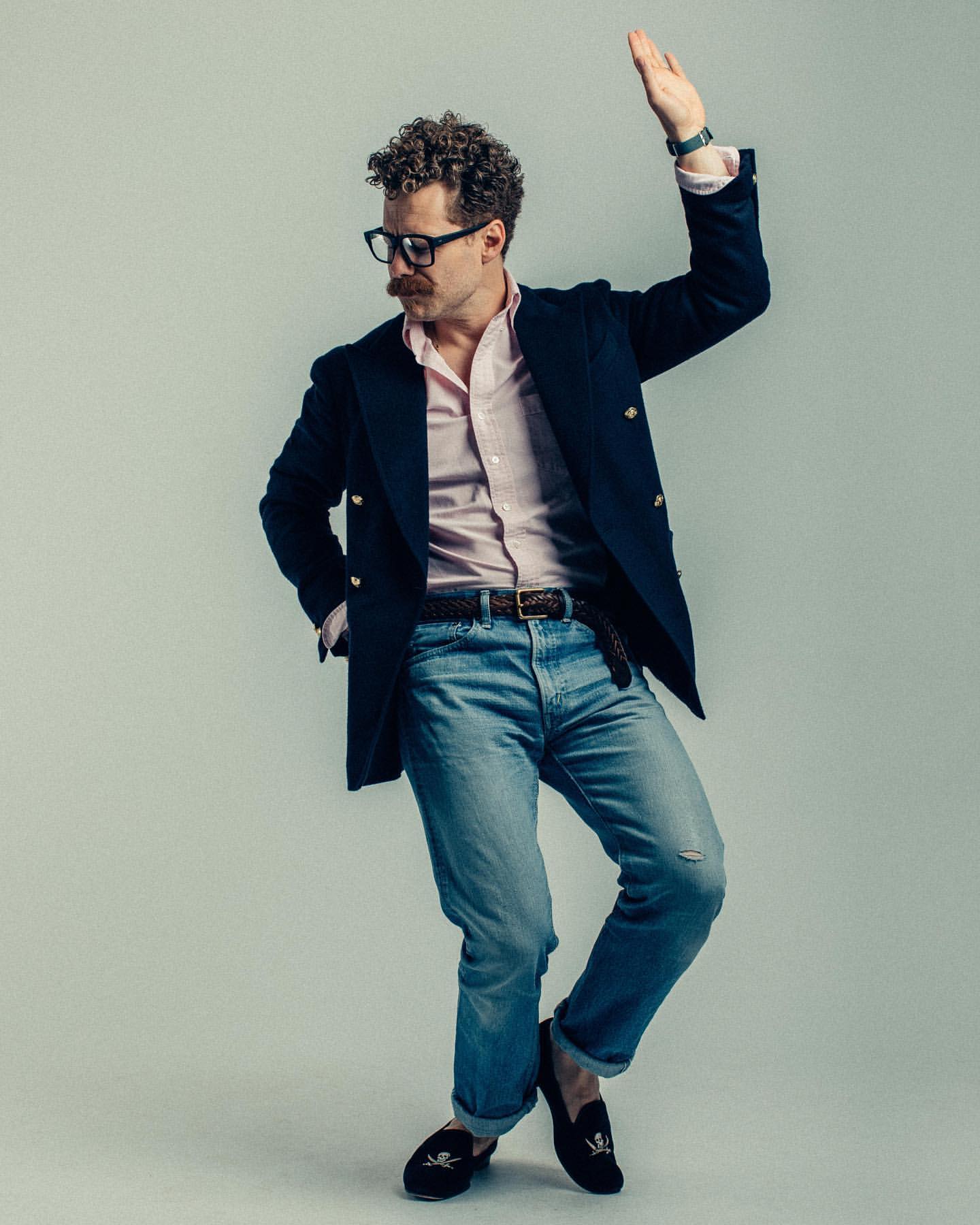 Jamie goes through a range of movements highlighting the drape of his blazers, the flex in his shoes, and the folly of athleisure—you can move in anything, people!