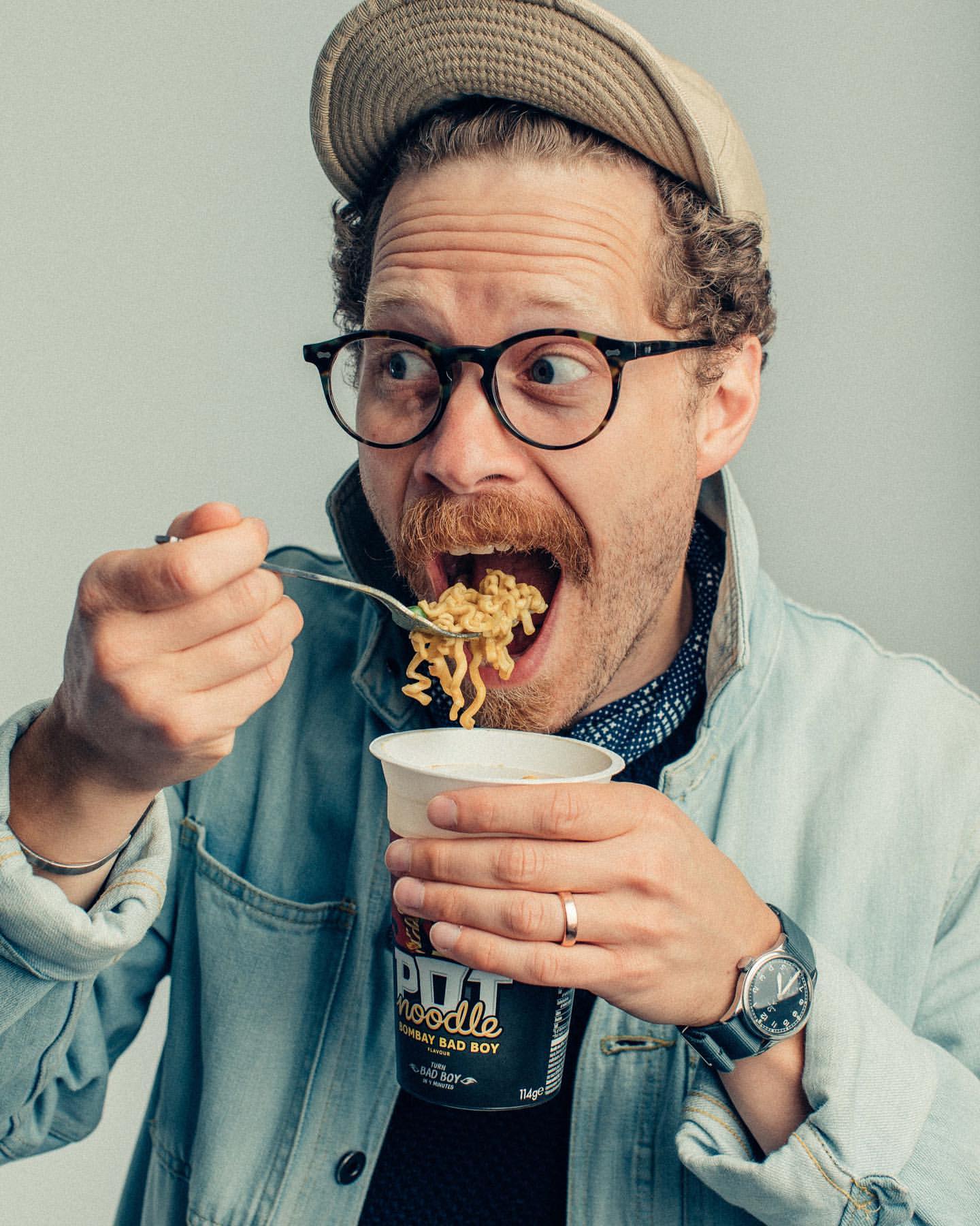 His solution to this lack of client work was to experiment with new lighting techniques, whatever props he had handy, and, as you can tell, some very animated poses. He and his moustache made goofy faces, danced like nobody was shooting, and... ate, and drank.