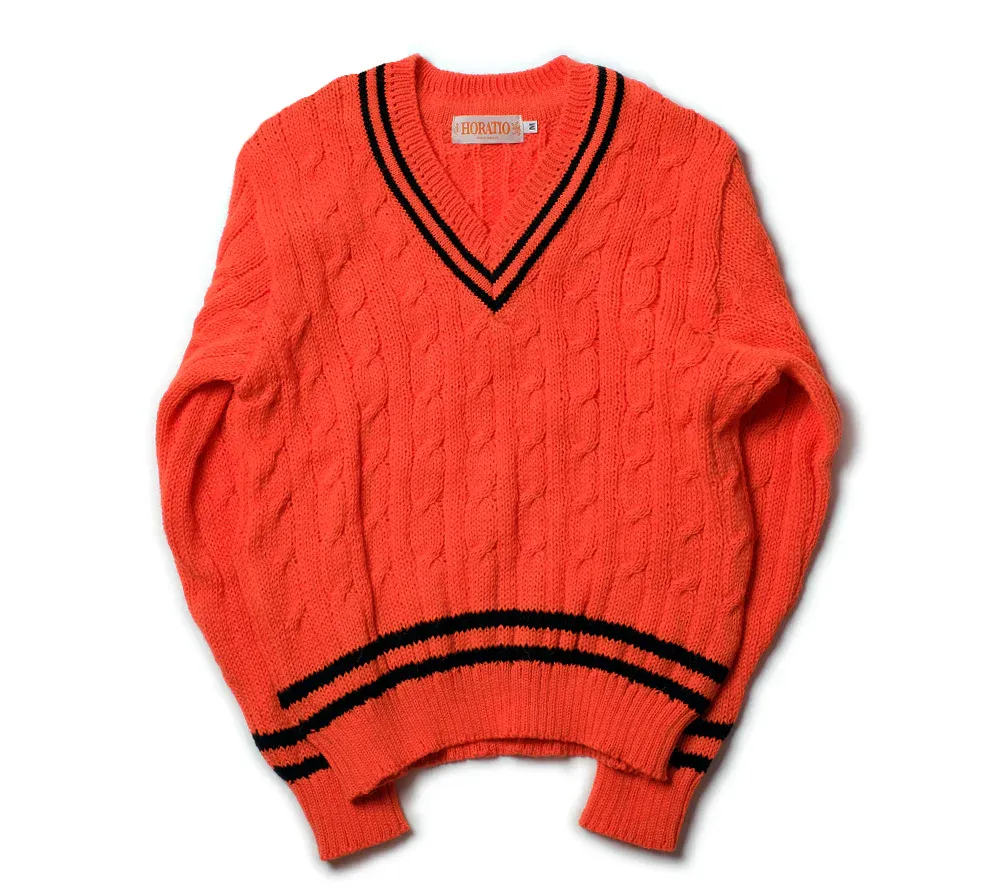 A bright orange cricket sweater is a weird thing to own, but I saw it in this Five Fits With and it's really interesting. I also like Horatio's more reserved-colored cricket sweaters, but the bold colors excite me, so either way.