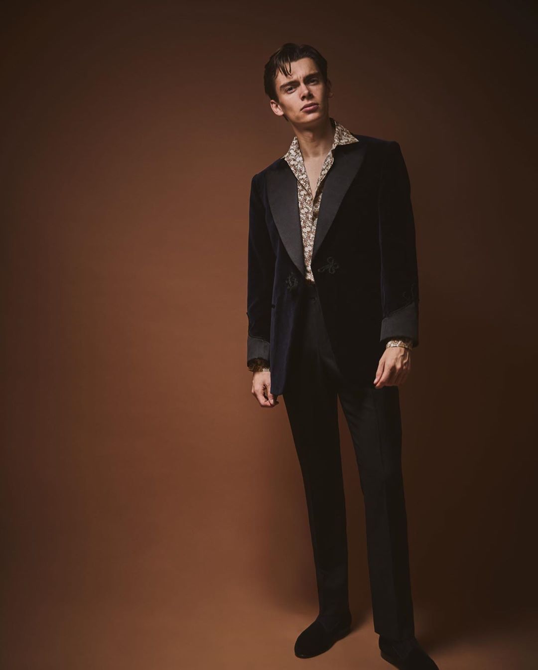 How might you dress this down from a full tuxedo, but up from actual loungewear? A belt or tie can also be very helpful. A shawl collar cardigan can be soft; a silky noragi might flow in the way you want it to. Velvet, again, can work nicely. Your shoes should be slip ons, maybe suede.