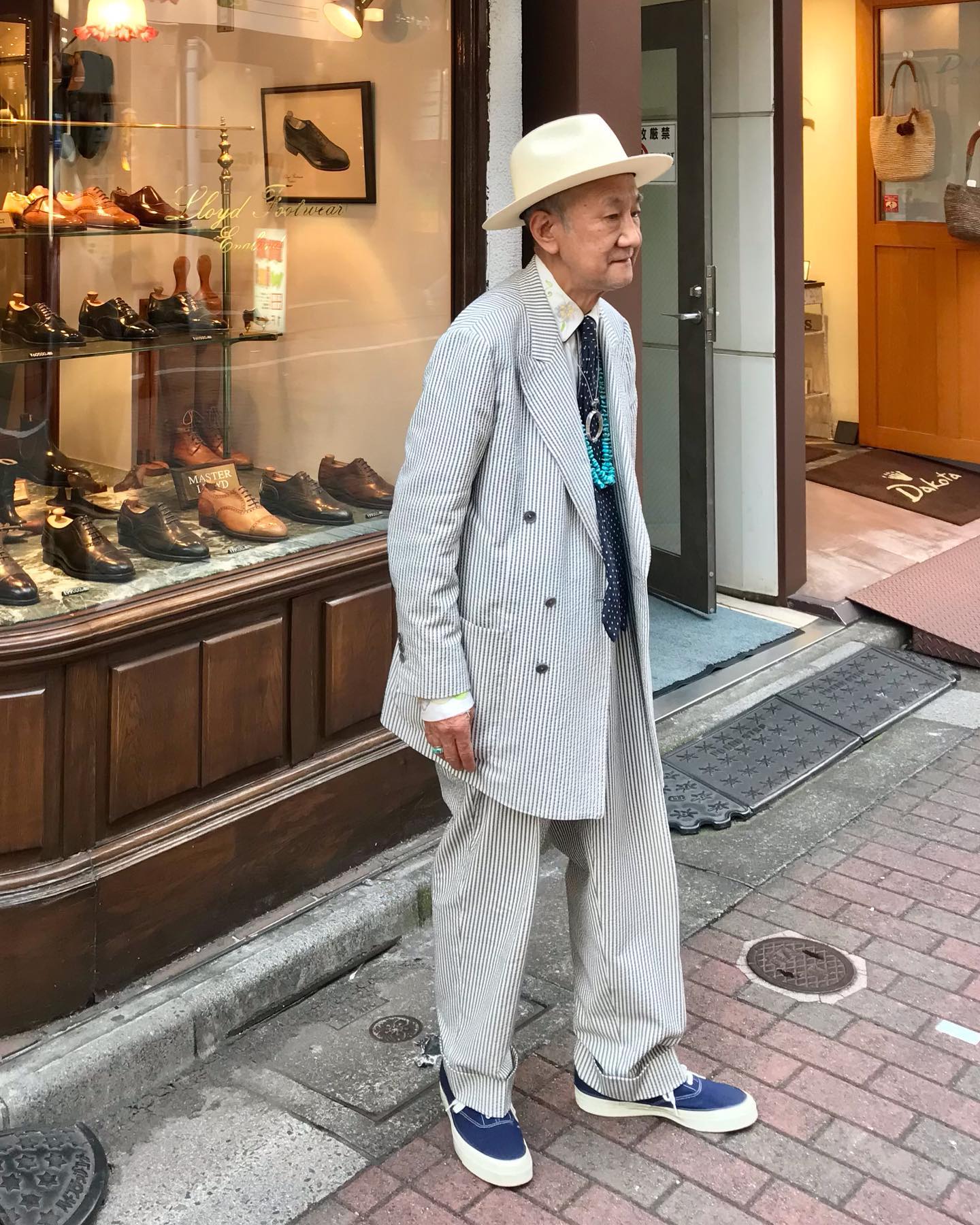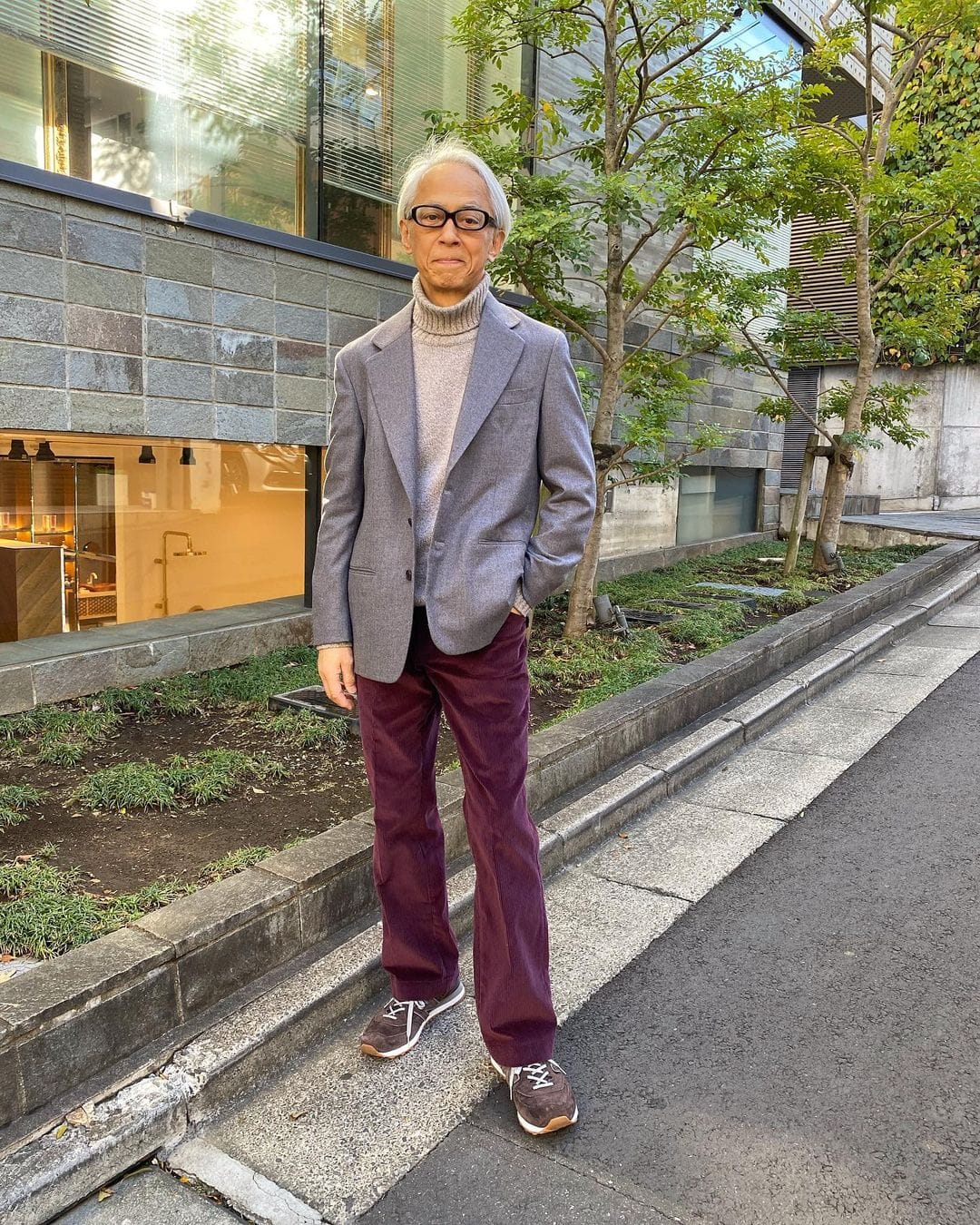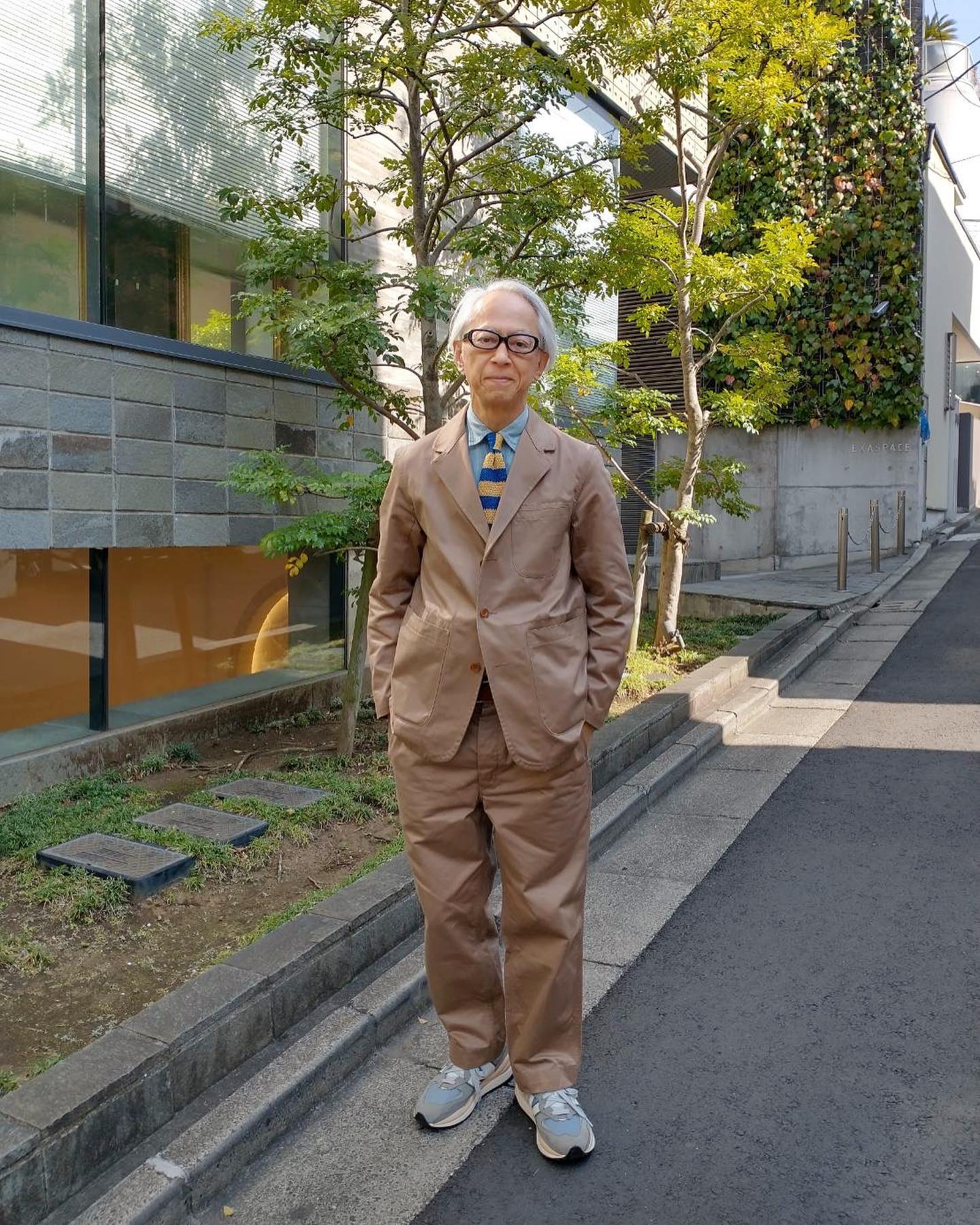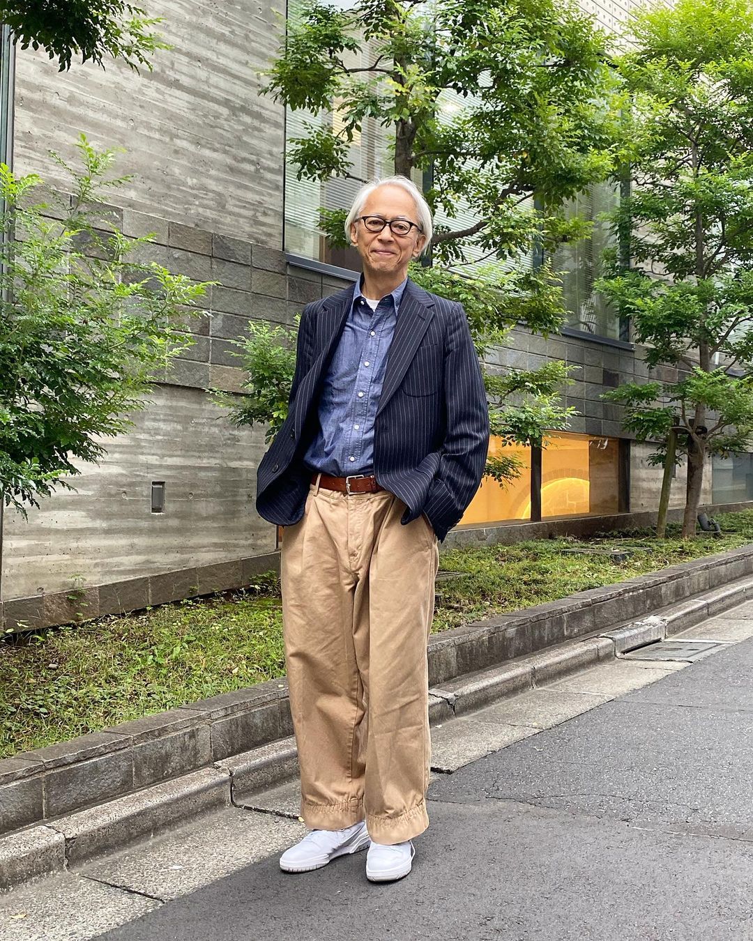 Hirofumi Kurino. Of all the old Japanese men who just don't give a fuck, Kurino-san is my favorite. Low rises and very long jackets give a sort of melted slouchiness. He clearly doesn't mind wrinkles. Could he be any more comfortable? Kurino-san carefully refined this relaxed aesthetic over a long career in menswear. I love it.