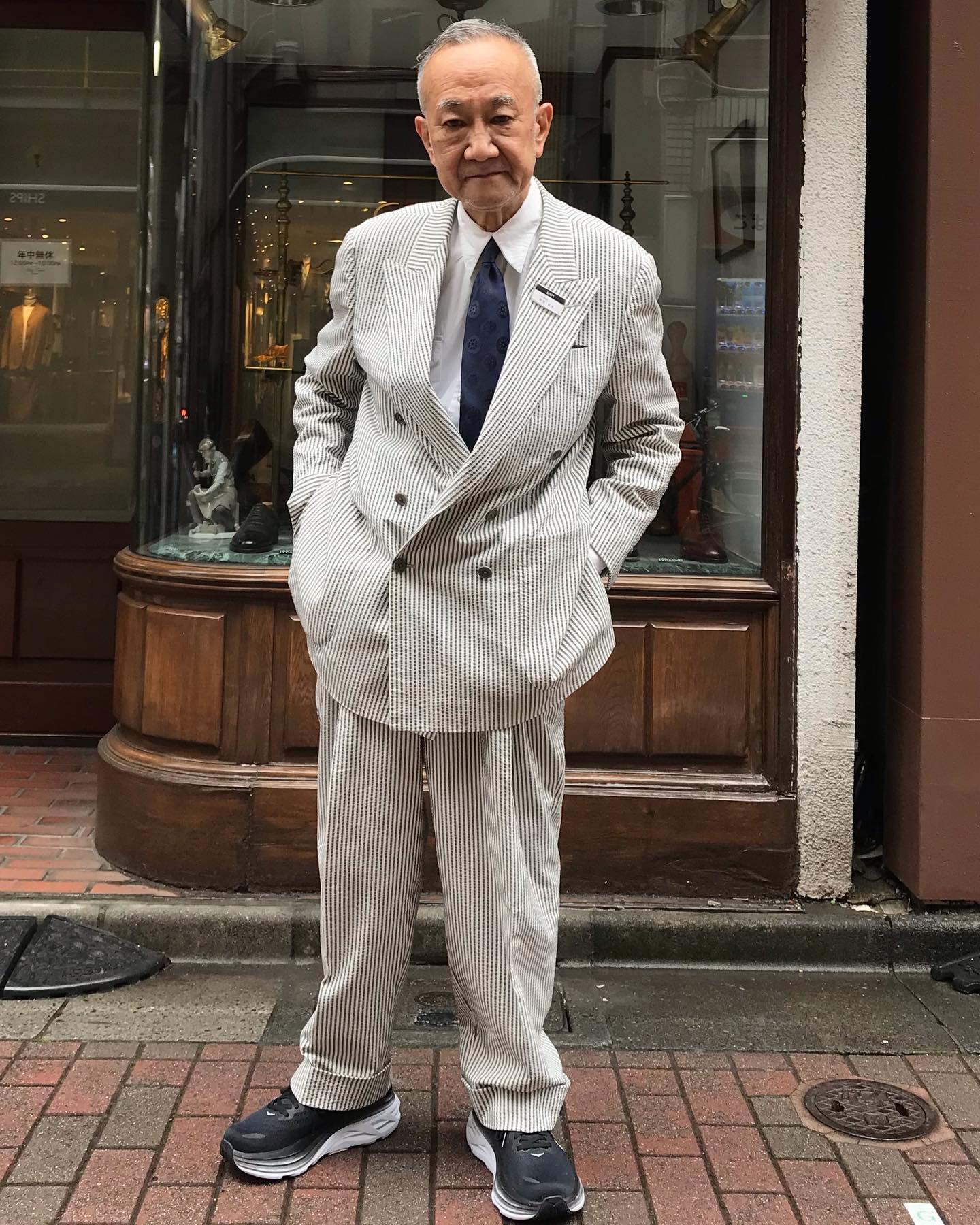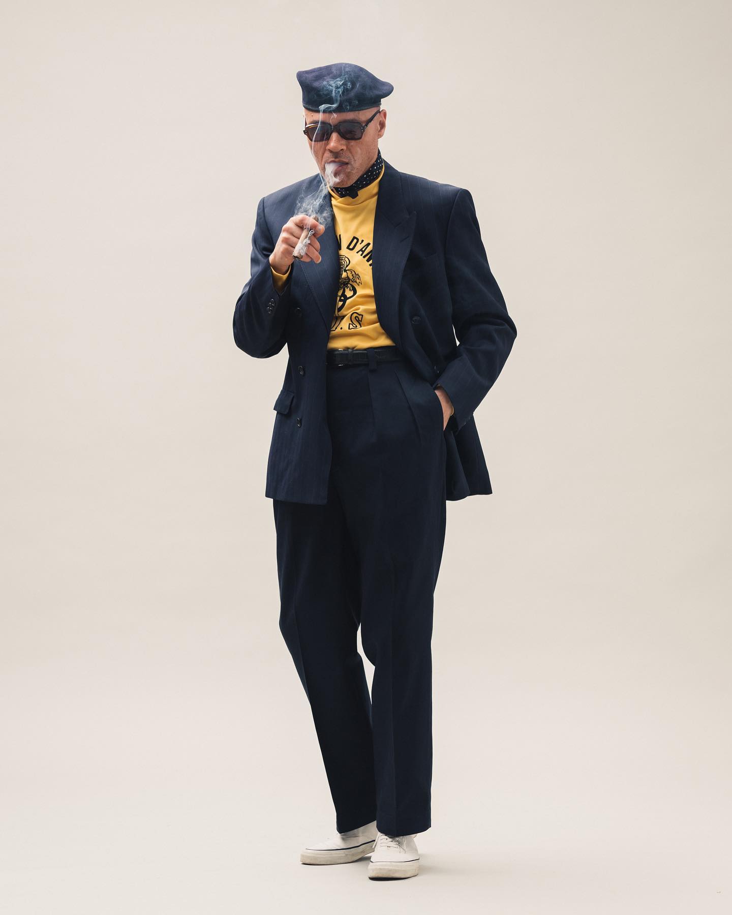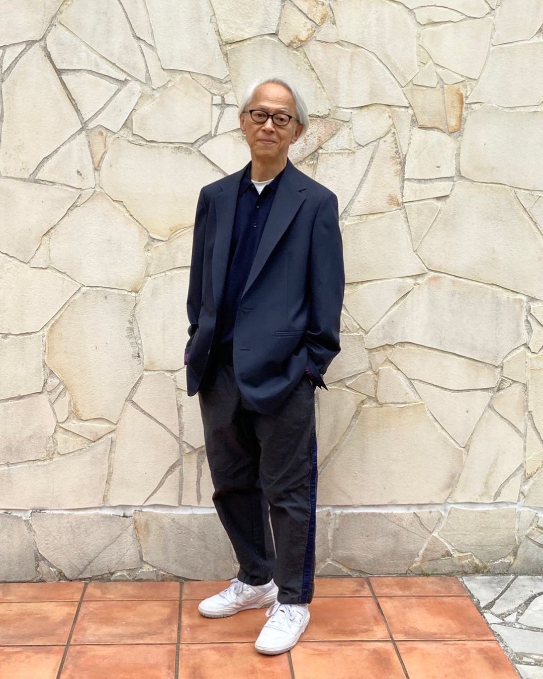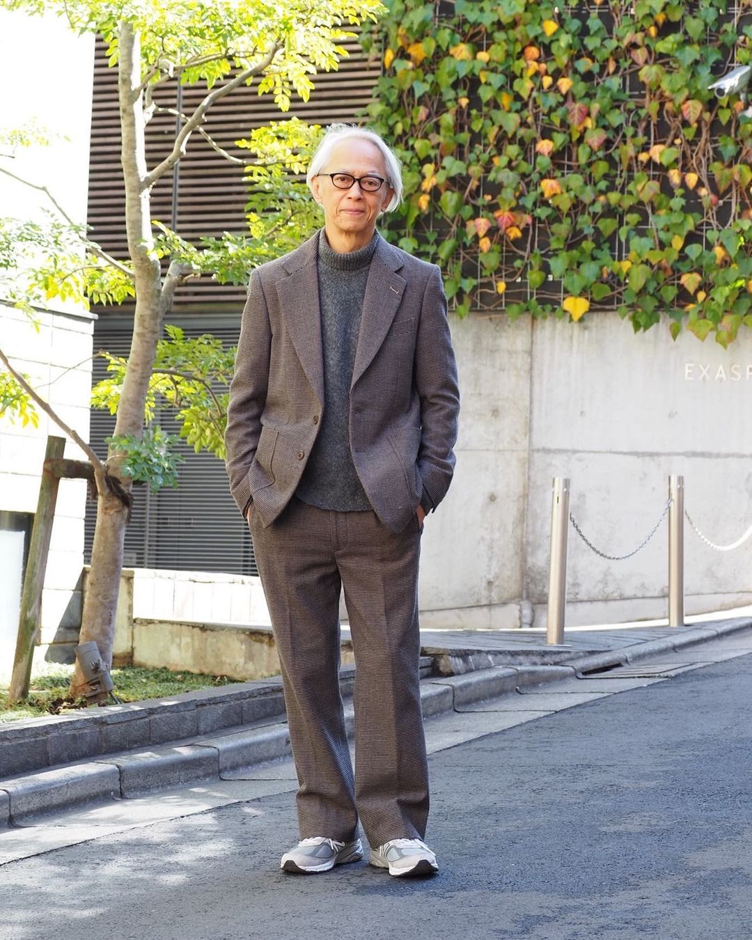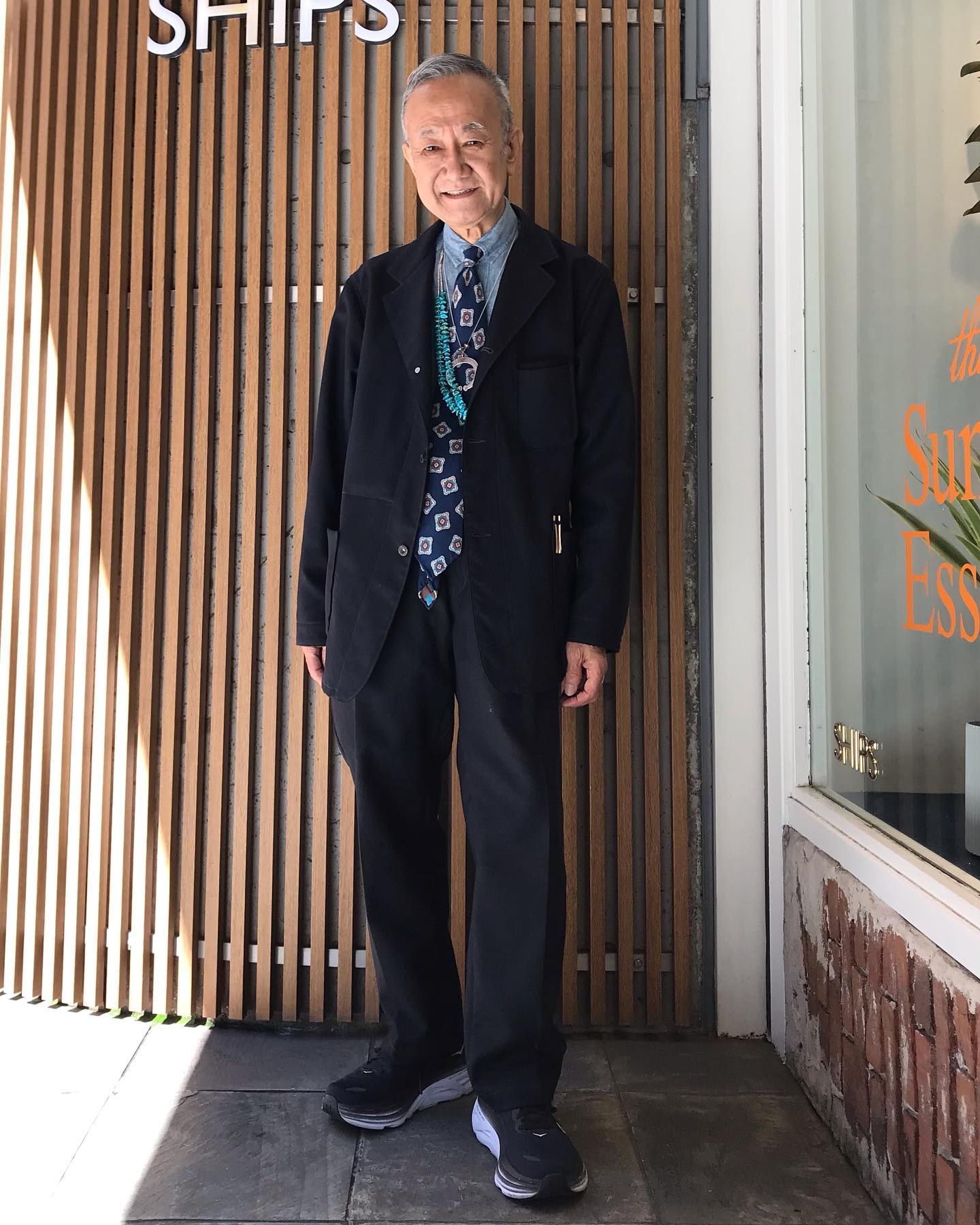 Hirofumi Kurino. Of all the old Japanese men who just don't give a fuck, Kurino-san is my favorite. Low rises and very long jackets give a sort of melted slouchiness. He clearly doesn't mind wrinkles. Could he be any more comfortable? Kurino-san carefully refined this relaxed aesthetic over a long career in menswear. I love it.