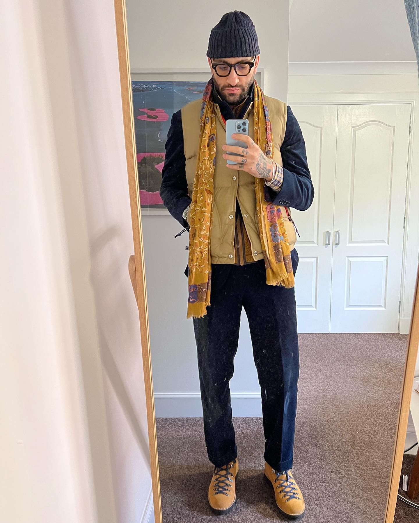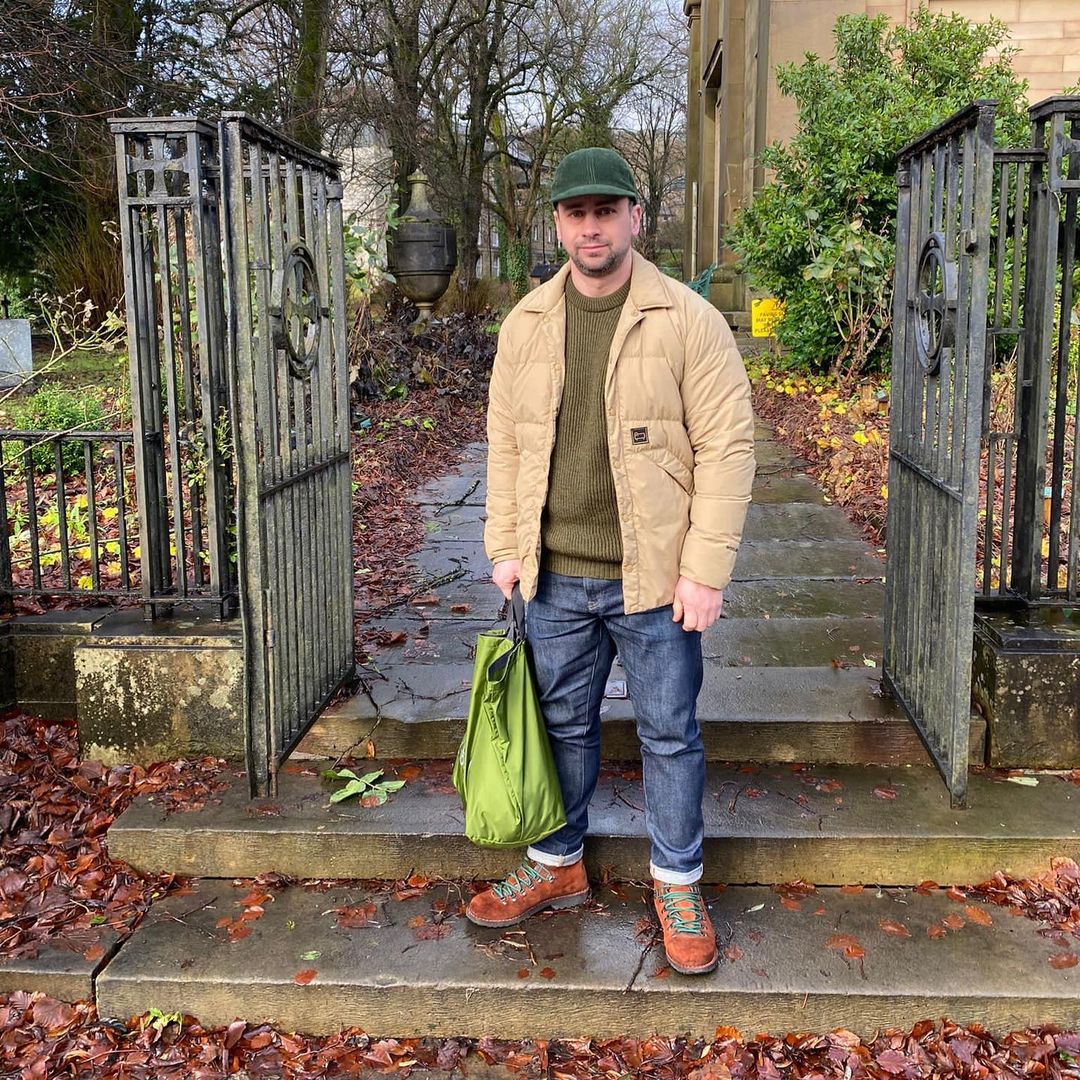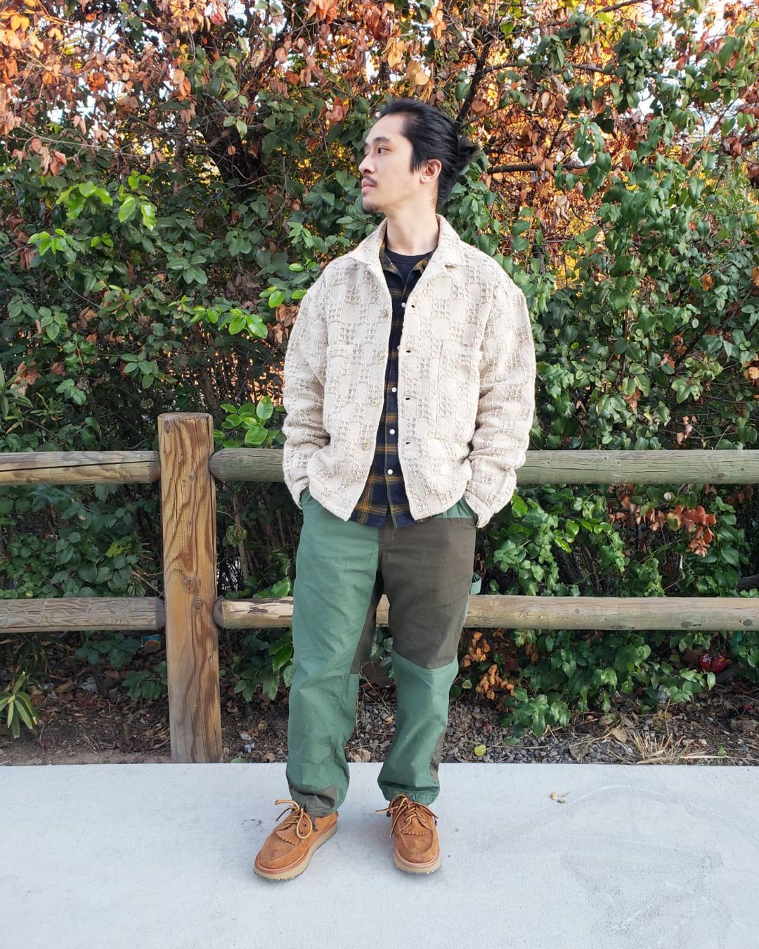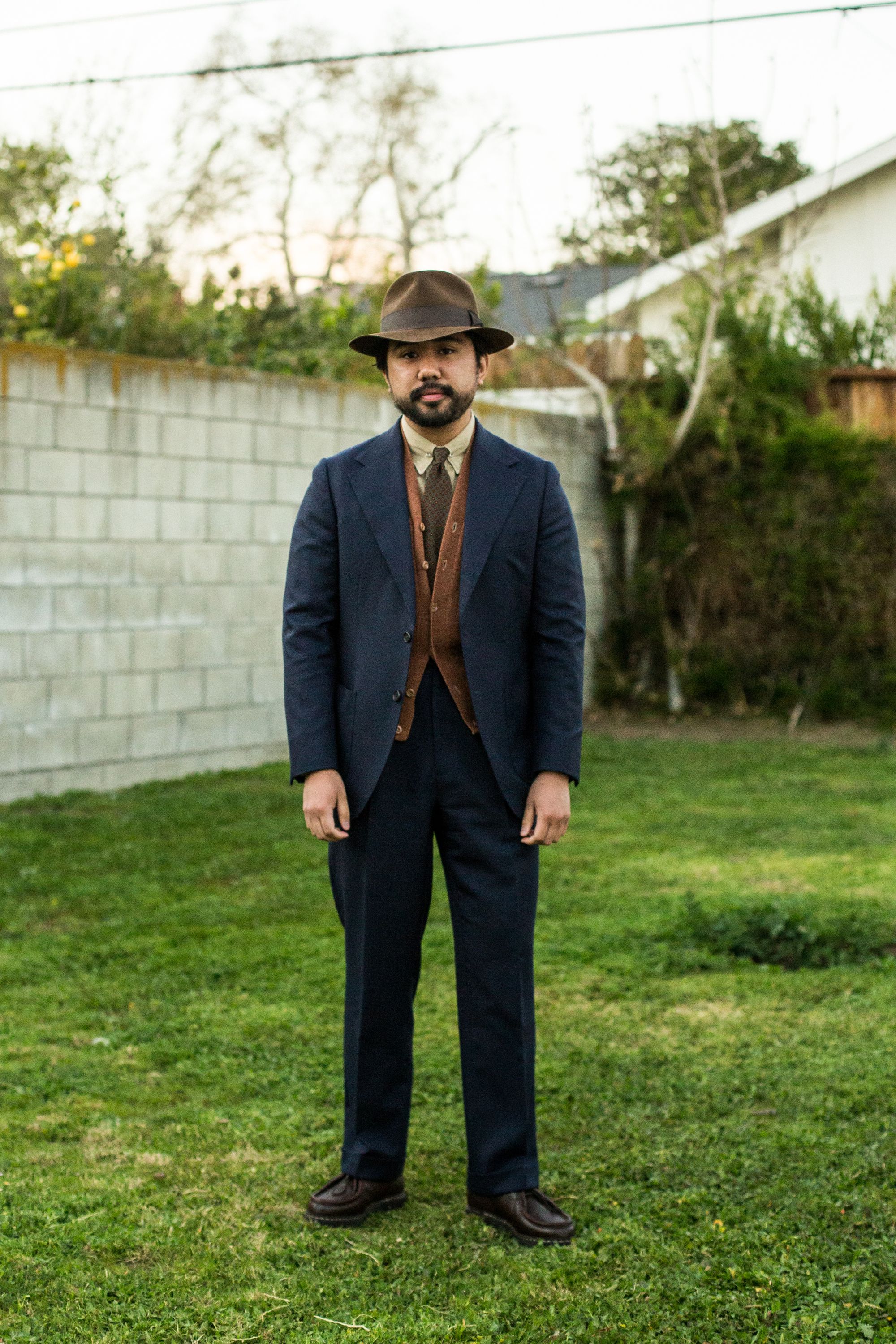 In some proportions, they might still look simple, or even clean, but they still jive with rugged practicality. Leon wears them below with a cotton-looking suit and simple color scheme, and they look clean; he adds a crunchy vest layer, and they seem even more at home, like he could go for a hike through... the nearest city park, at least, and be right at home.