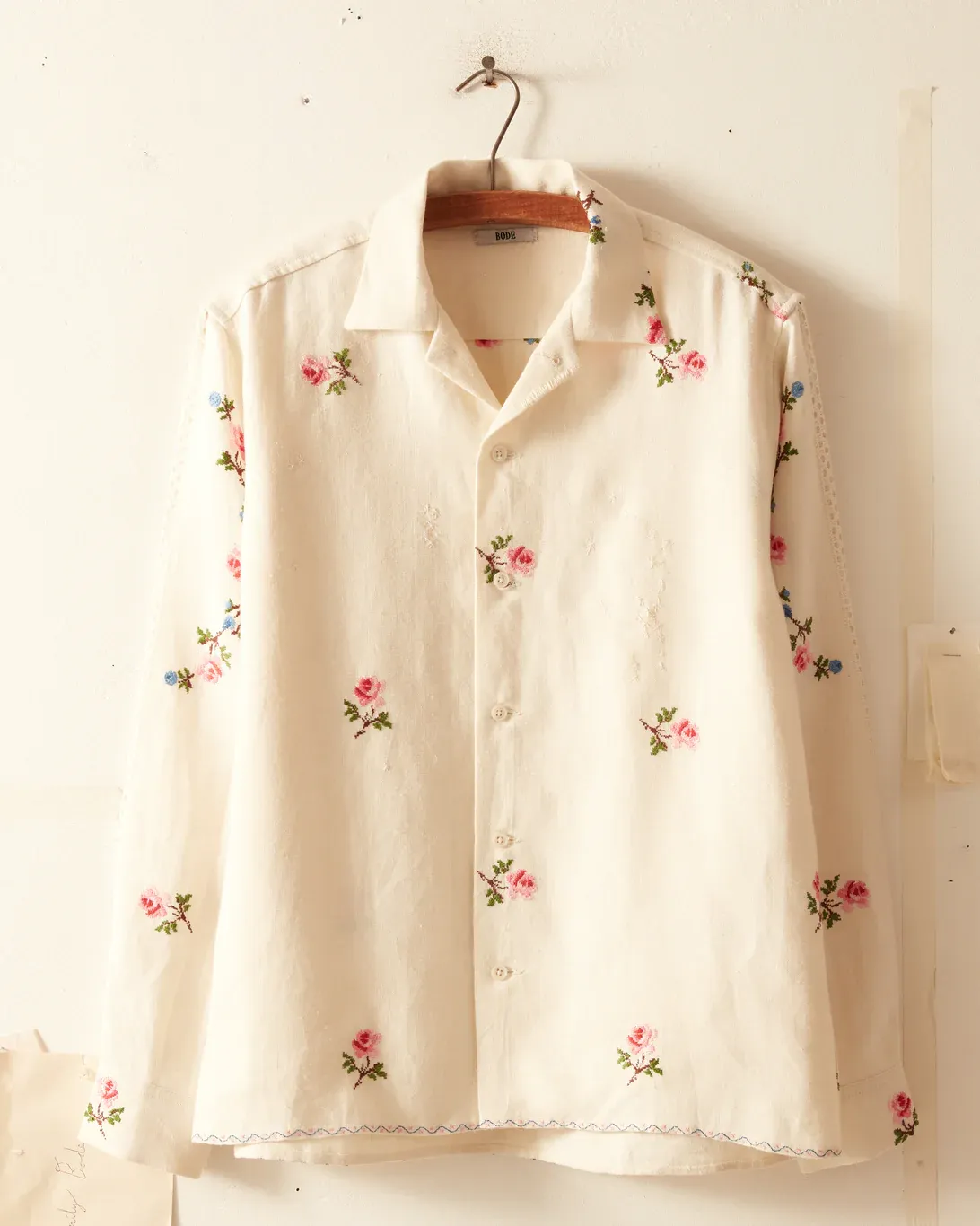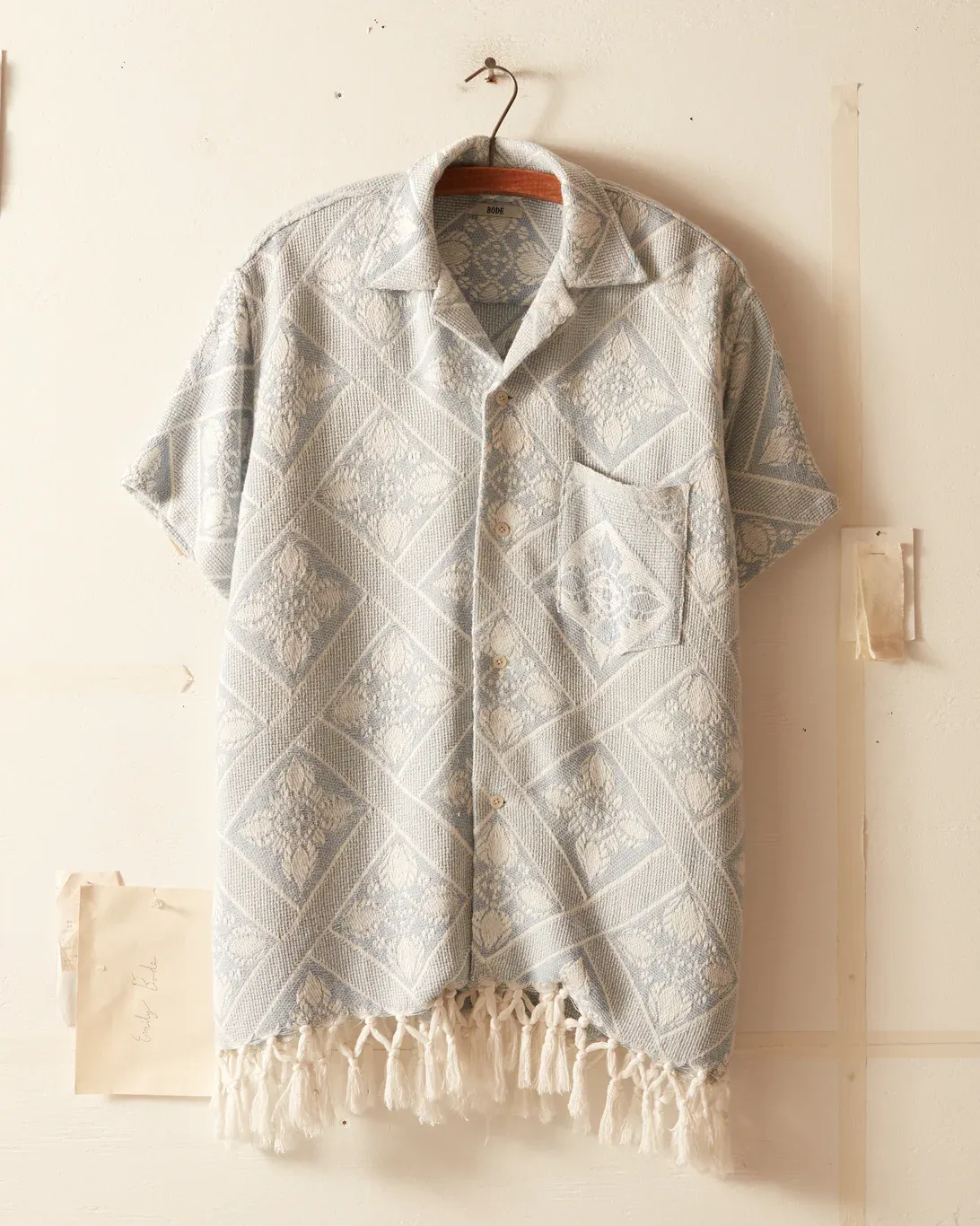 Bode shirts made from old tablecloths and blankets. Fringe and lace.