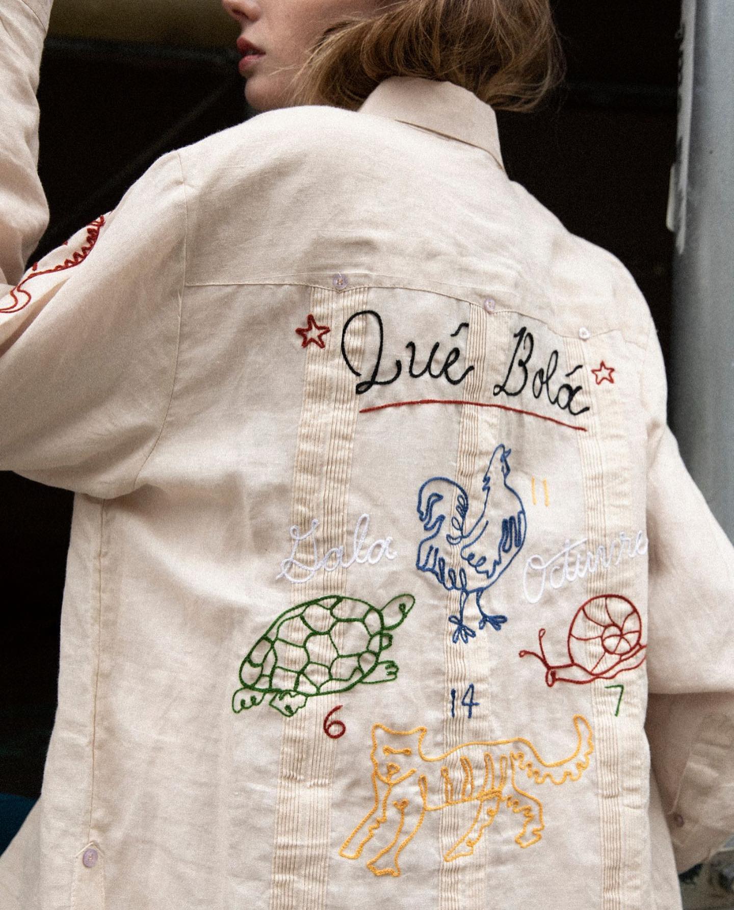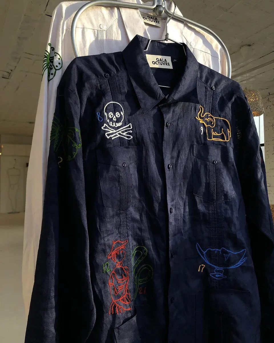 Ana at Gala Octuvre, a first-generation Cuban-American woman, combines custom chain-stitch embroidery with a piece of her own heritage—the linen guayabera.